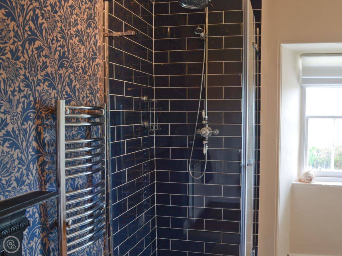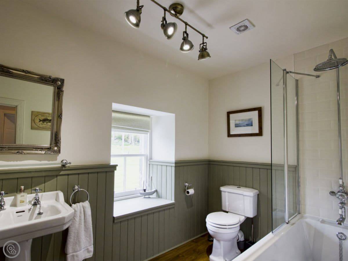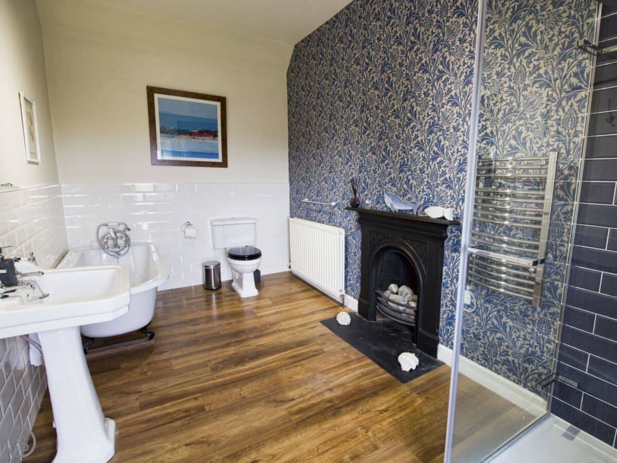 It sleeps ten people. Five bedrooms, four bathrooms. Everything's upstairs apart from one ground floor wet room. Two of the bedrooms are really large, one with a four-poster and one with a sleigh bed, and they both have their own bathrooms. The other three rooms share two more bathrooms.