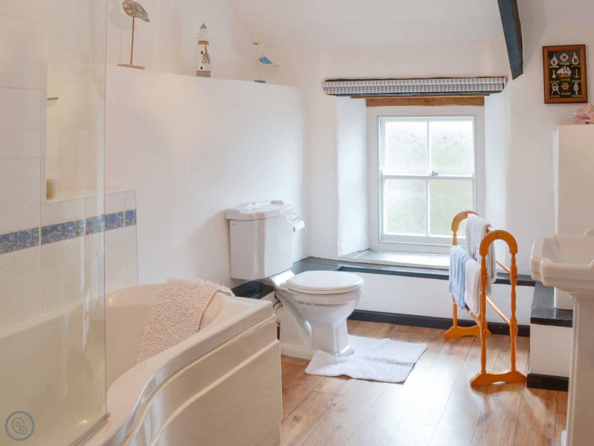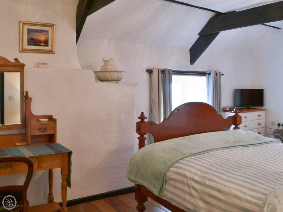 It's for two people. One bedroom, one bathroom with a shower. It's got a 4 Star rating. It's clean and comfortable. The ceilings are beamed and the floors downstairs are slate. There's a woodburning stove if you need it.
