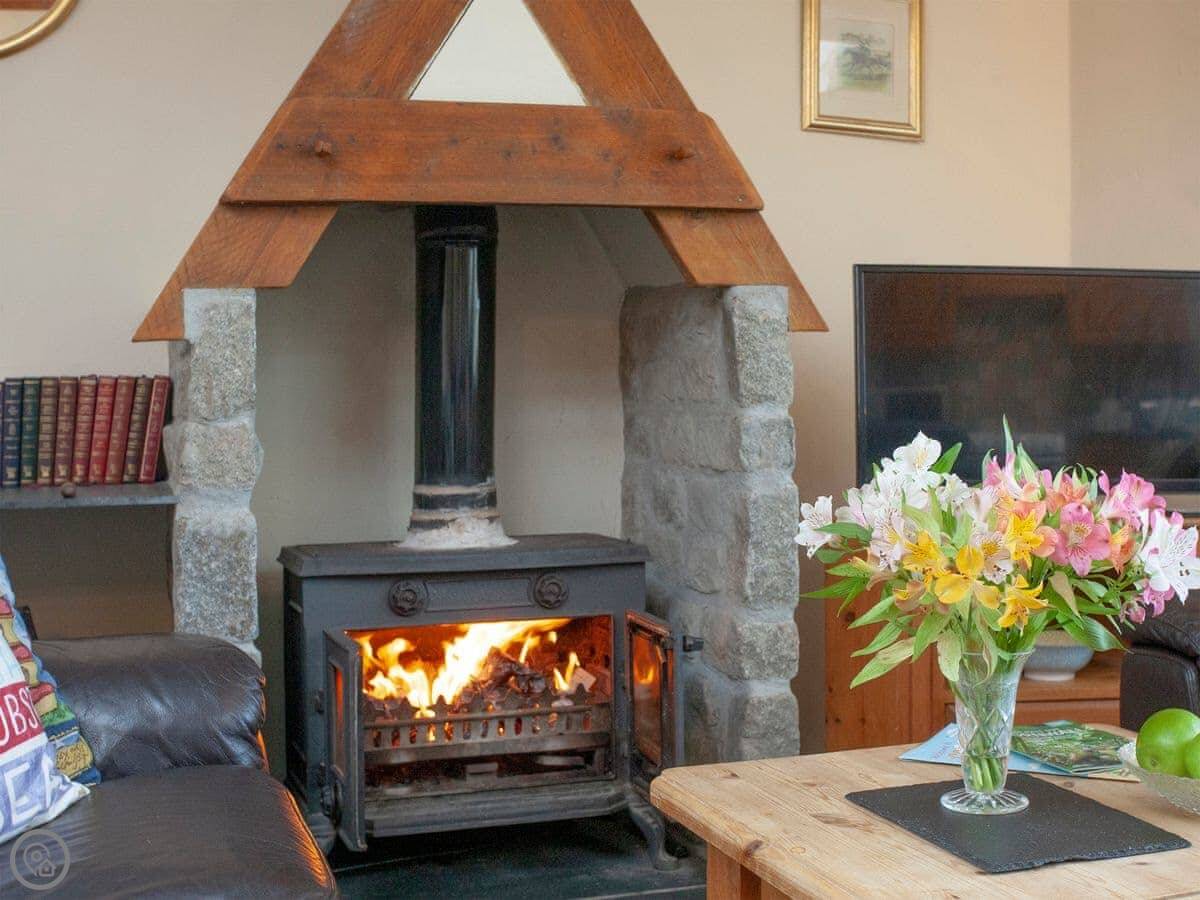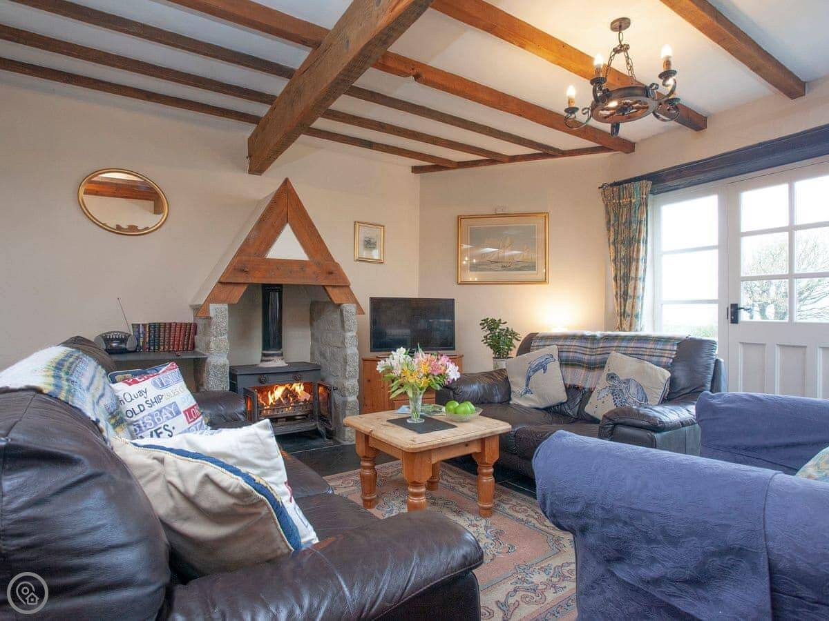 It sleeps six, with three bedrooms and three bathrooms, so no queues in the morning. It's got a 4 Star rating. The main living area is open plan with a wood burner. The patio gets the sun and you can see the sea from it.