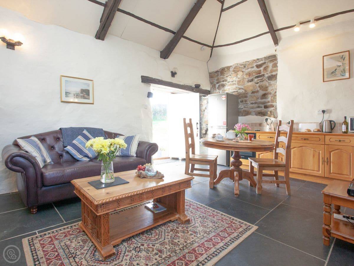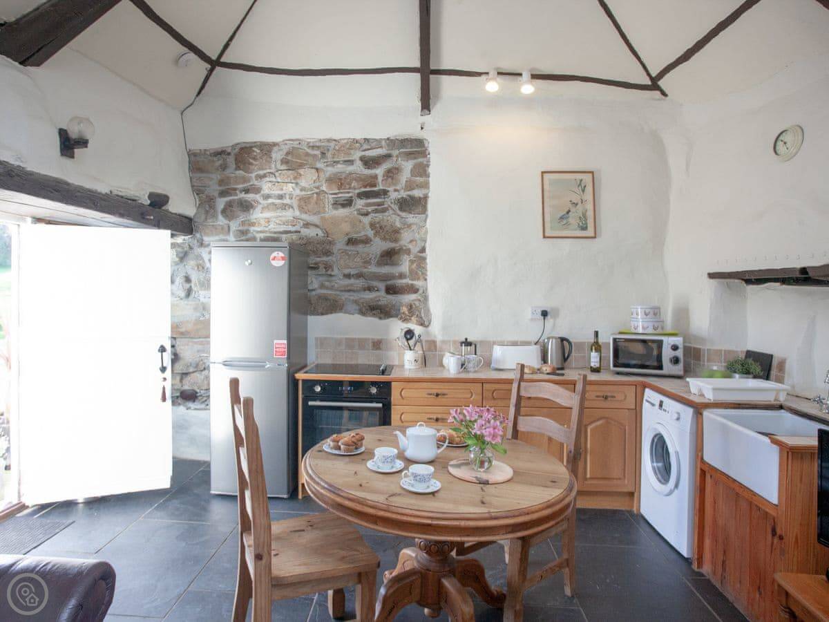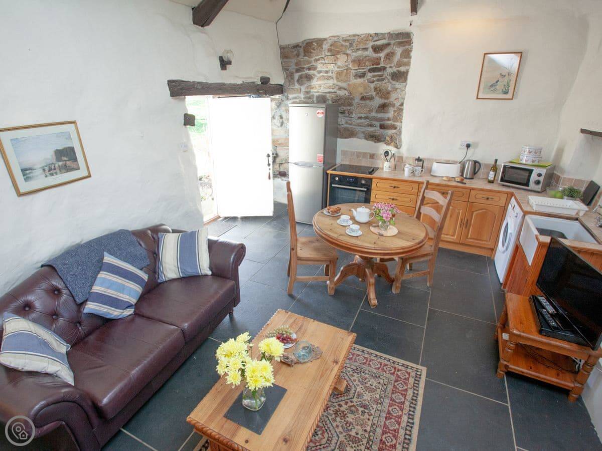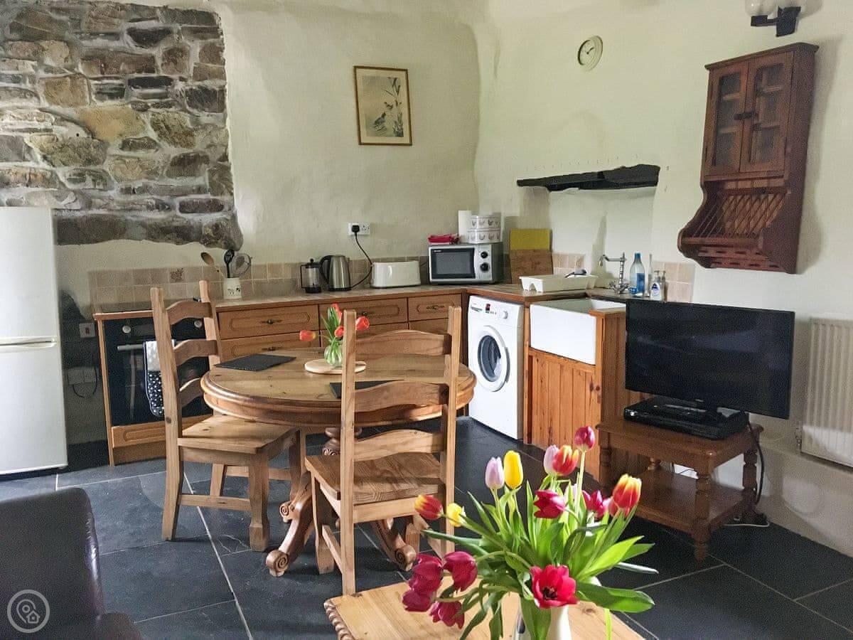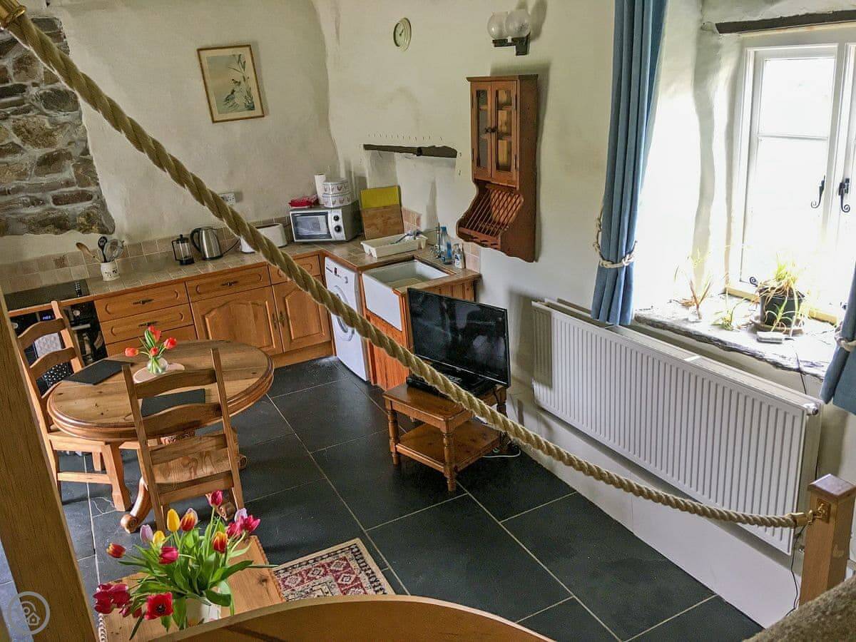 It's open-plan downstairs. Kitchen, sofa, table all in one room. There's a wood burner. We supply the first bag of logs. The WiFi usually works. You can park right outside.