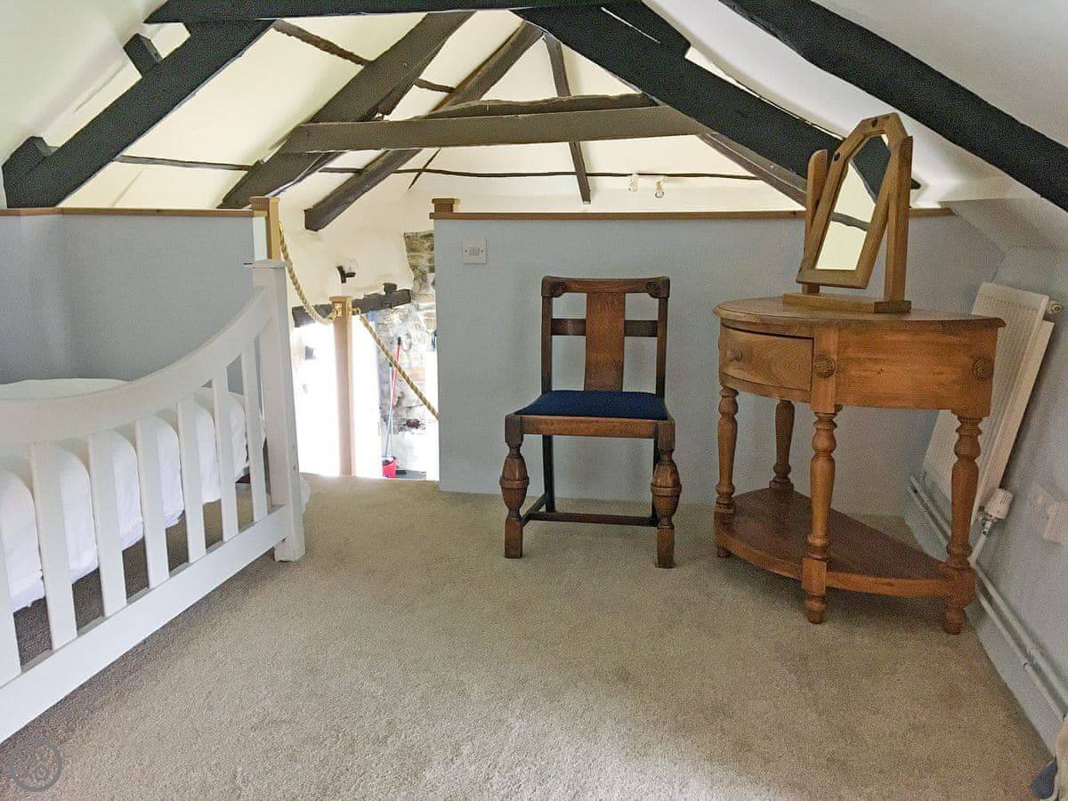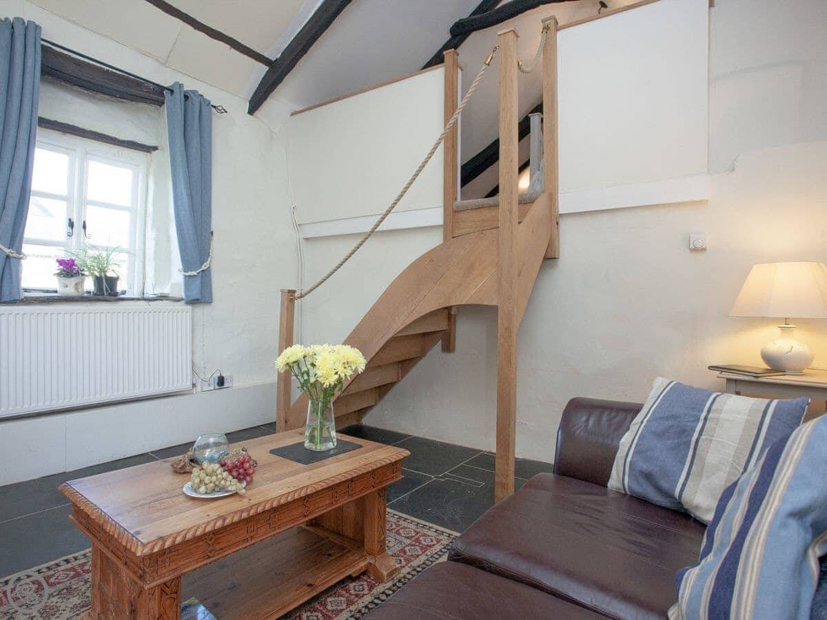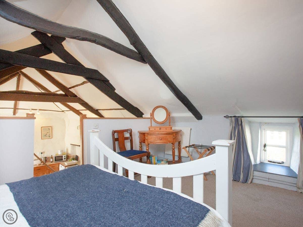 It's a place for two people. One bedroom upstairs, bathroom down. It's got a 4 Star rating. It's clean and tidy, and we've tried to keep it cosy. The bed is up in a galleried bit above the living room, so the ceiling up there is lower. The stairs up to it are more like a ladder, really. You have to mind your head.