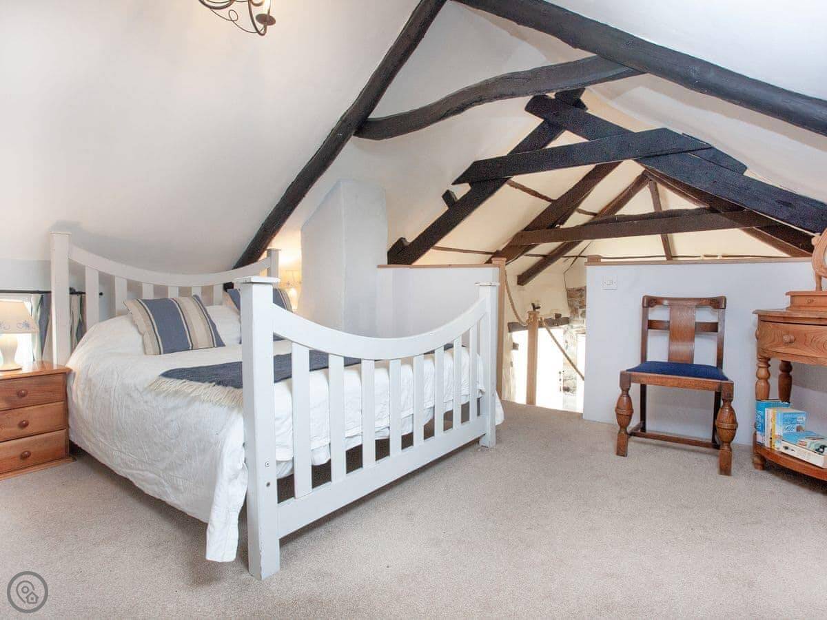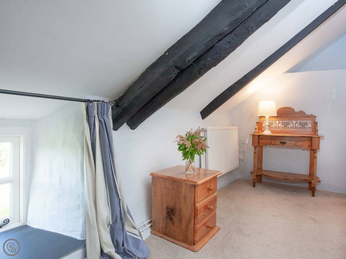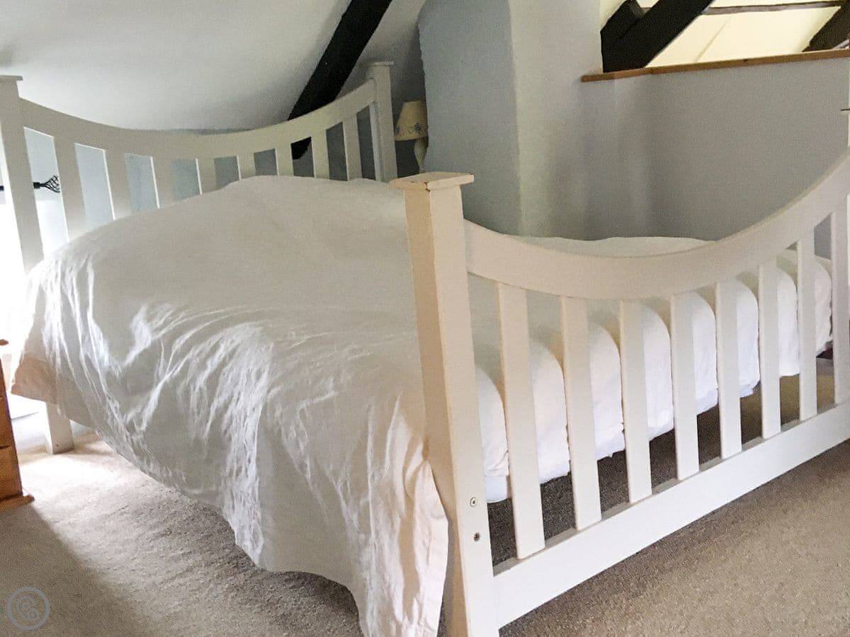 It's a place for two people. One bedroom upstairs, bathroom down. It's got a 4 Star rating. It's clean and tidy, and we've tried to keep it cosy. The bed is up in a galleried bit above the living room, so the ceiling up there is lower. The stairs up to it are more like a ladder, really. You have to mind your head.