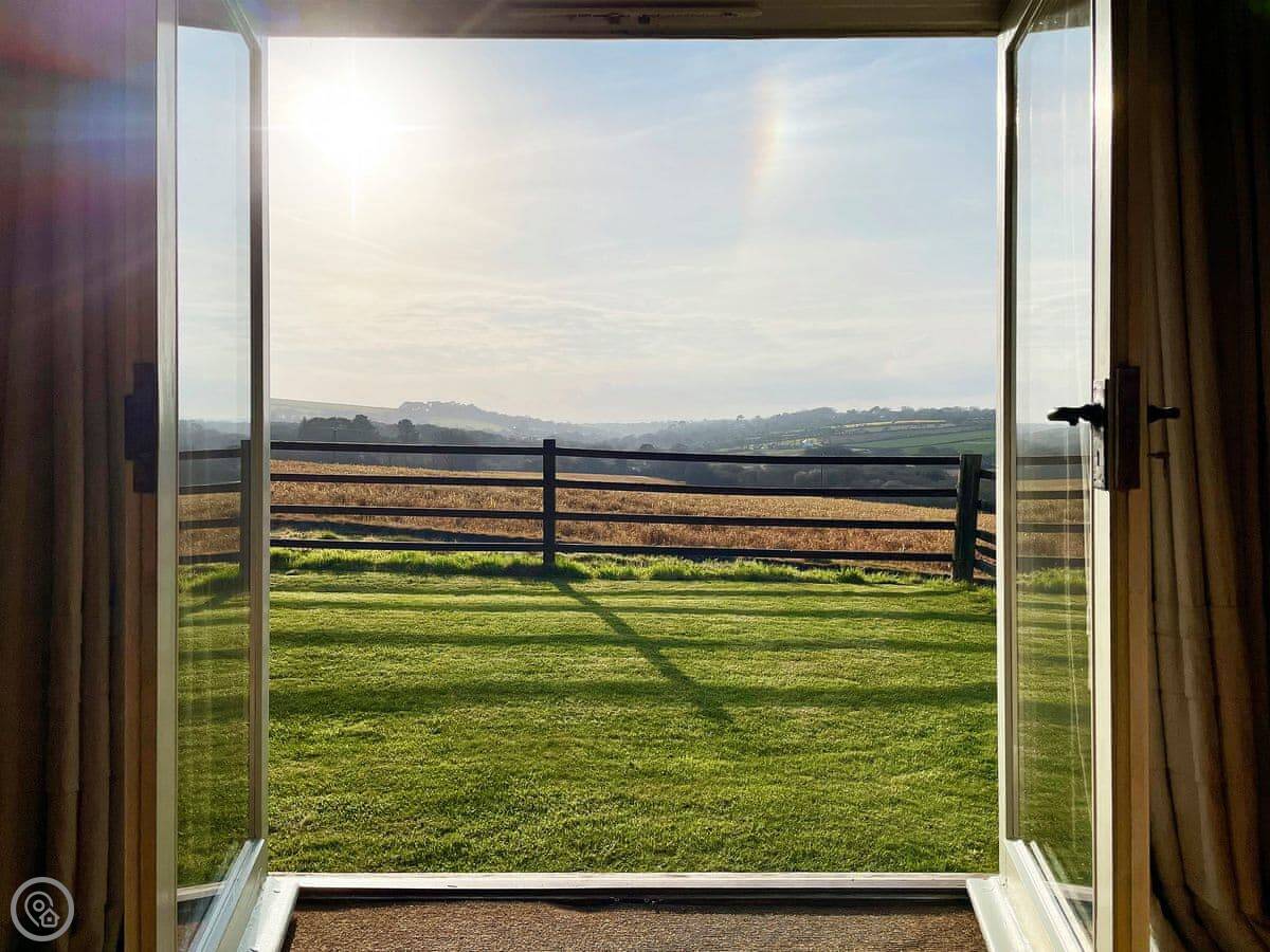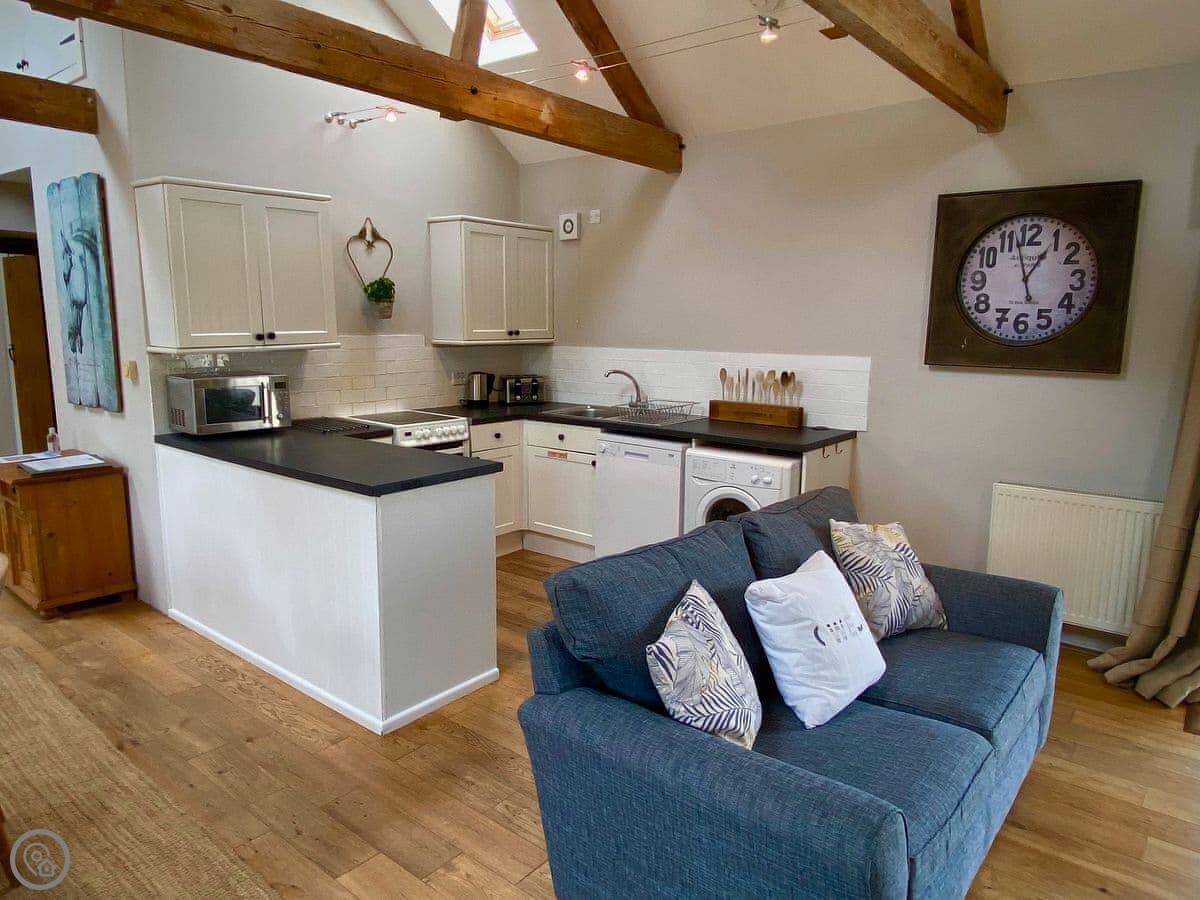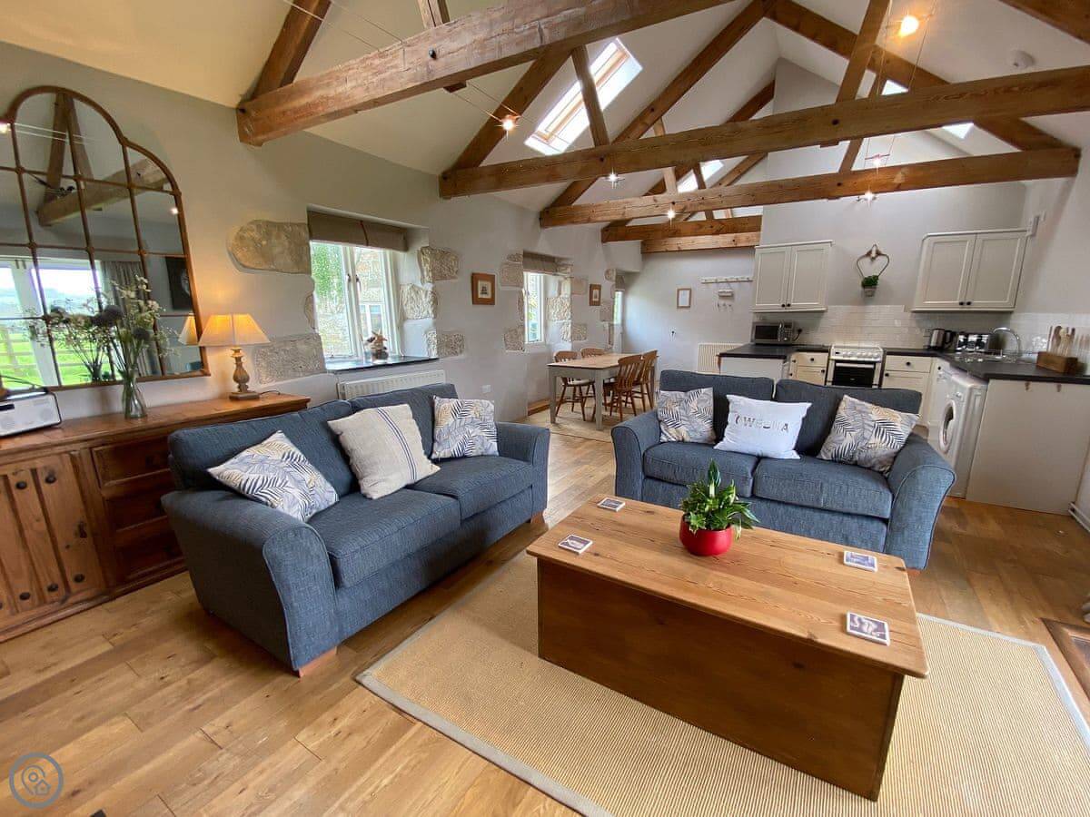 It sleeps four. There are two bedrooms upstairs and one bathroom. It's got a 4 Star rating, so it's comfortable and well-equipped. The main room is all open-plan, with a high beamed ceiling. It feels quite spacious. There's a wood-burning stove for cooler evenings. French doors lead out to your own bit of garden, which is enclosed. You get about two acres of shared gardens too, and a kids' play area.