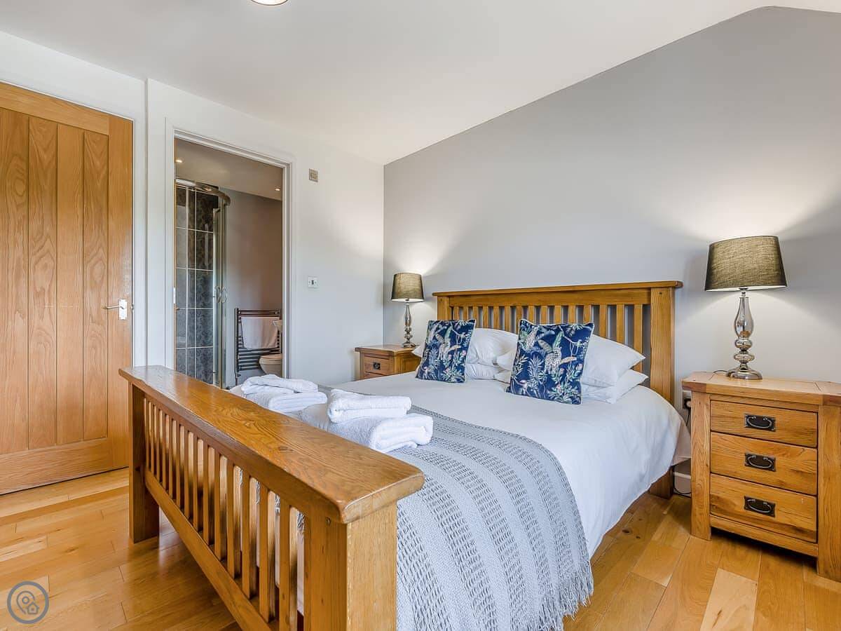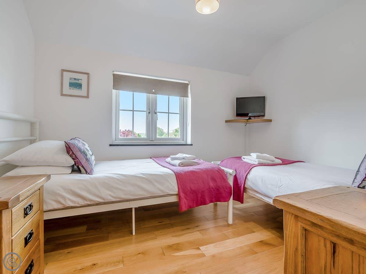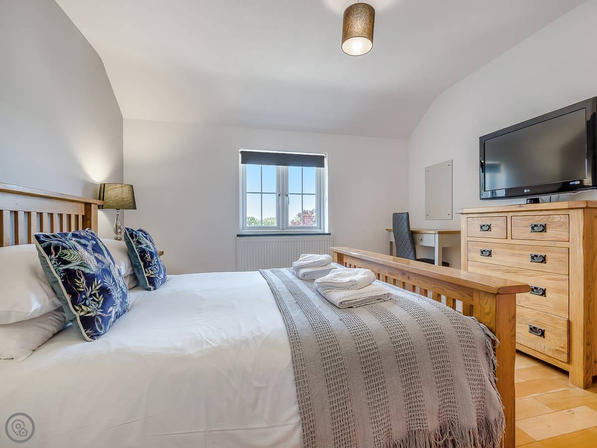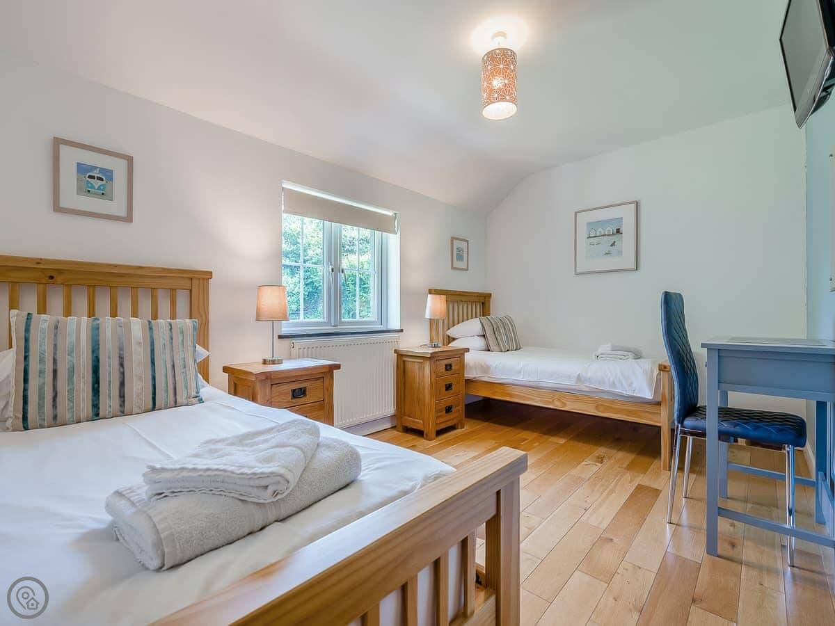It sleeps six. Three bedrooms, two bathrooms, so that's helpful with a few of you. It's got a 5 Star rating which, in practice, means it's been finished to a high standard. Things like oak floors and furniture. All the bedrooms have TVs. It's clean and modern, but it's still a cottage.