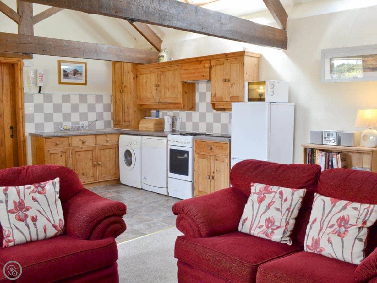 Inside, it's open plan. Kitchen, living area, all one space. There's a dishwasher, washing machine, TV, wifi. Bedding and towels are included. You can bring one dog. Parking is right outside.