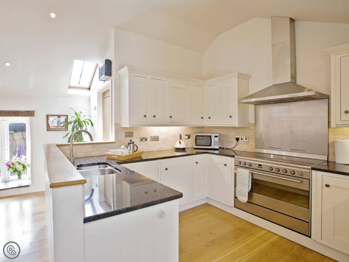 The barn sleeps eight. That's four bedrooms and three bathrooms. It's a 5 Star property, which means it's well-equipped and finished to a good standard. It's one of a pair, but you have your own garden and parking.