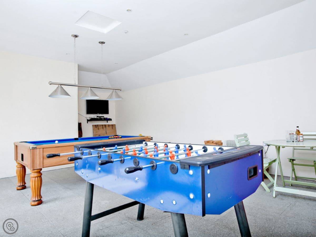 Inside, there's an open plan living area with a woodburning stove. There's a games room with a full-size pool table and table football. The main bathroom has a double-ended bath, and we provide robes and some L'Occitane toiletries.