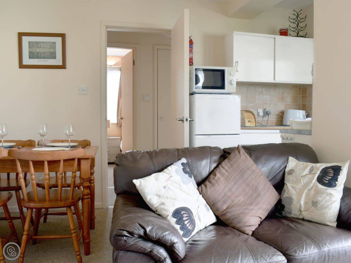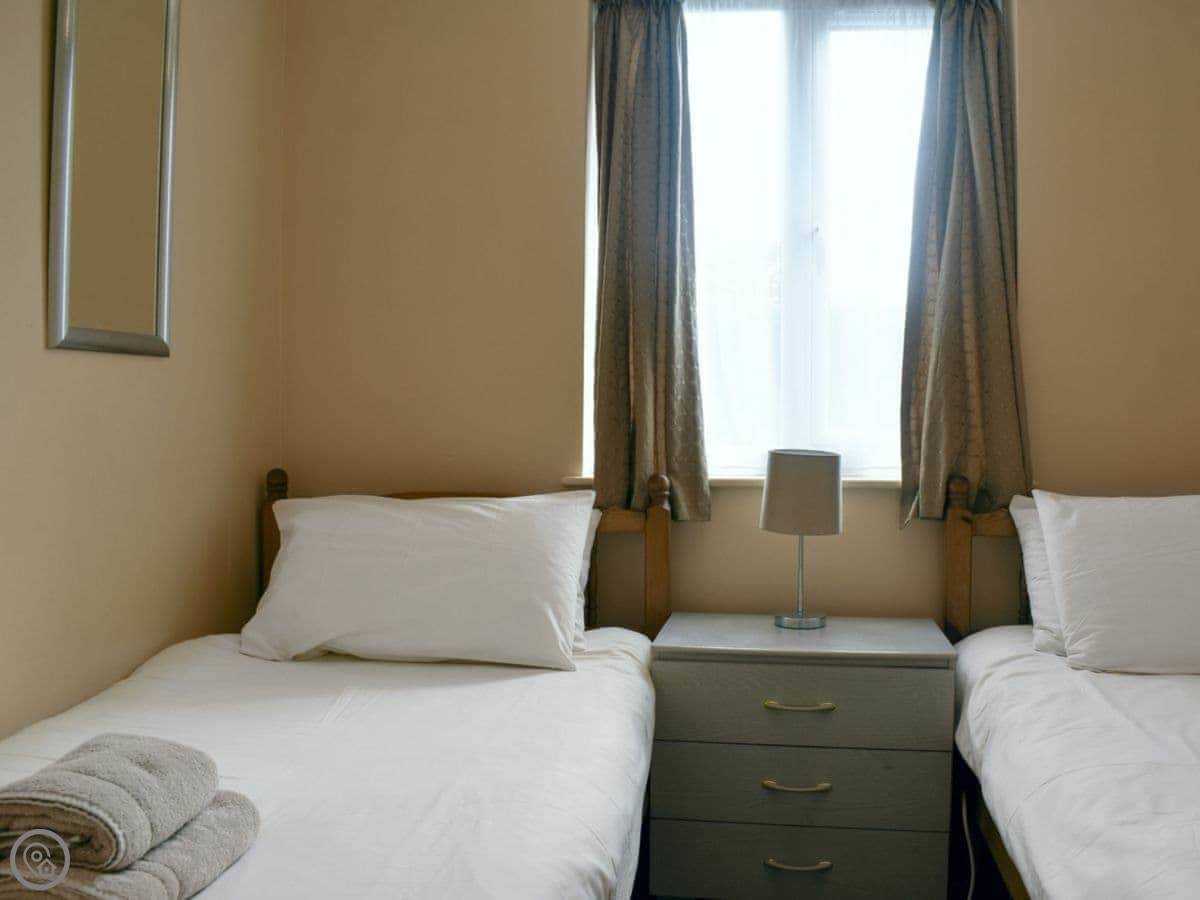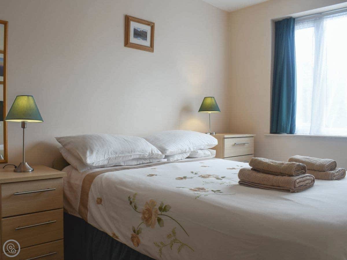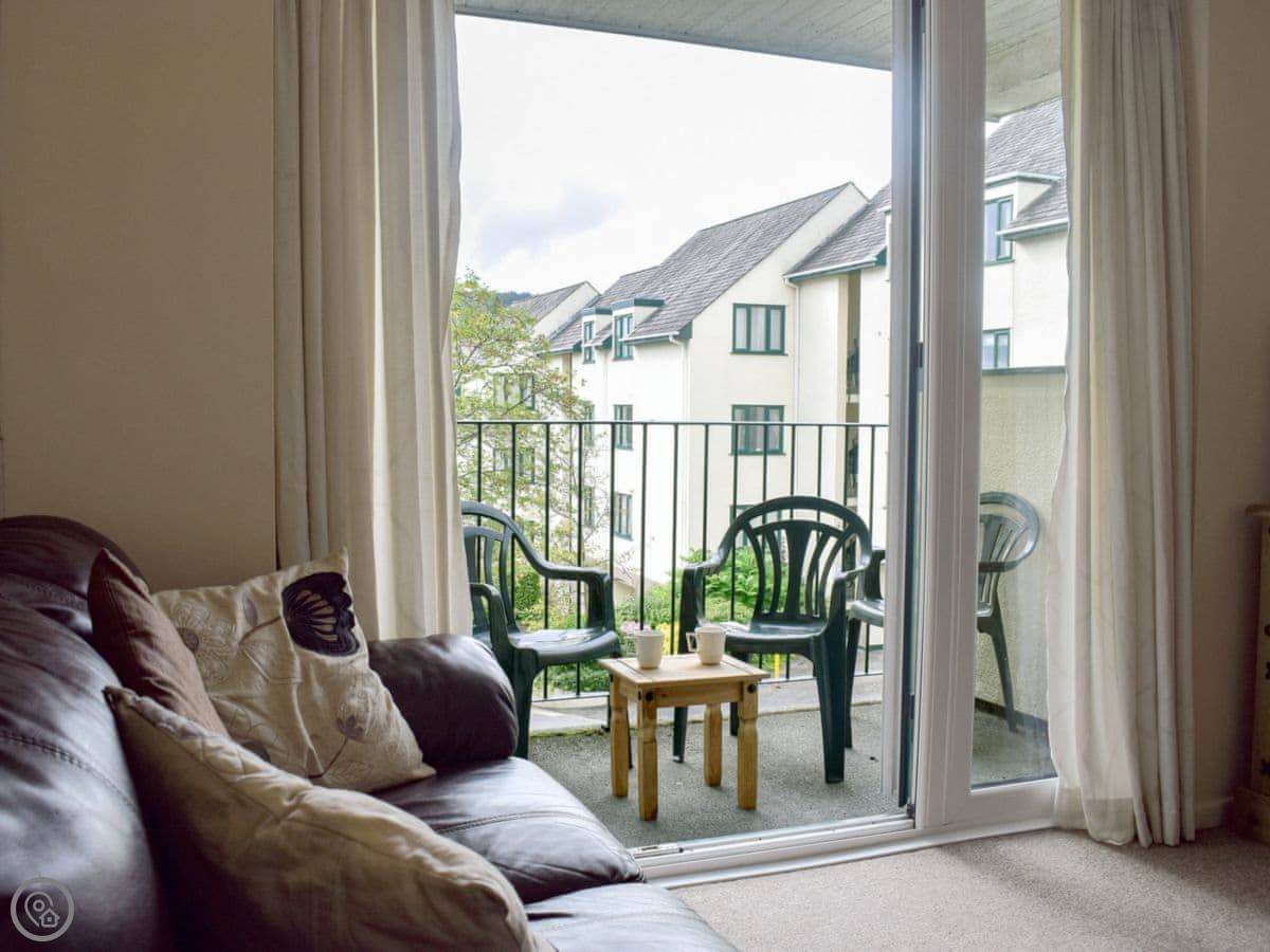 It sleeps four. Two bedrooms, one bathroom. It’s a 3 Star, so it’s clean and comfortable but not luxurious. It’s compact, like most places round here. You’ve got a balcony that looks out towards the woods on Claife Heights.