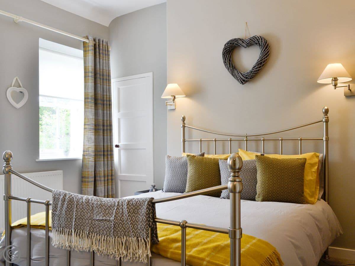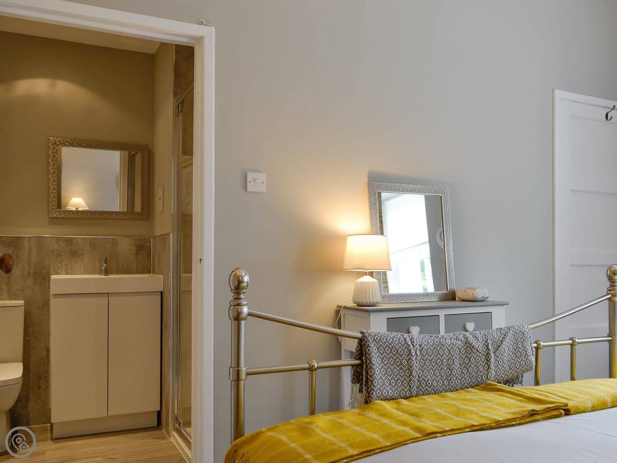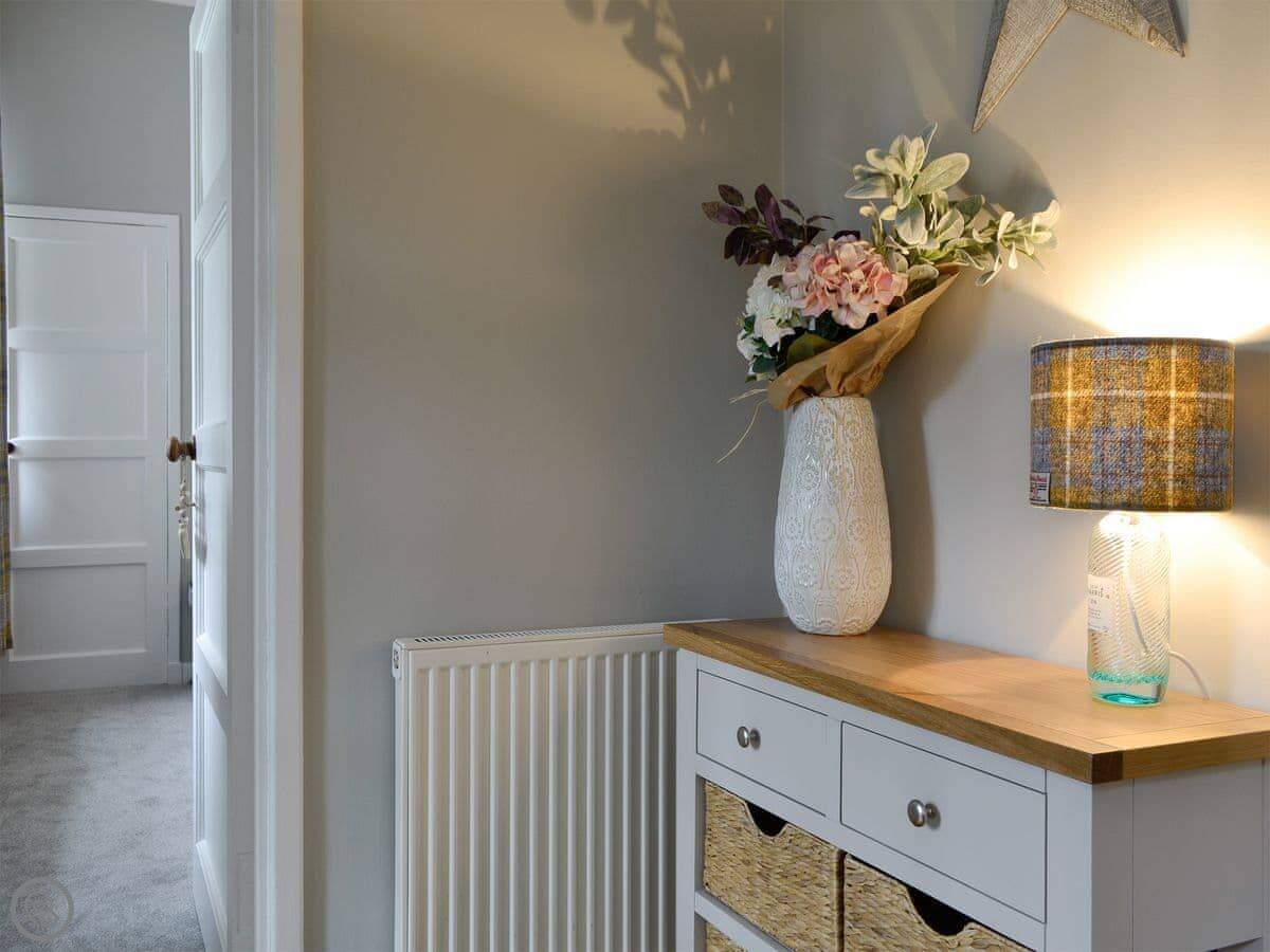 It sleeps four in two bedrooms. Both bedrooms have their own bathroom, which is quite handy. It's got a 4 Star rating. The rooms have high ceilings and wooden floors. There's an open fire in the living room. The kitchen is at the back.
