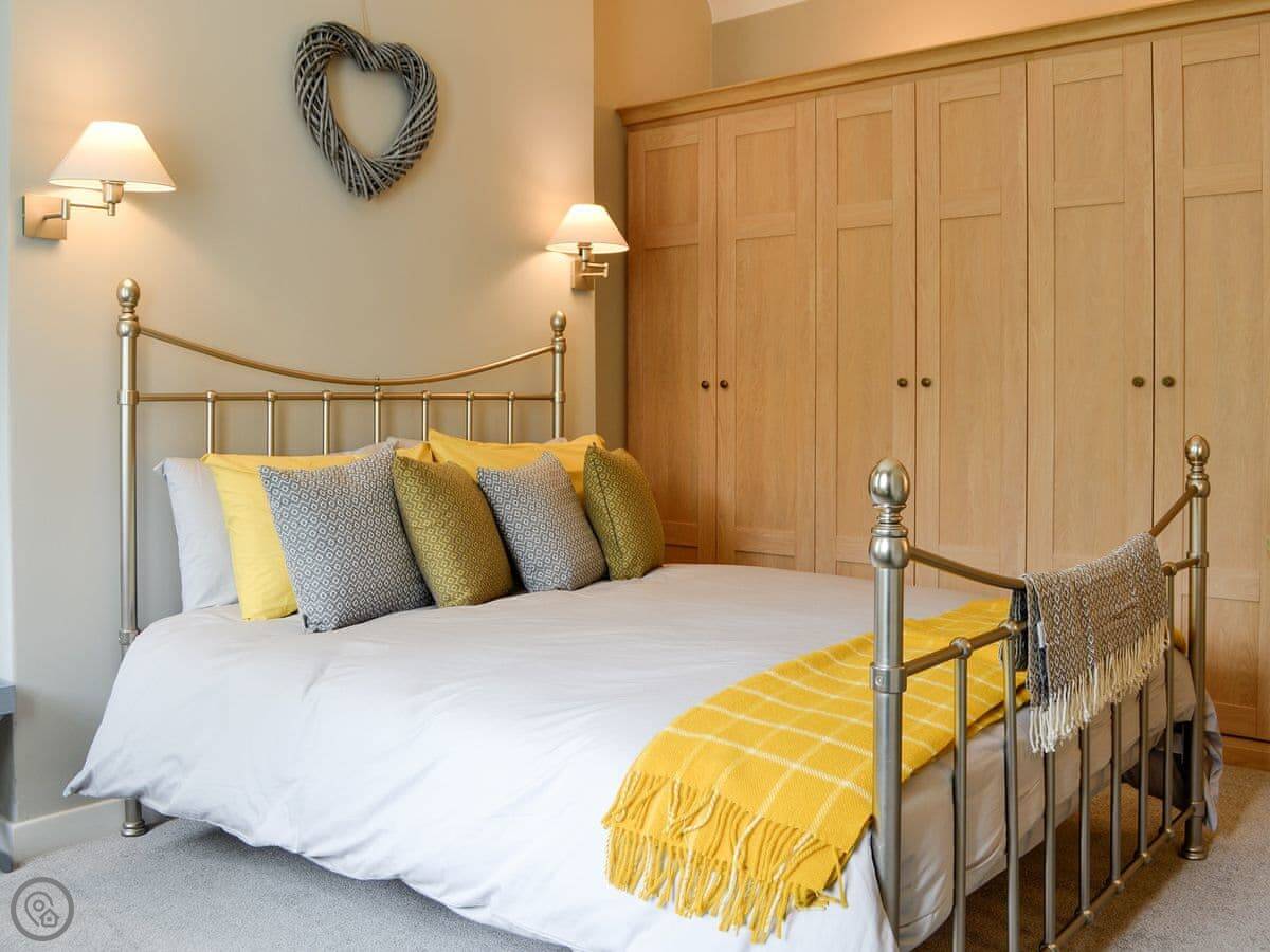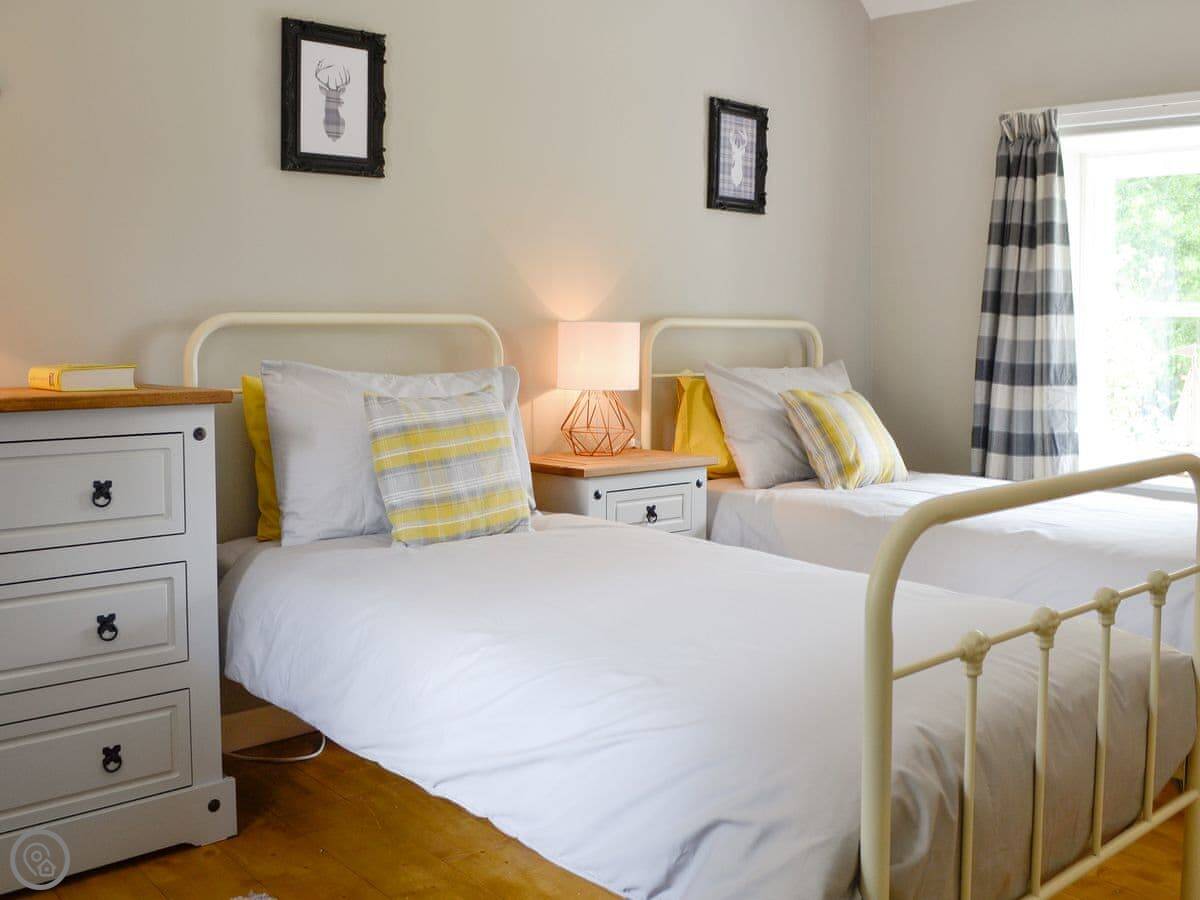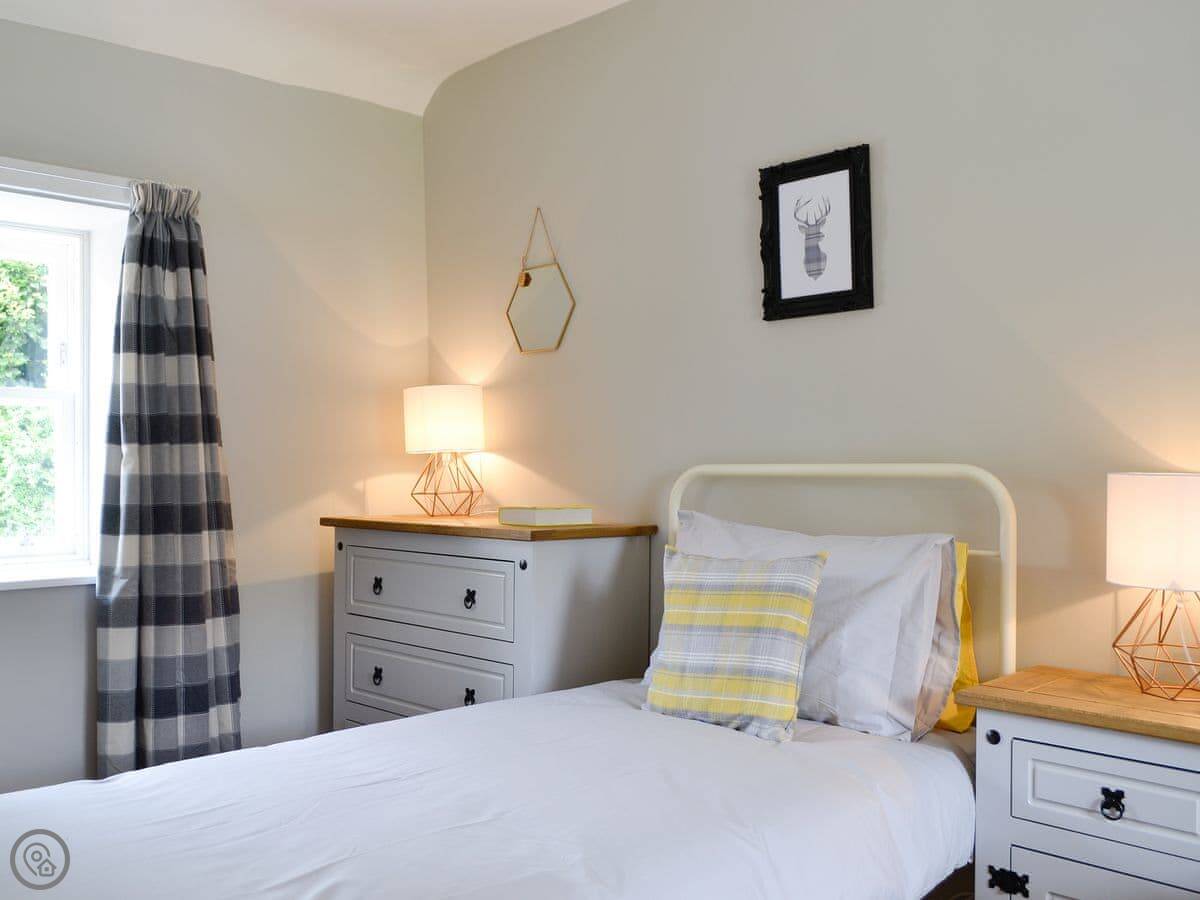 It sleeps four in two bedrooms. Both bedrooms have their own bathroom, which is quite handy. It's got a 4 Star rating. The rooms have high ceilings and wooden floors. There's an open fire in the living room. The kitchen is at the back.