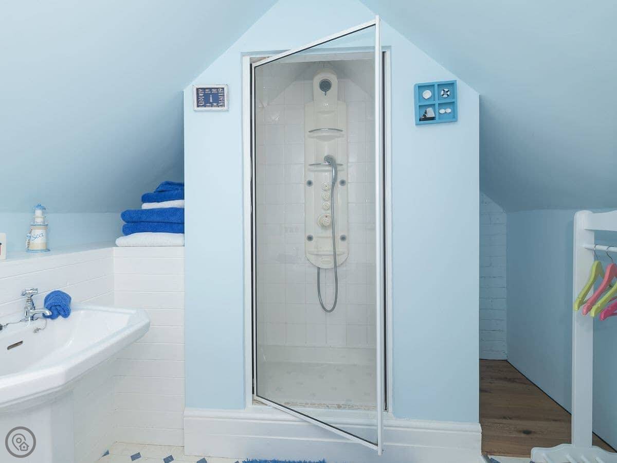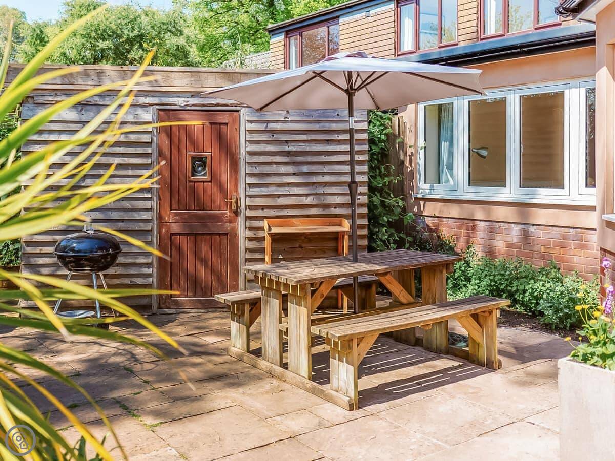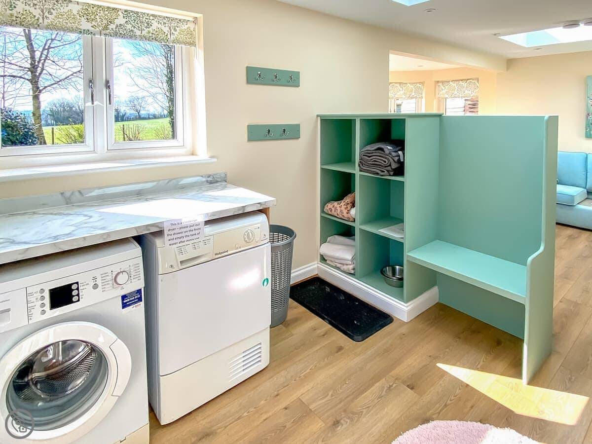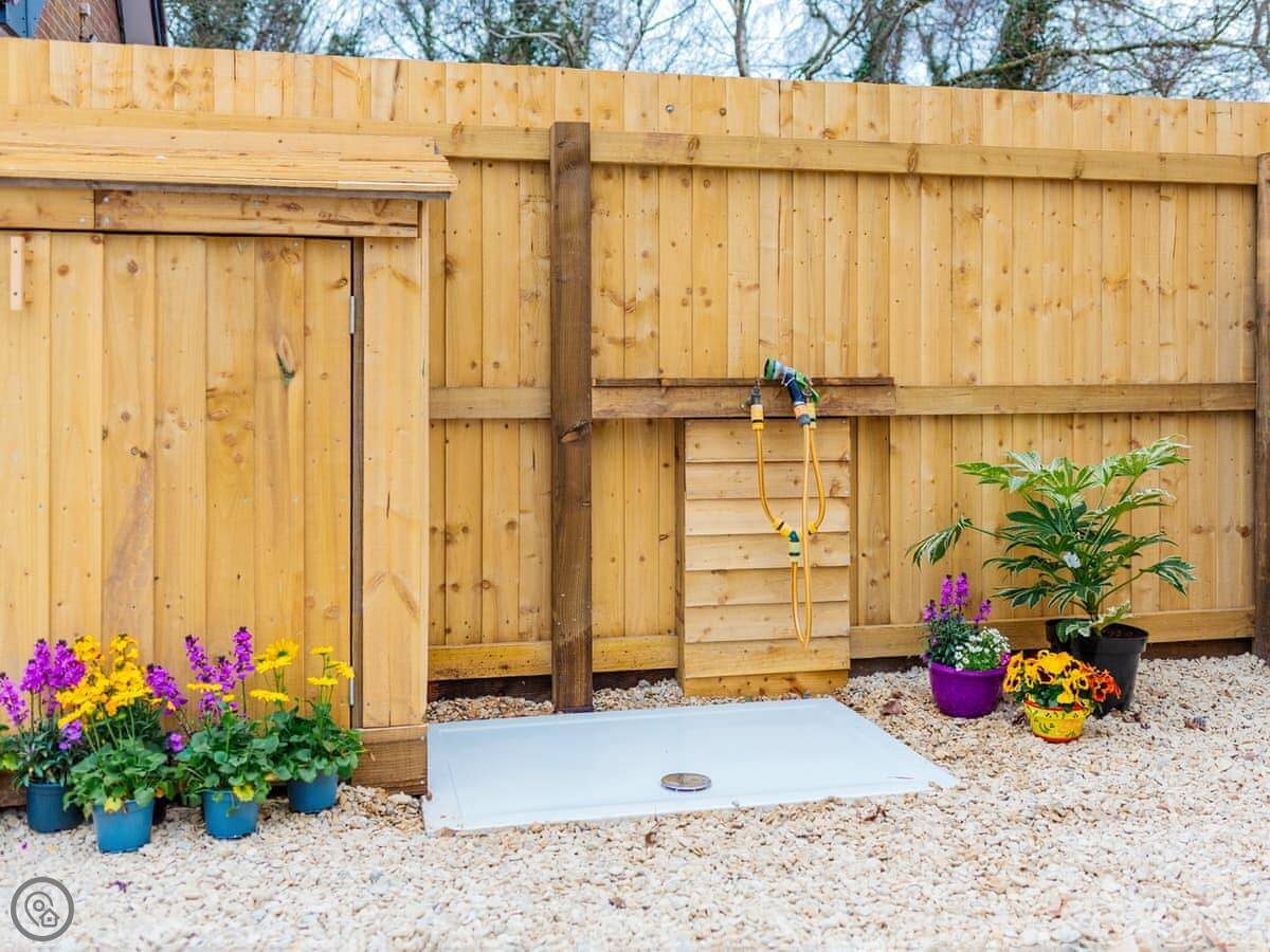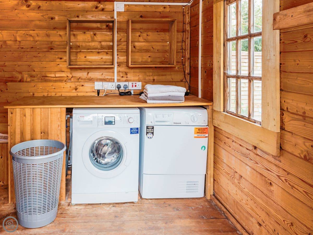 The property is set up for dogs. There's a utility room with throws, towels and a washing machine. Outside, there's a shower for washing dogs off. The garden is fenced all round.