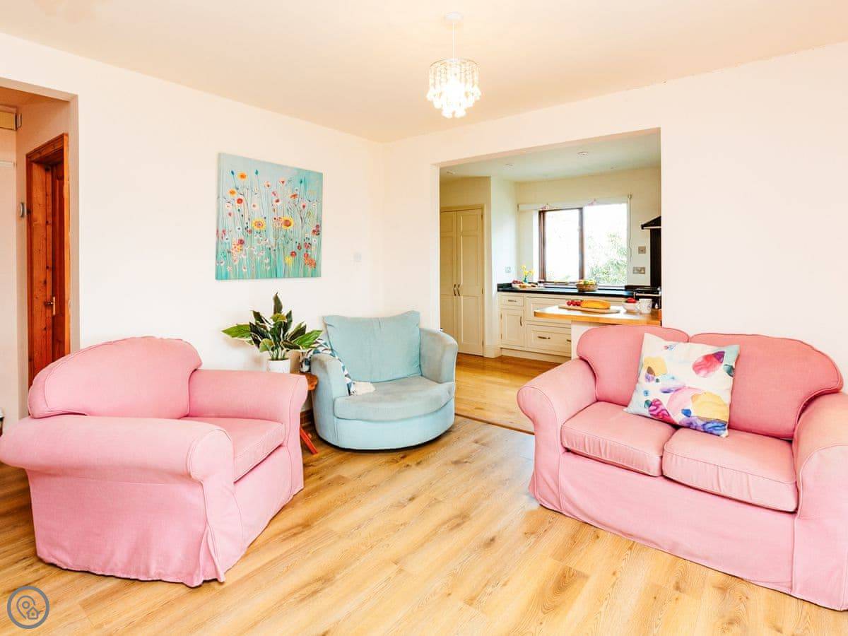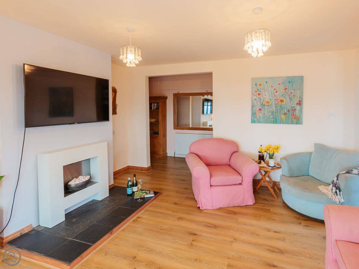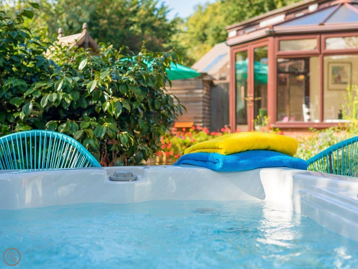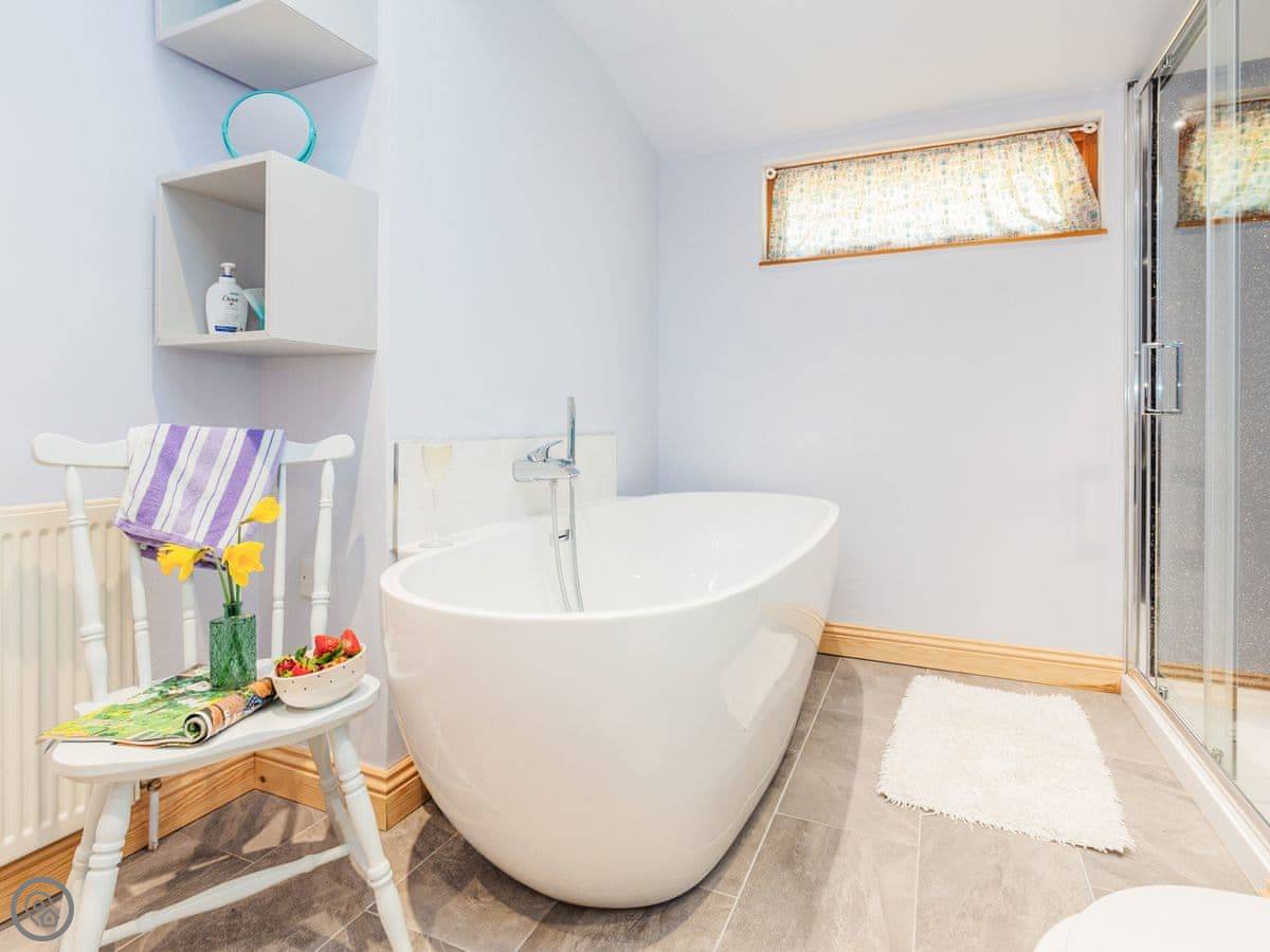 For people, there's a hot tub on the patio. There's also a large freestanding bath outside, if you fancy that. The living room has a big TV and comfortable seats. The kitchen has everything you'd need, including a freezer.