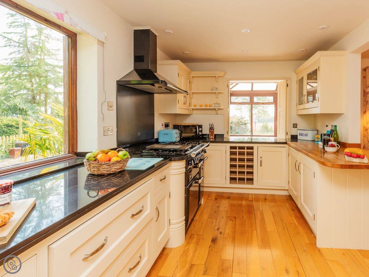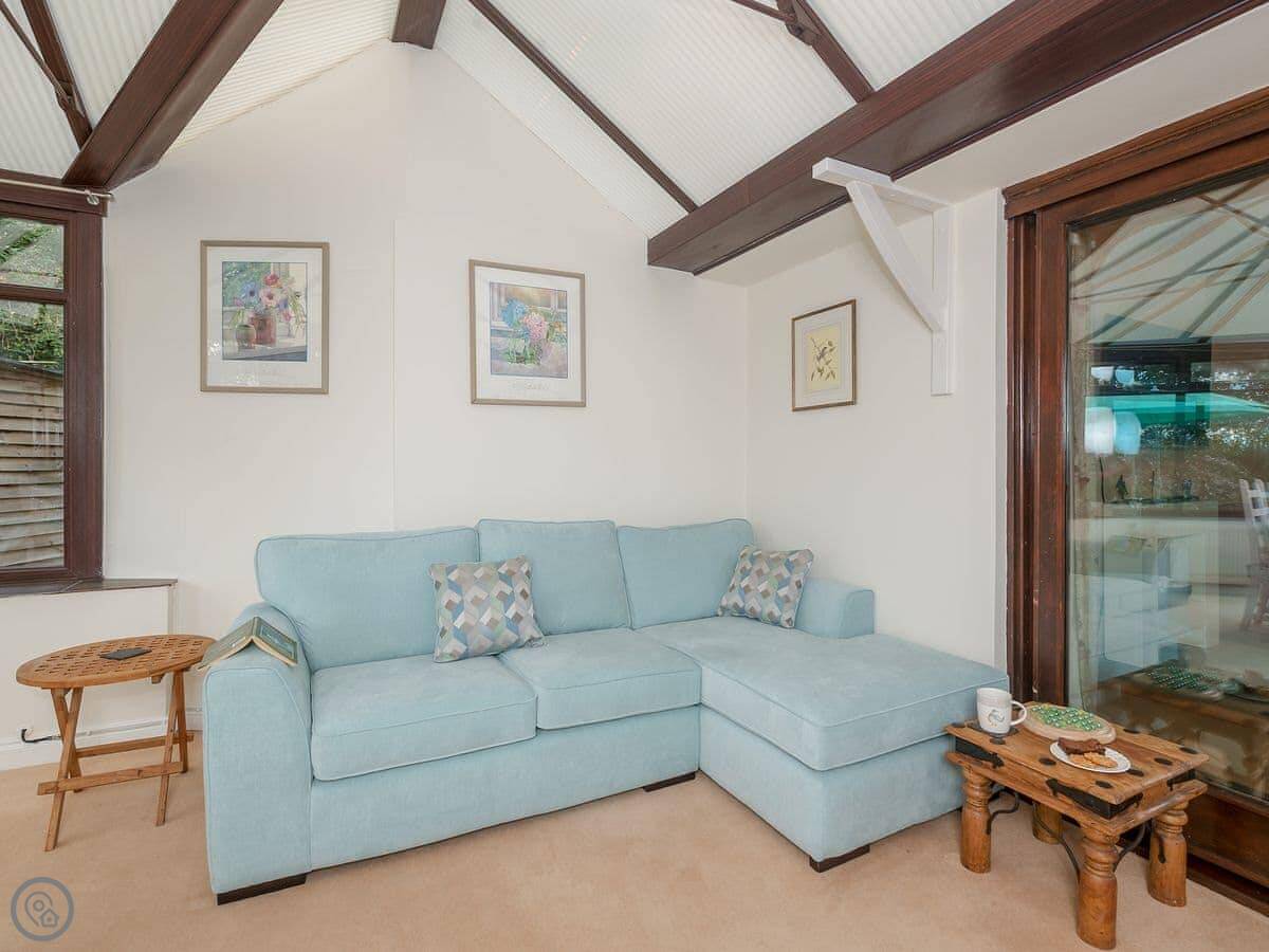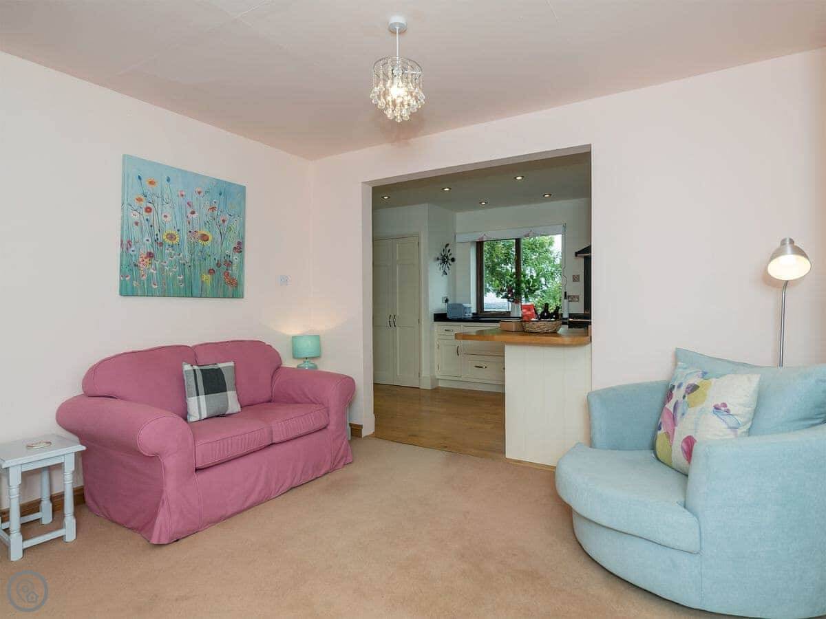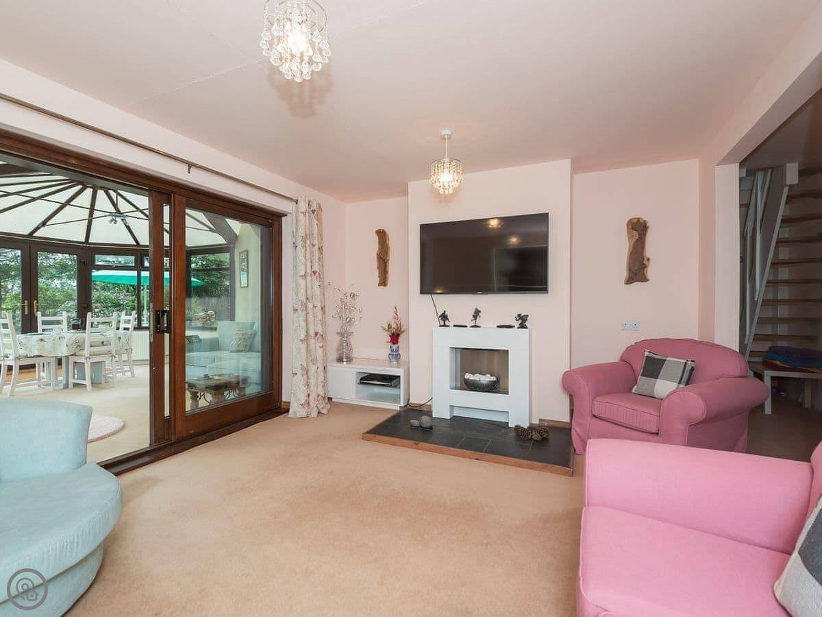 For people, there's a hot tub on the patio. There's also a large freestanding bath outside, if you fancy that. The living room has a big TV and comfortable seats. The kitchen has everything you'd need, including a freezer.
