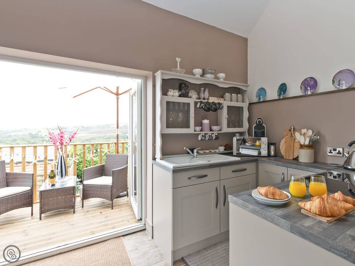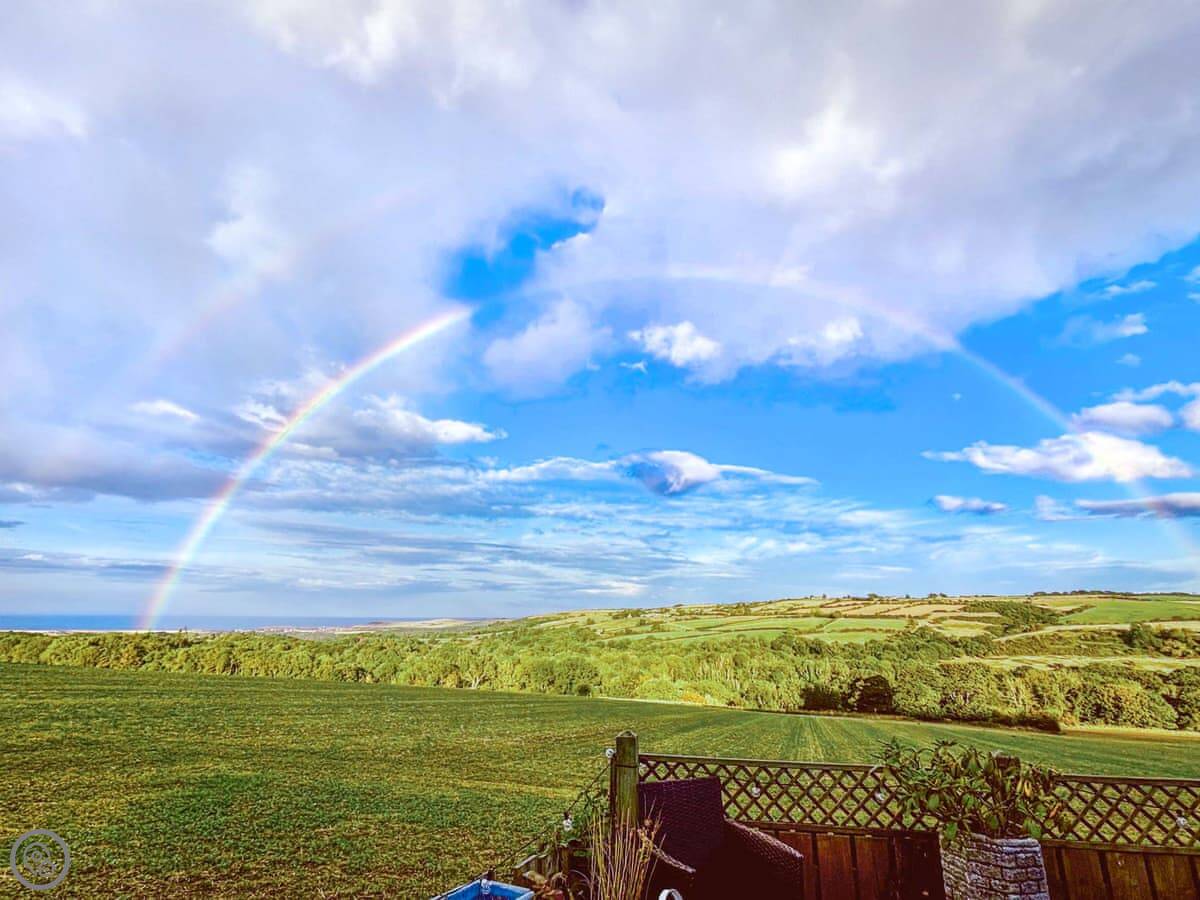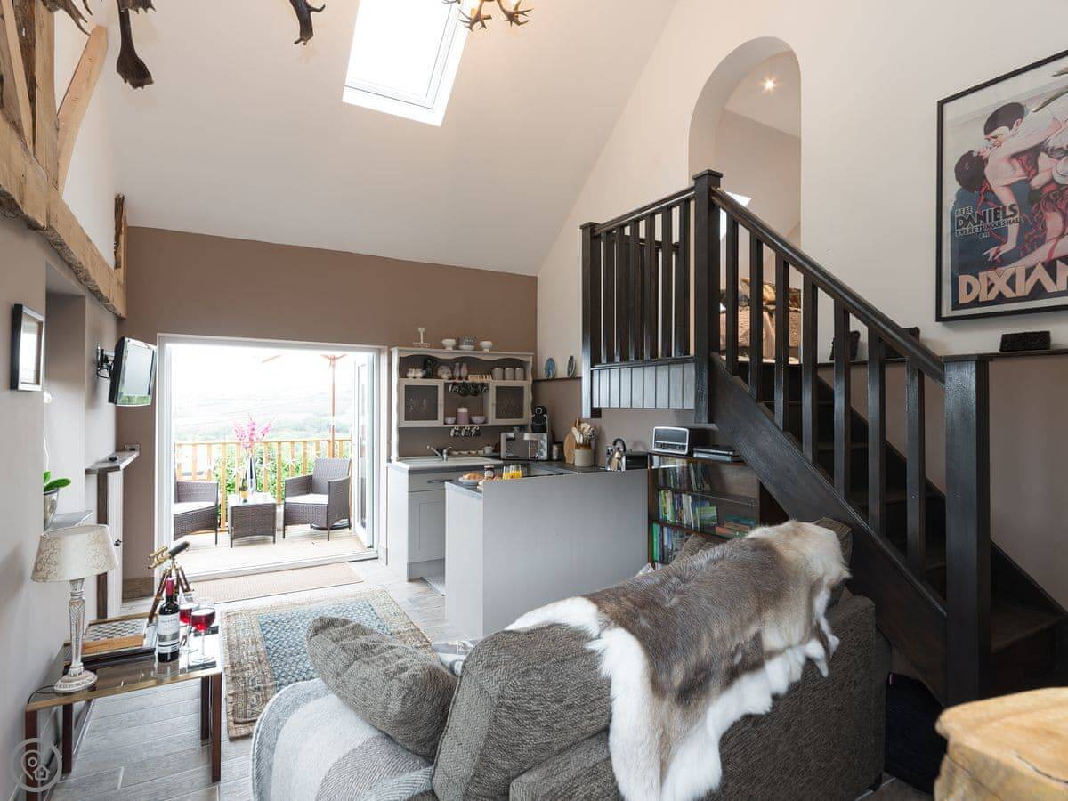 The place was renovated a few years ago so it's in good shape. It's open plan downstairs, with the kitchen at one end. The patio doors open onto a balcony that looks out over fields towards Staithes and the sea. You can see the water from there on a clear day.