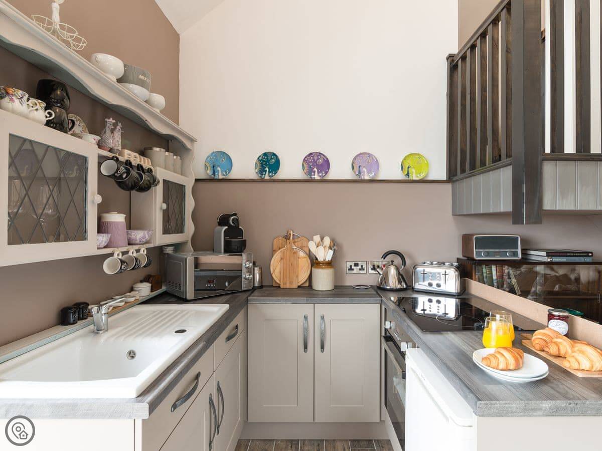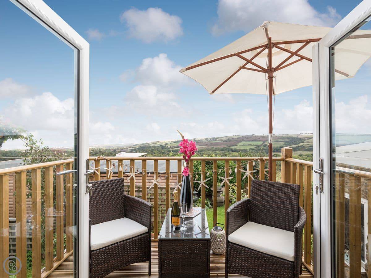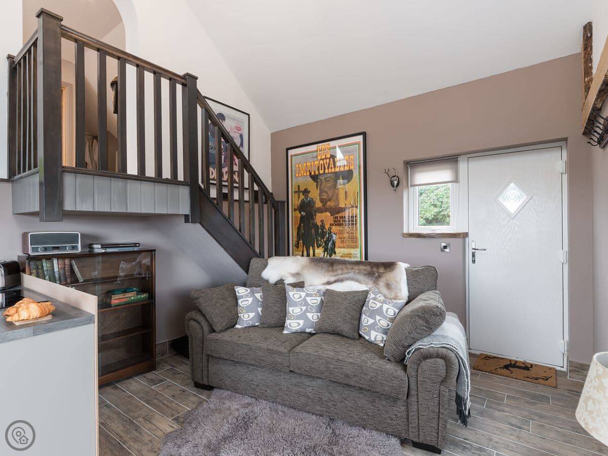 The place was renovated a few years ago so it's in good shape. It's open plan downstairs, with the kitchen at one end. The patio doors open onto a balcony that looks out over fields towards Staithes and the sea. You can see the water from there on a clear day.