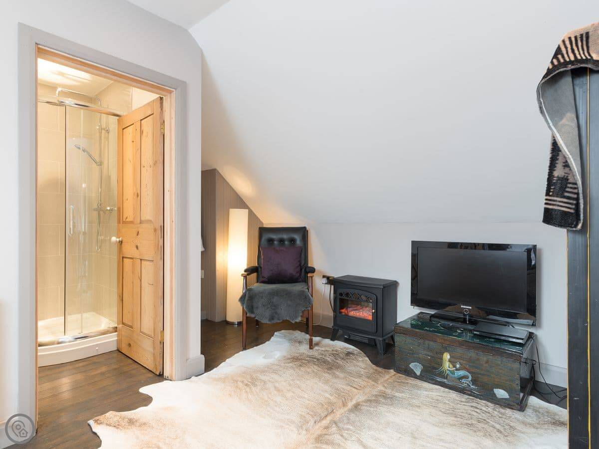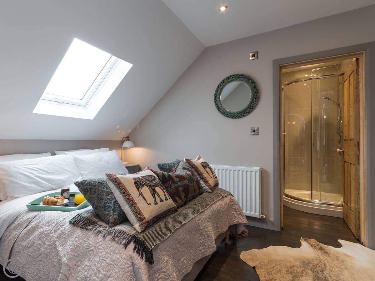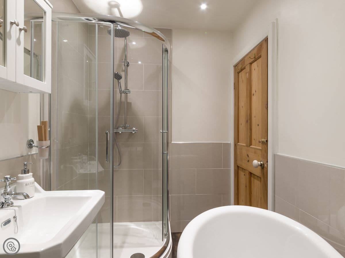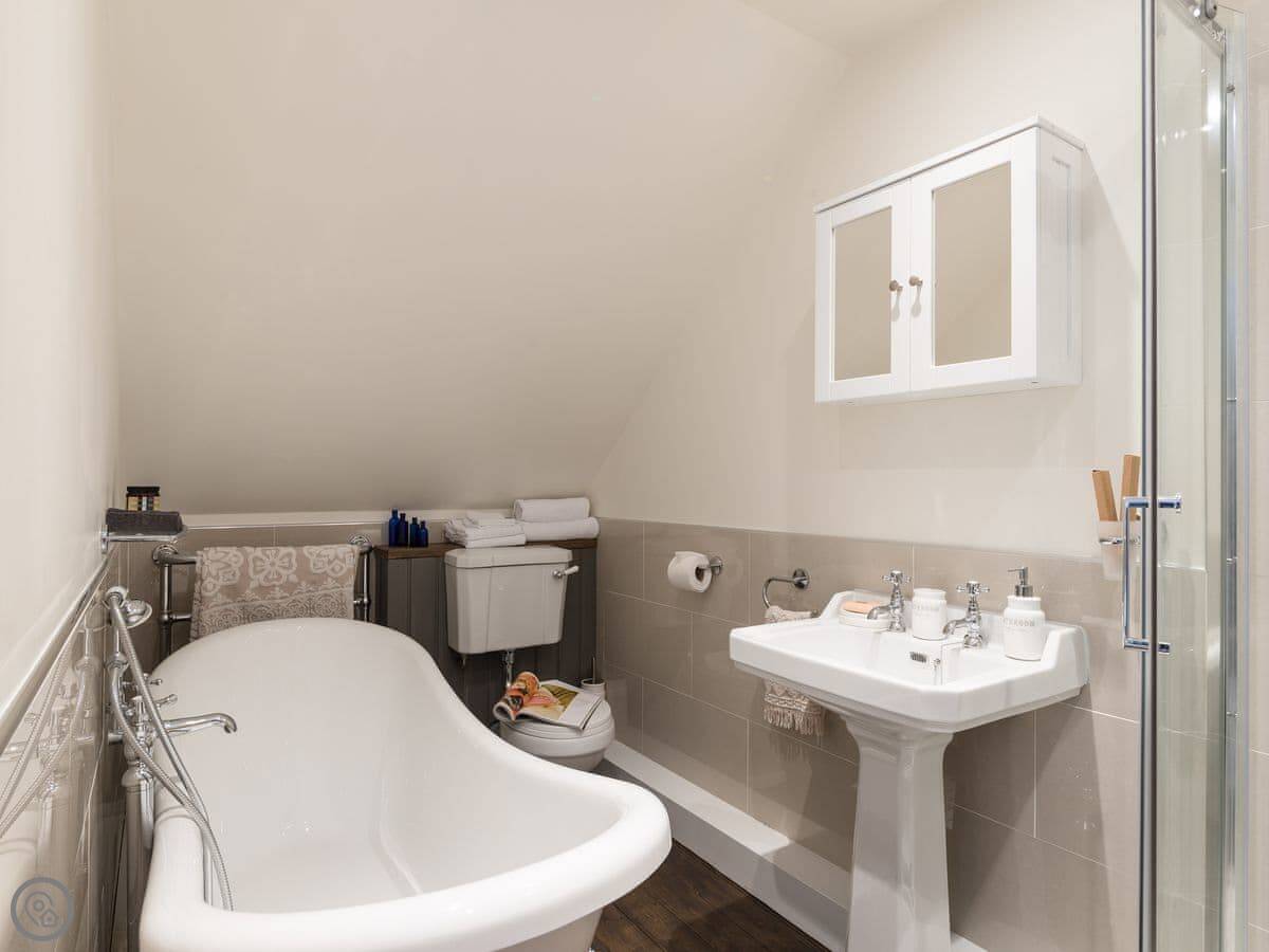 Upstairs is the bedroom with an en-suite bathroom. It's got a roll-top bath and a separate power shower. We leave bathrobes and slippers for you. The stairs are a bit steep, like most old cottages.