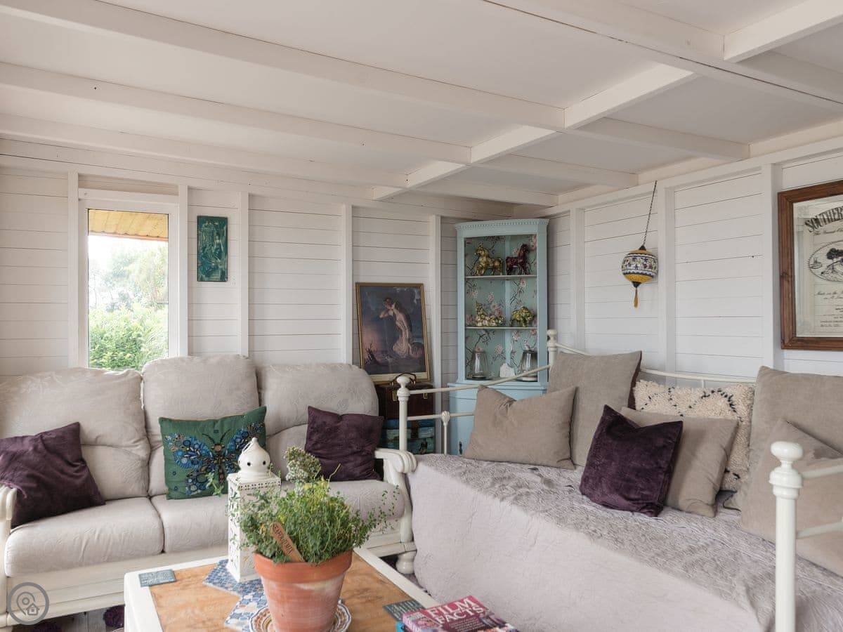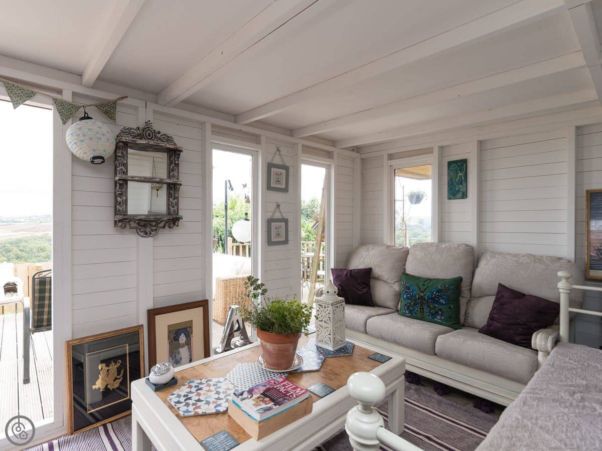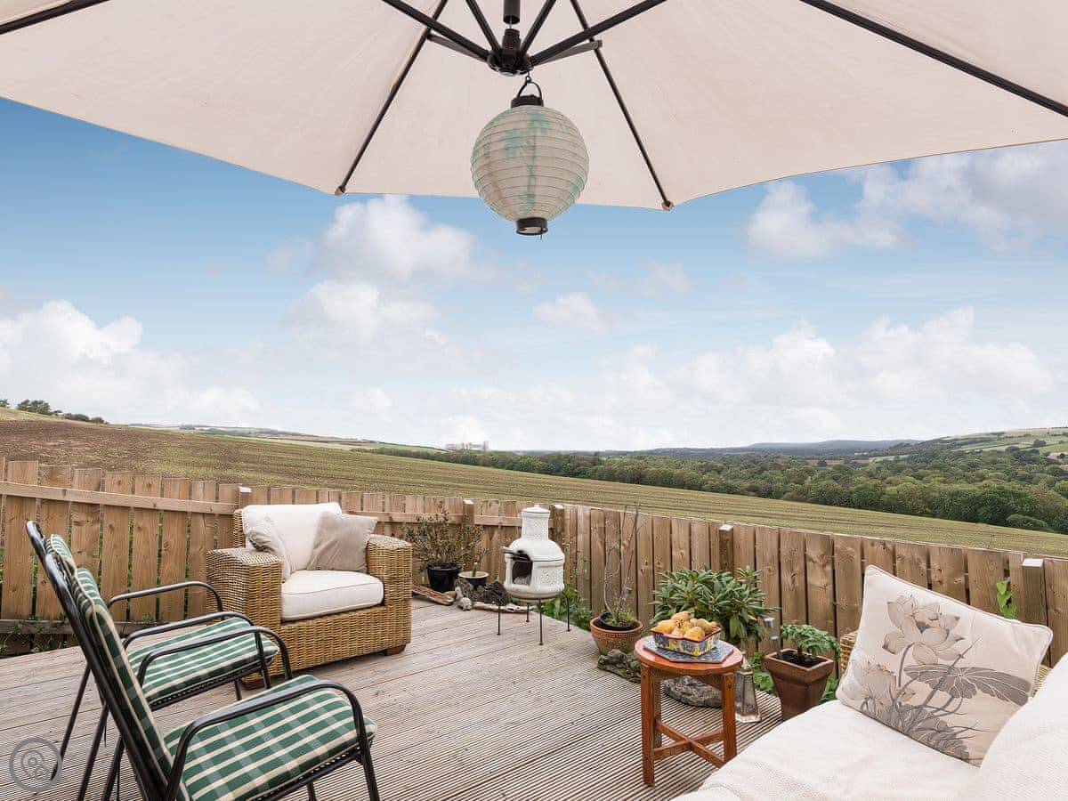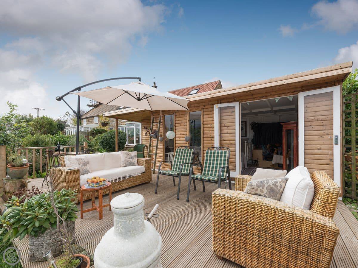 There's a decked terrace outside with a chiminea. I live next door with my dogs, and you're welcome to use the shared lawn and the summerhouse.