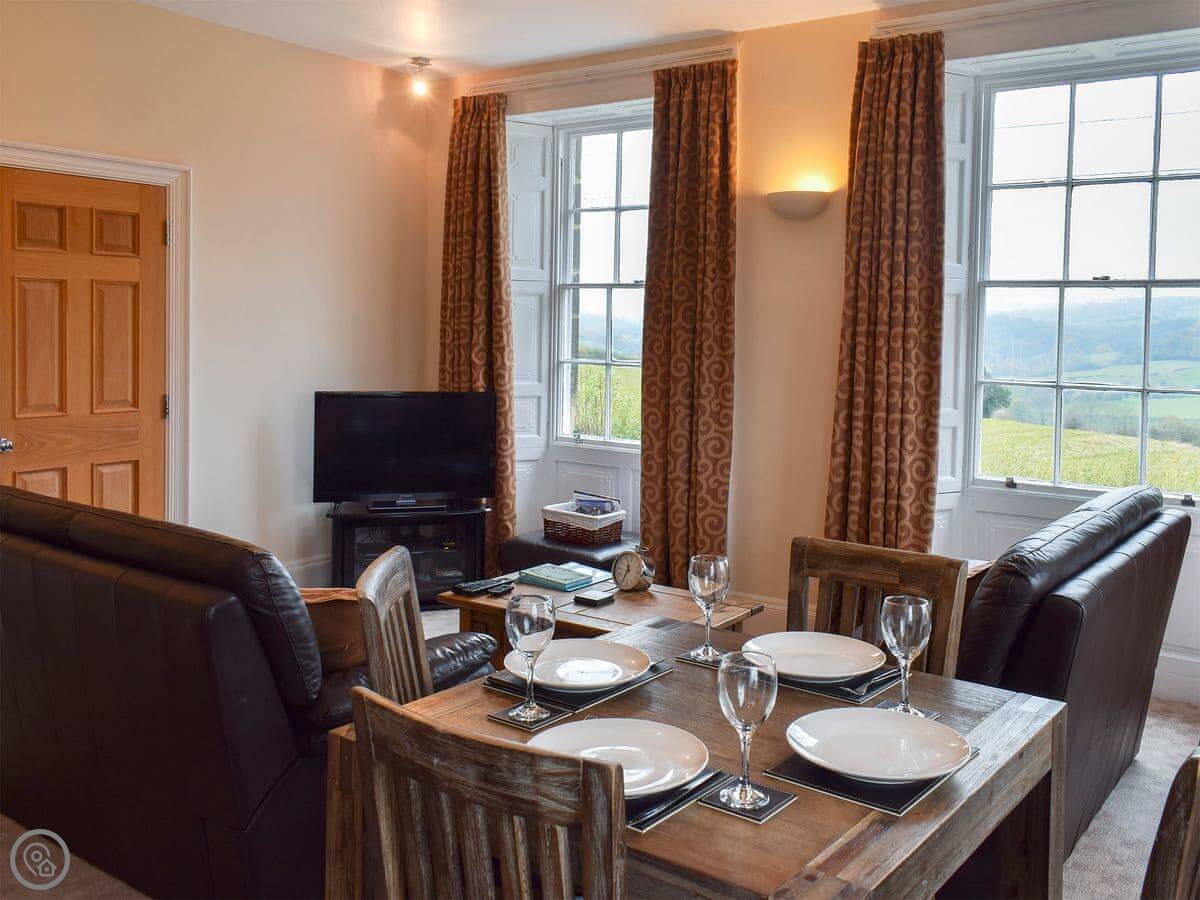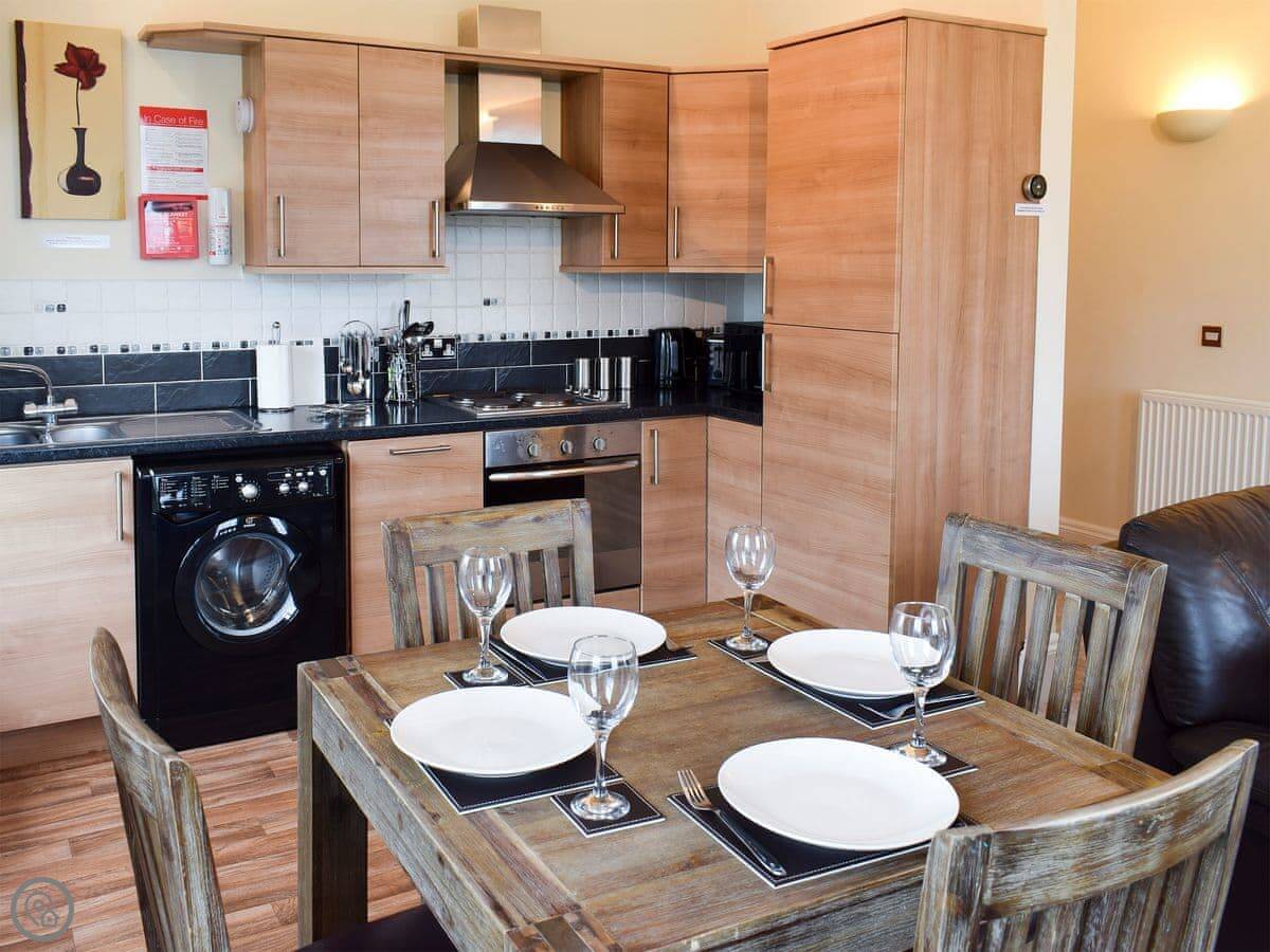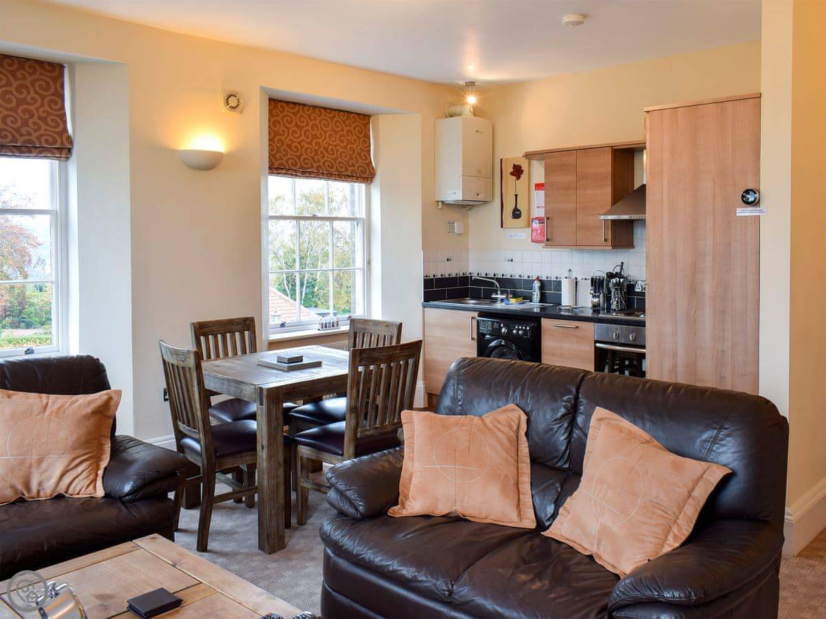 Located within a Grade II listed building, this lovely apartment offers a modern home from home feel, and has been converted from former country house dating back to the 1800s. The spacious, open plan living area enjoys views over the Esk Valley countryside, while the master bedroom boasts a kingsize bed complete with a TV for those lazy mornings. There is also a second bedroom with a bunk bed for the children, and convenient parking within the grounds. The beautiful village of Sleights is surrounded by fantastic countryside walks including a route to Whitby passing through the picturesque, riverside village of Ruswarp and the Cinder Track. Sleights has two traditional pubs, both serving food and offering a warm welcome, as well as a local butcher and tea room. Steam trains pass through the village throughout the year, with a service that takes you to the nearby town of Whitby, and there is a regular bus service too.
