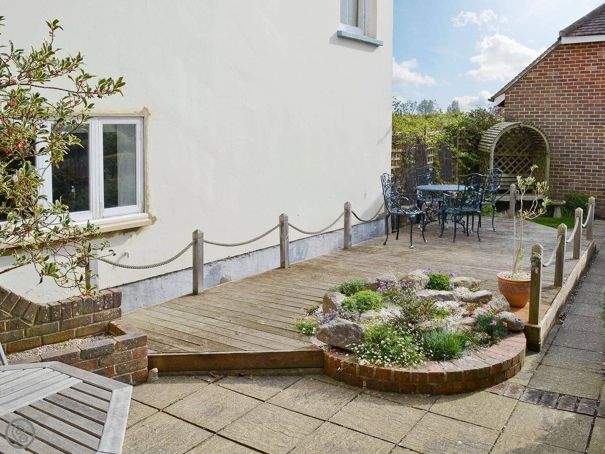 The front bit is small, just a path to the door and a gate. Out the back is a walled patio garden, with a table. It gets the sun.
