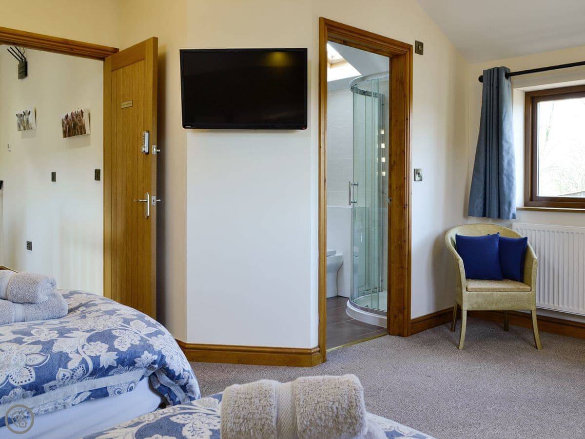 This large, semi-detached barn conversion is ideal for larger families or friends looking to get away and explore the open countryside of Monmouthshire, the Forest of Dean and Offa’s Dyke. Located next door to the owner on a working farm, it provides comfortable accommodation for up to eight guests. The property has four double bedrooms, all with en-suite facilities and Freeview TV’s. Lord Nelson’s room on the ground floor has twin beds, King Henry’s room on the first floor has a kingsize bed, Charles Rolls’ room has a double bed and Lady Llangattock’s room has twin beds. King Offa Lodge offers a great living/dining room with a wood burner, ideal for those special family gatherings. The oak flooring has underfloor heating to keep you warm and cosy, run from the owner’s biomass heating and solar panels. The large kitchen, also with a TV, is the perfect place to gather around the table and enjoy a meal together, alternatively enjoy al fresco dining in the enclosed garden with patio area and lawn. By prior arrangement with the owner, private hot tub hire can be arranged with a local company at cost. The local pub is 3 miles from the property and the lovely town of Monmouth is 4 miles, with its abundance of quaint shops, coffee shops and boutiques. Shop 4 miles, pub and restaurant 3 miles.