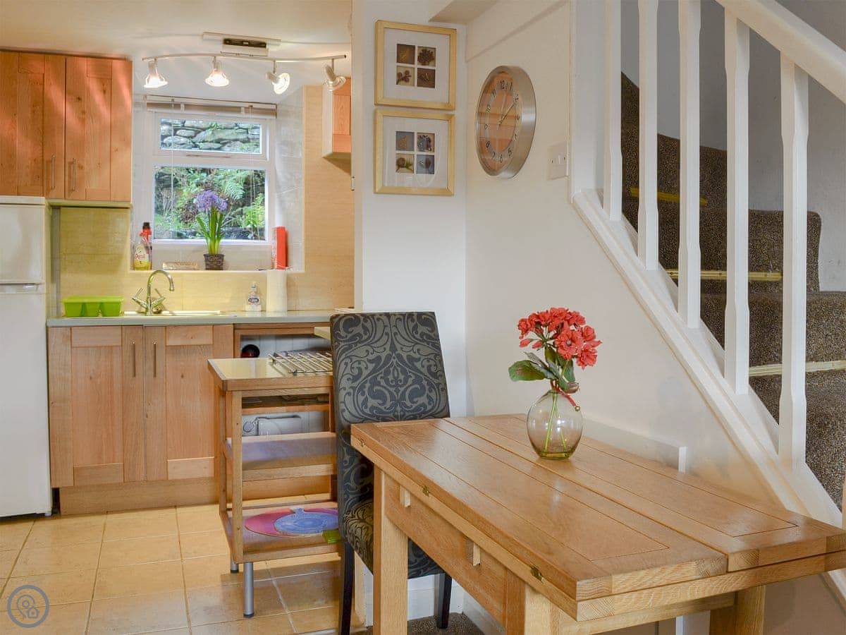Inside, it's open plan on the ground floor with the living area and kitchen. There's a fold-away dining table. It has WiFi, a TV, and all the bedding and towels are included. No pets, sorry.