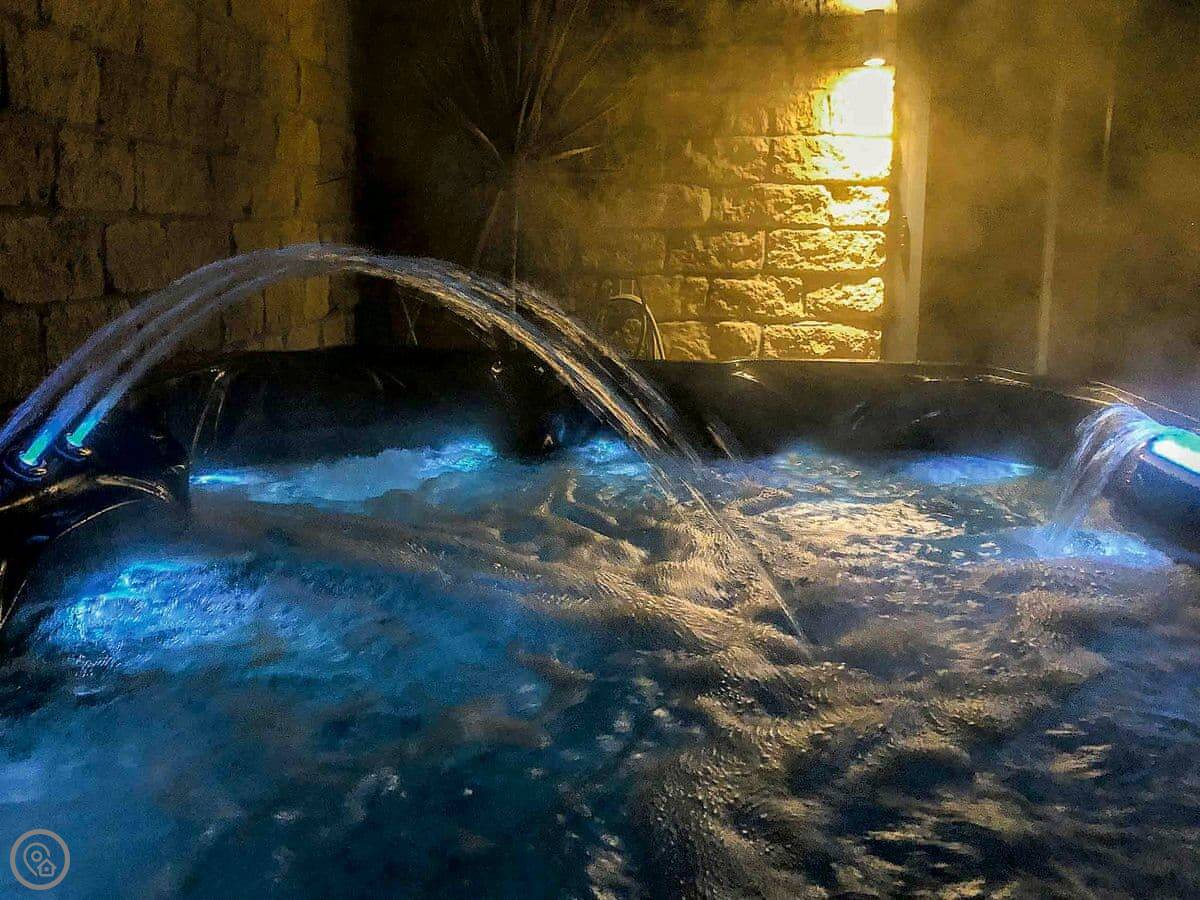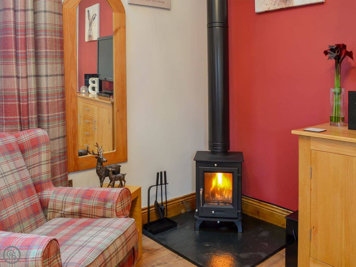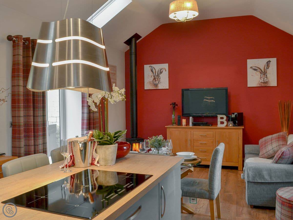The main living area is open plan. There's a wood burner in the corner. The kitchen's well-equipped. Outside, there's a large, enclosed garden with a patio and a hot tub.