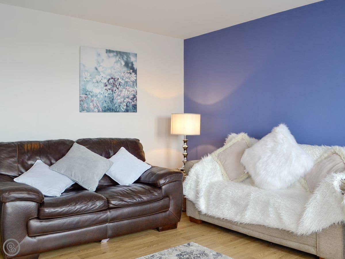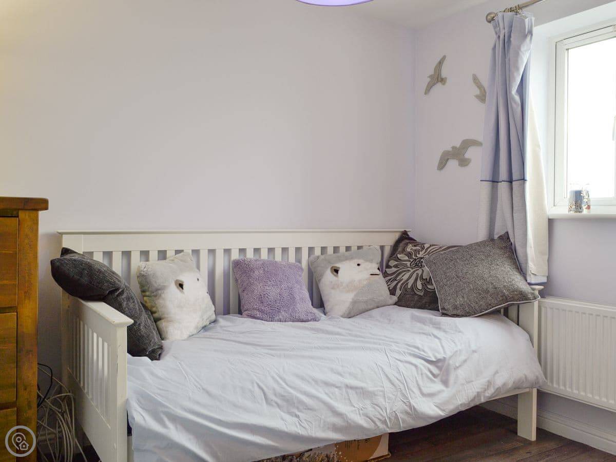 You've got two small gardens, one at the front and an enclosed one at the back with some furniture. The front garden is just lawn. You can hear the sea from there.