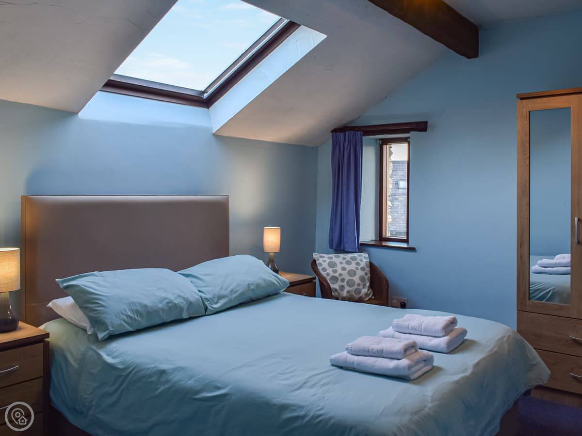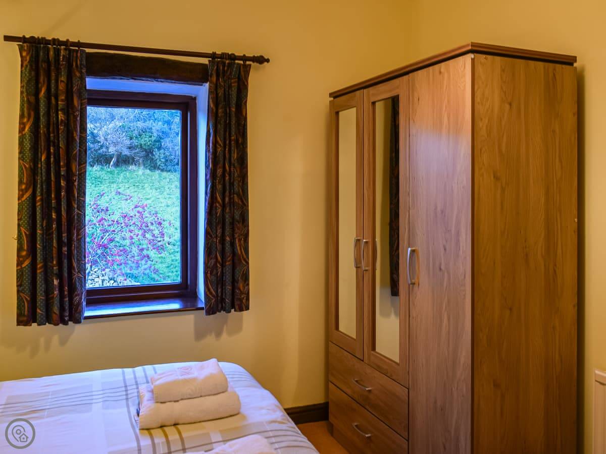 It sleeps eight. Four bedrooms, two bathrooms. It's got a 4 Star rating. The living room is big and has a wood burner. The stairs go up through an arched window, so you get the light and the view as you go up.