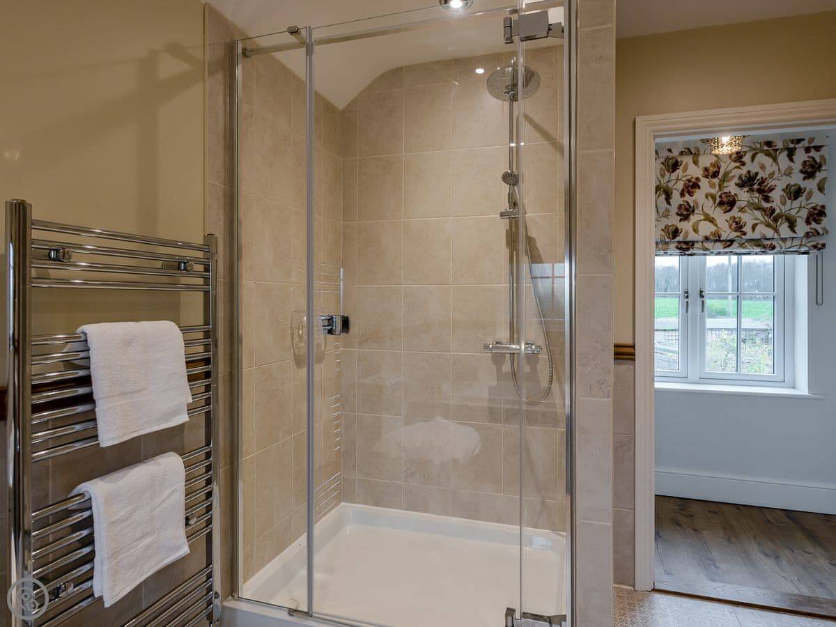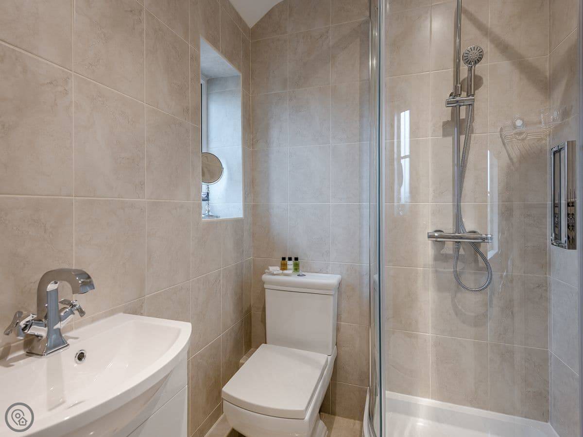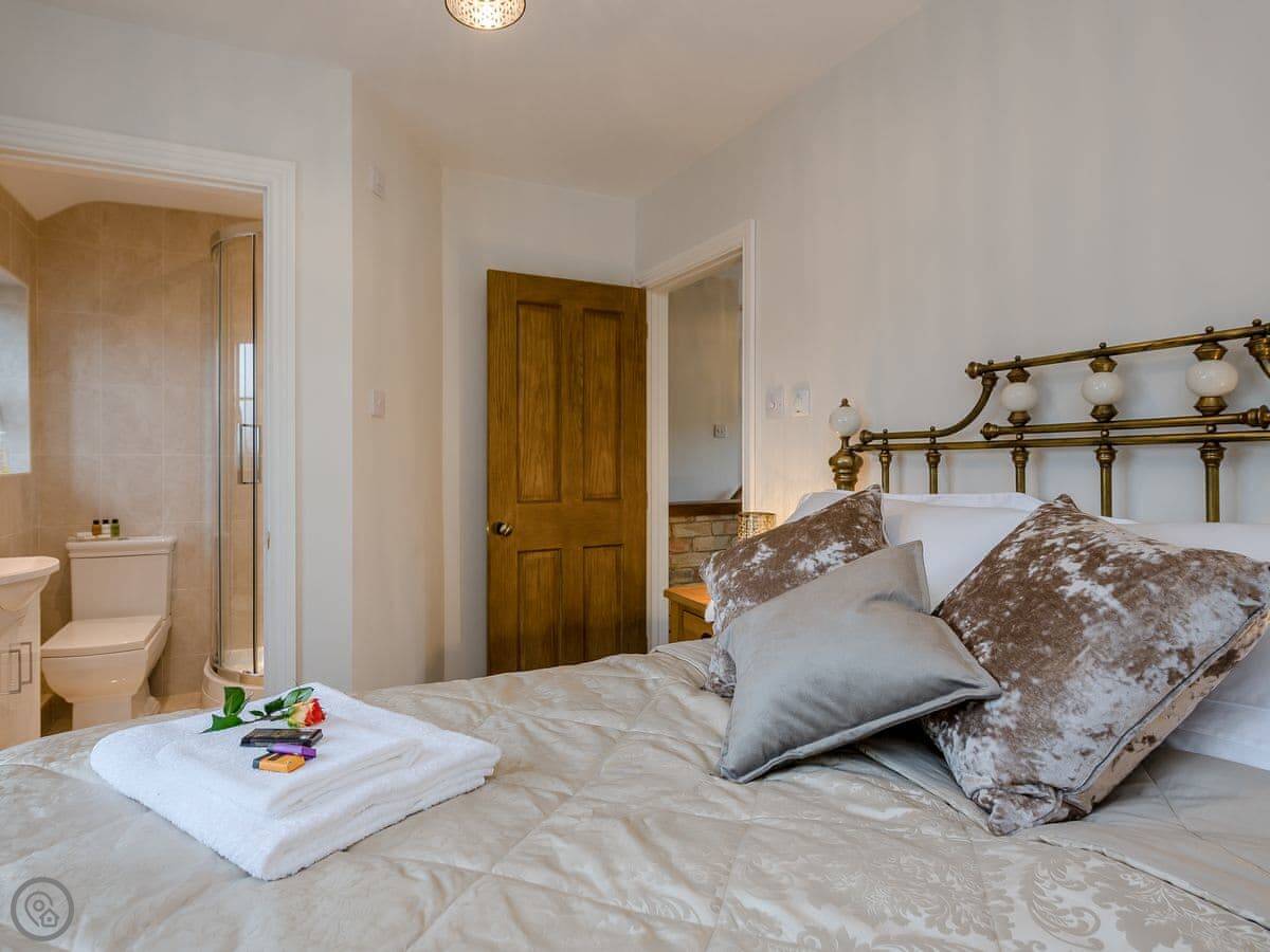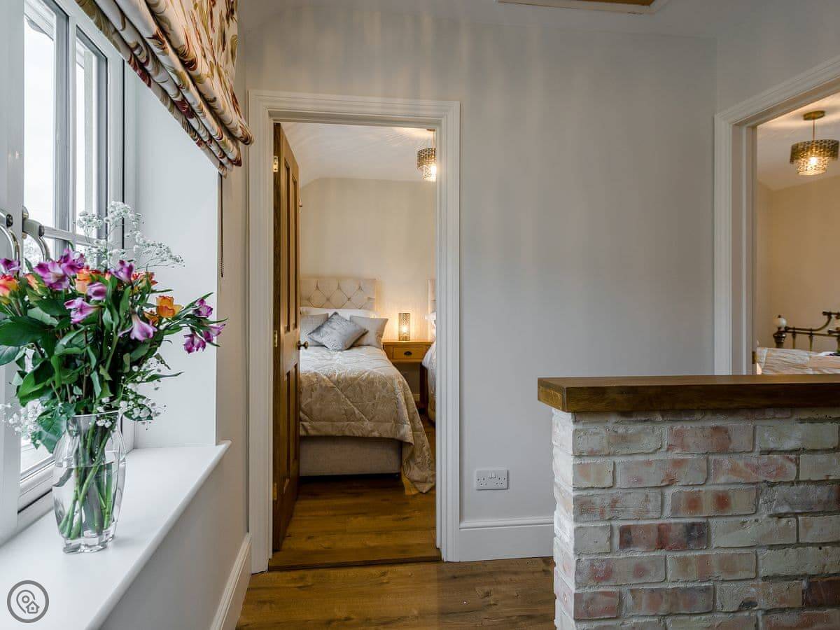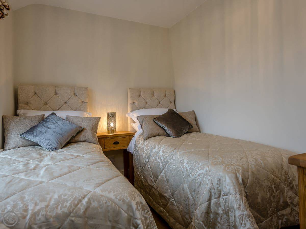 It sleeps six. Three bedrooms, two bathrooms. One of the bathrooms is en-suite to a double bedroom, the other is a big family one with a double shower. Another double room and a twin room make up the three. It's got a 5 Star rating, which means it's been done to a high standard. Everything is new and clean.
