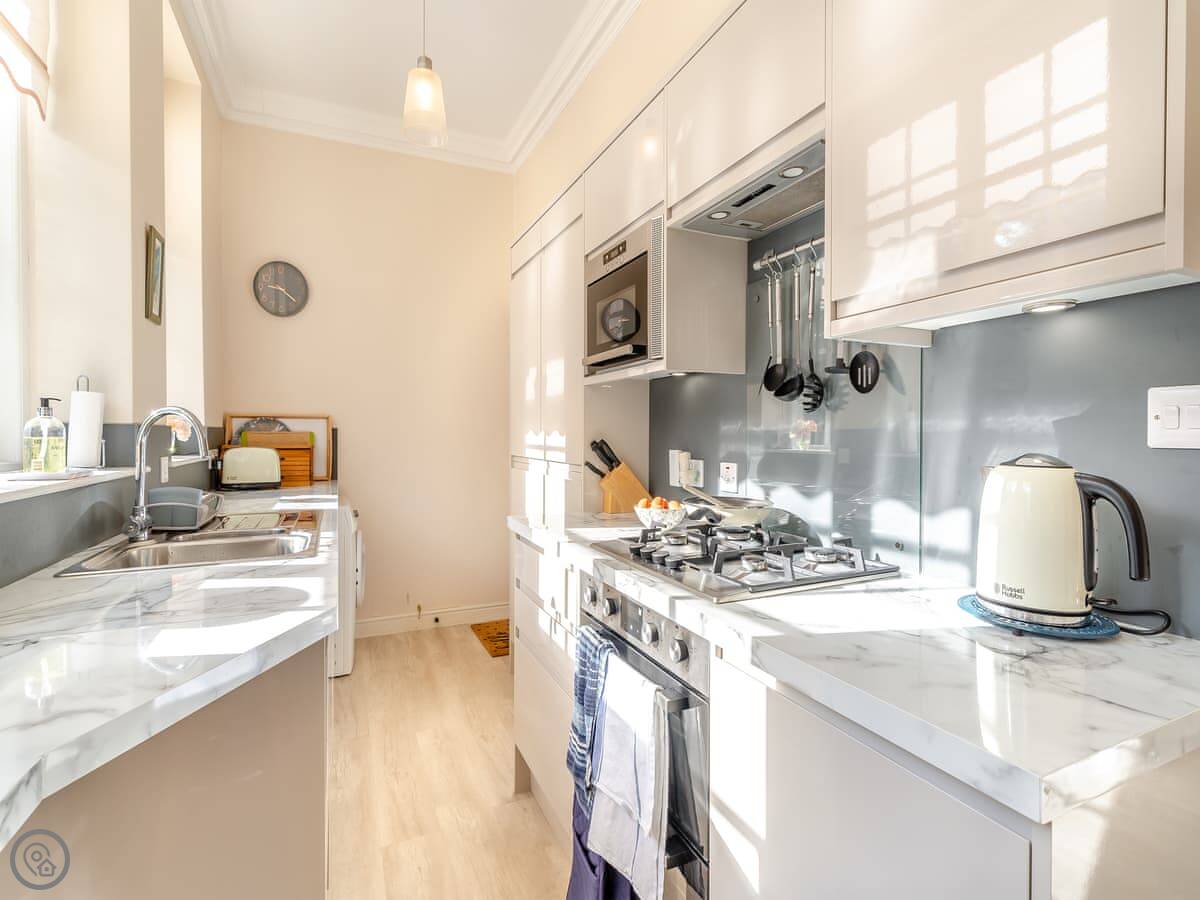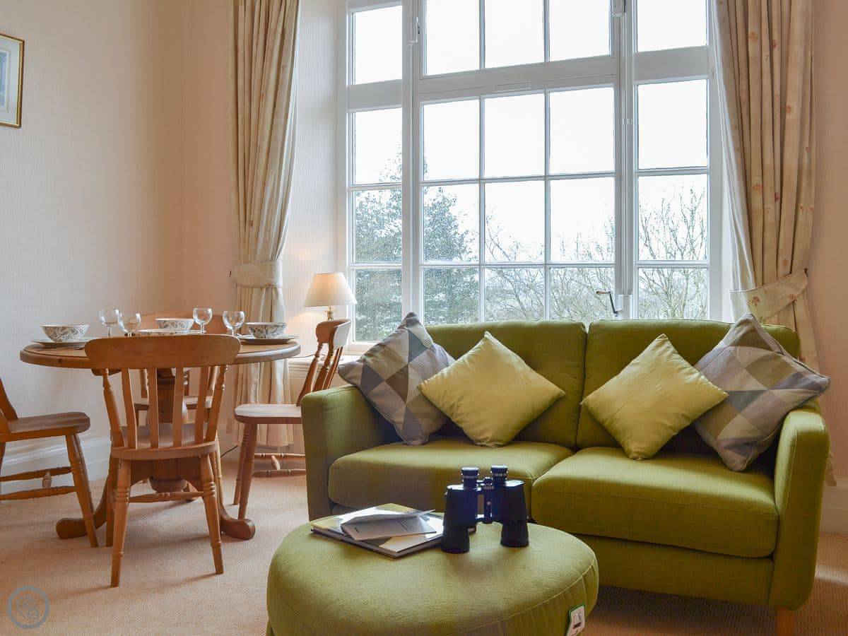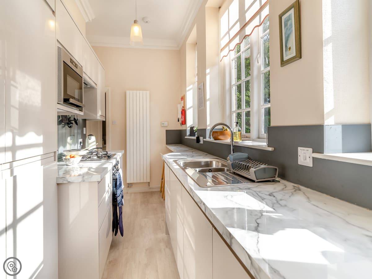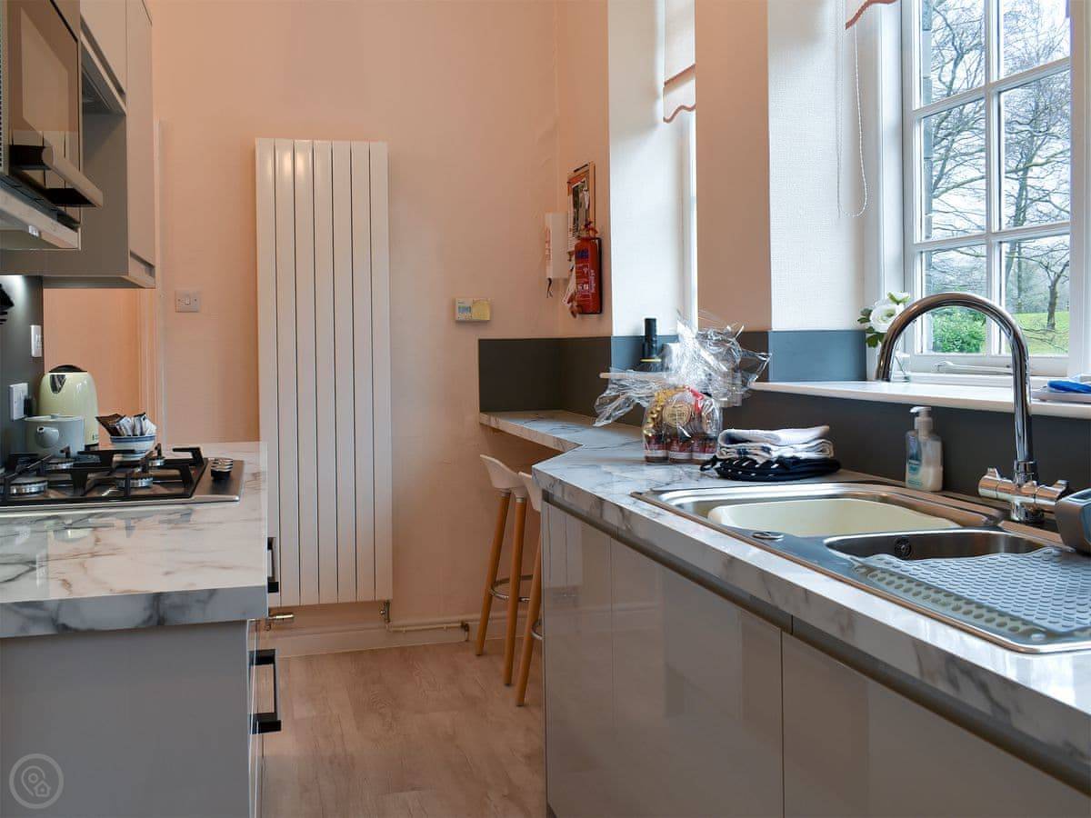 It sleeps four. Two bedrooms, two bathrooms. It's got a 4 Star rating. The place is part of a Victorian manor, so it has high ceilings and big rooms. The kitchen looks out over the communal gardens. We get roe deer through there most days. You get one dedicated parking space, and there are other spots free for more cars.