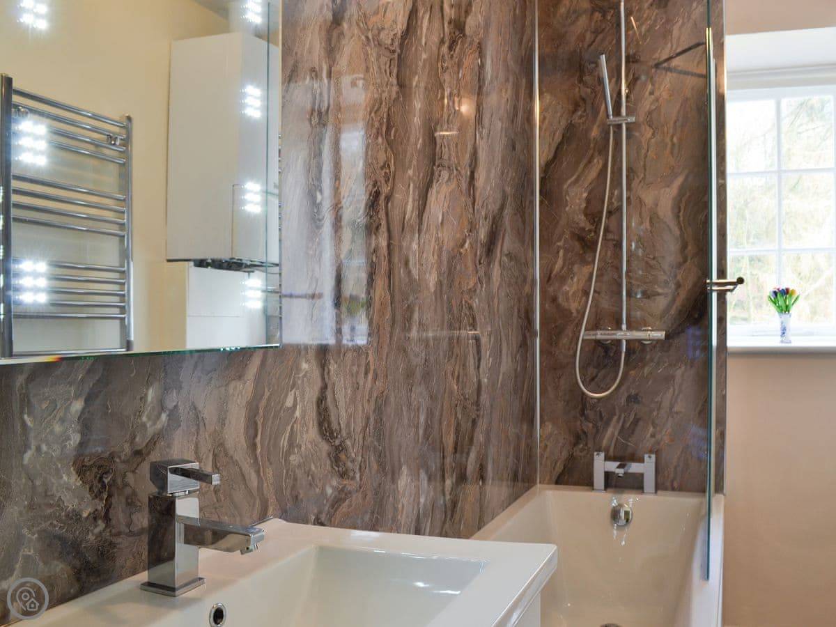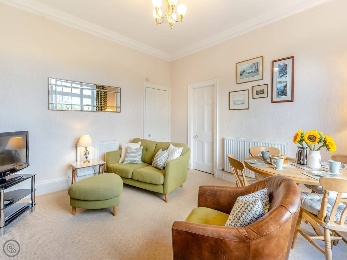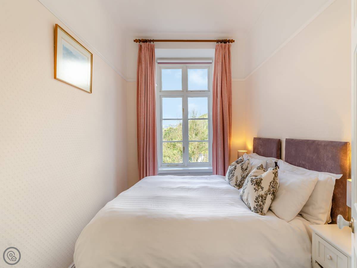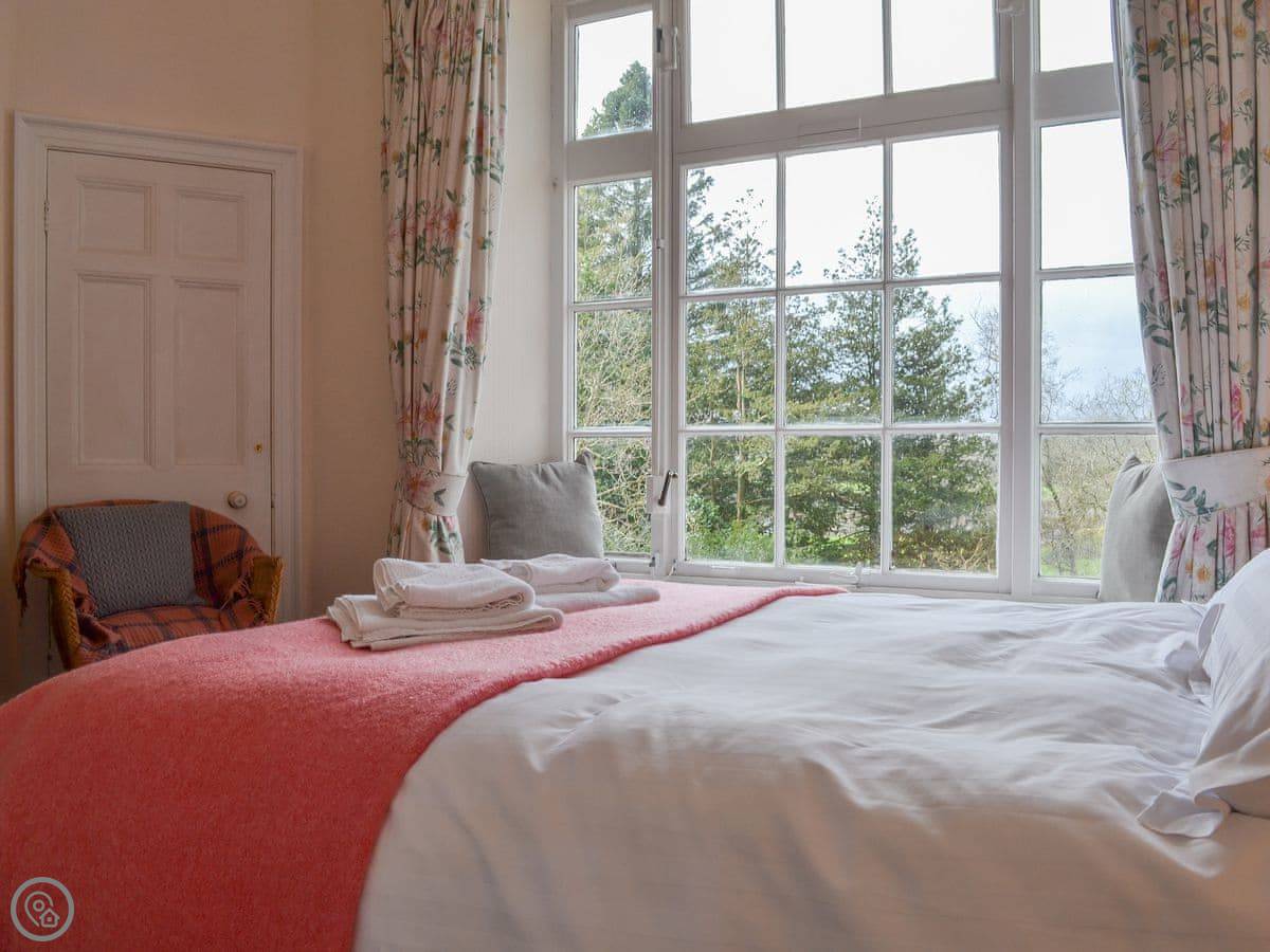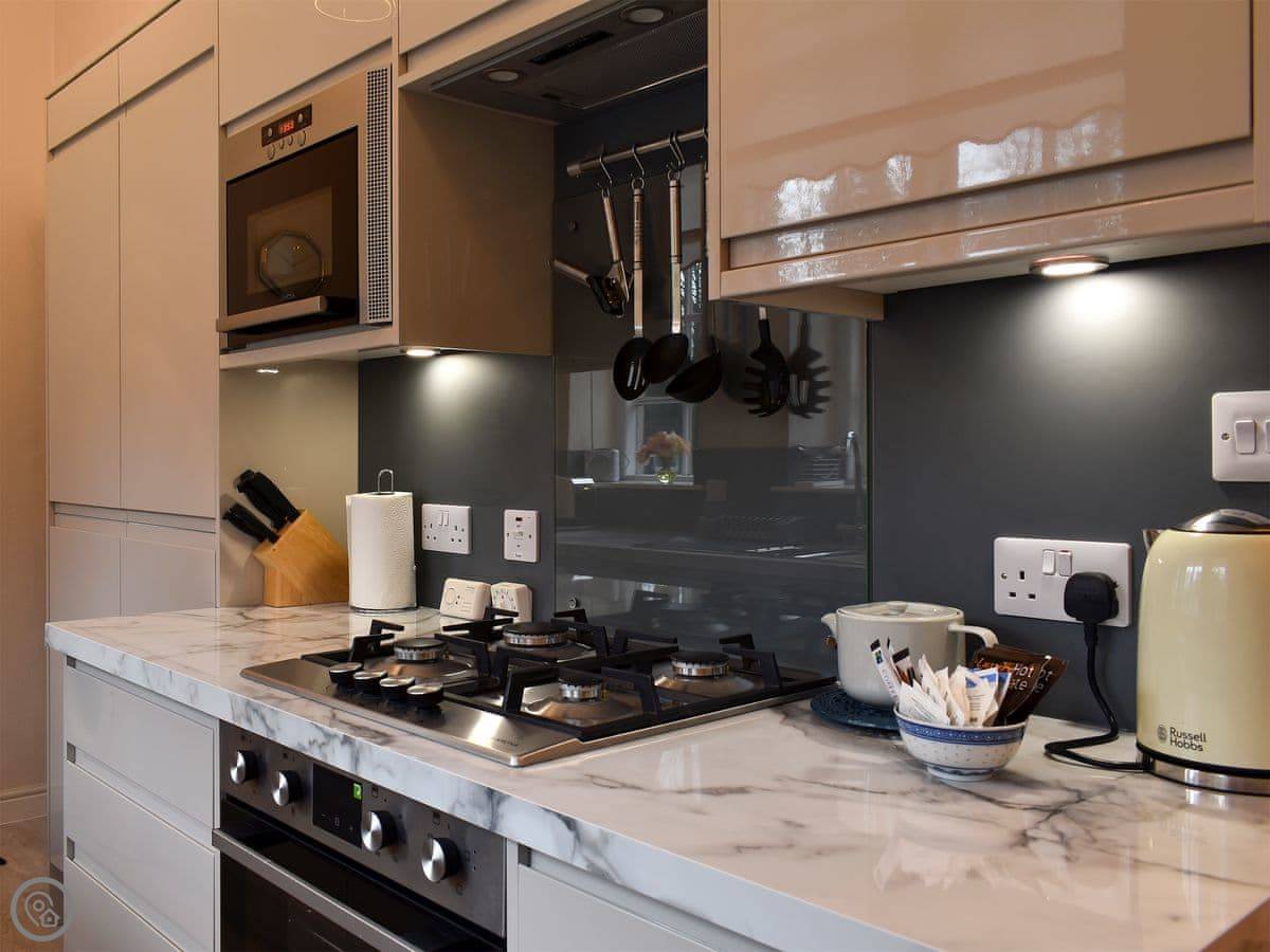 It sleeps four. Two bedrooms, two bathrooms. It's got a 4 Star rating. The place is part of a Victorian manor, so it has high ceilings and big rooms. The kitchen looks out over the communal gardens. We get roe deer through there most days. You get one dedicated parking space, and there are other spots free for more cars.