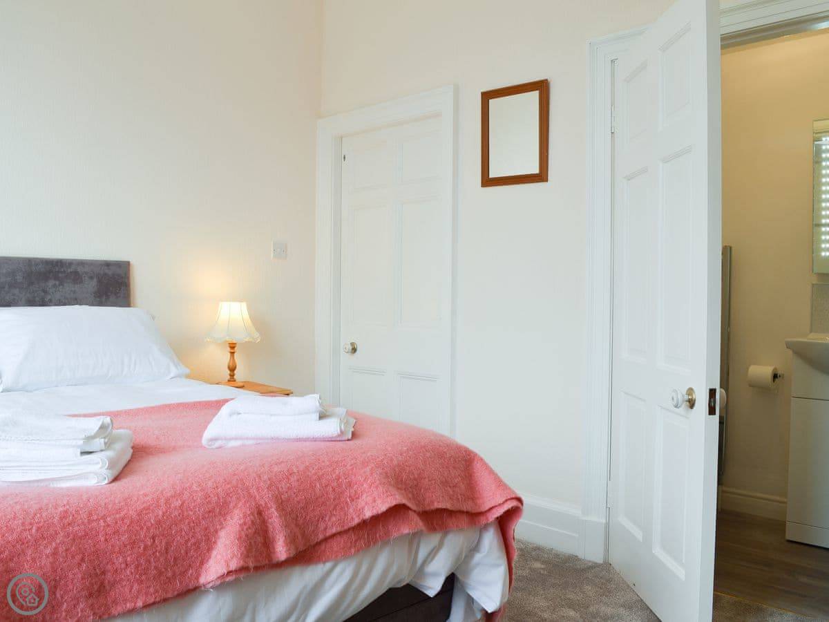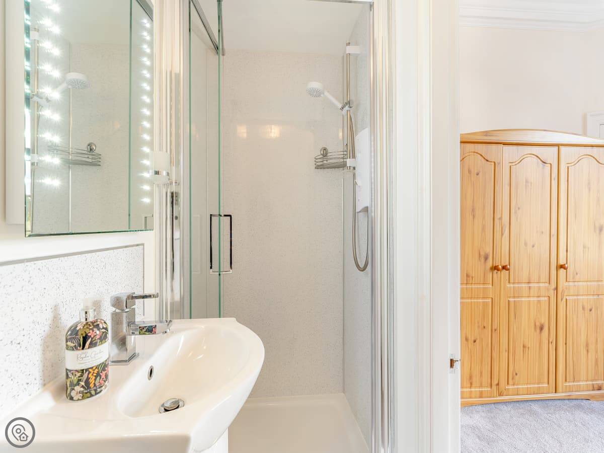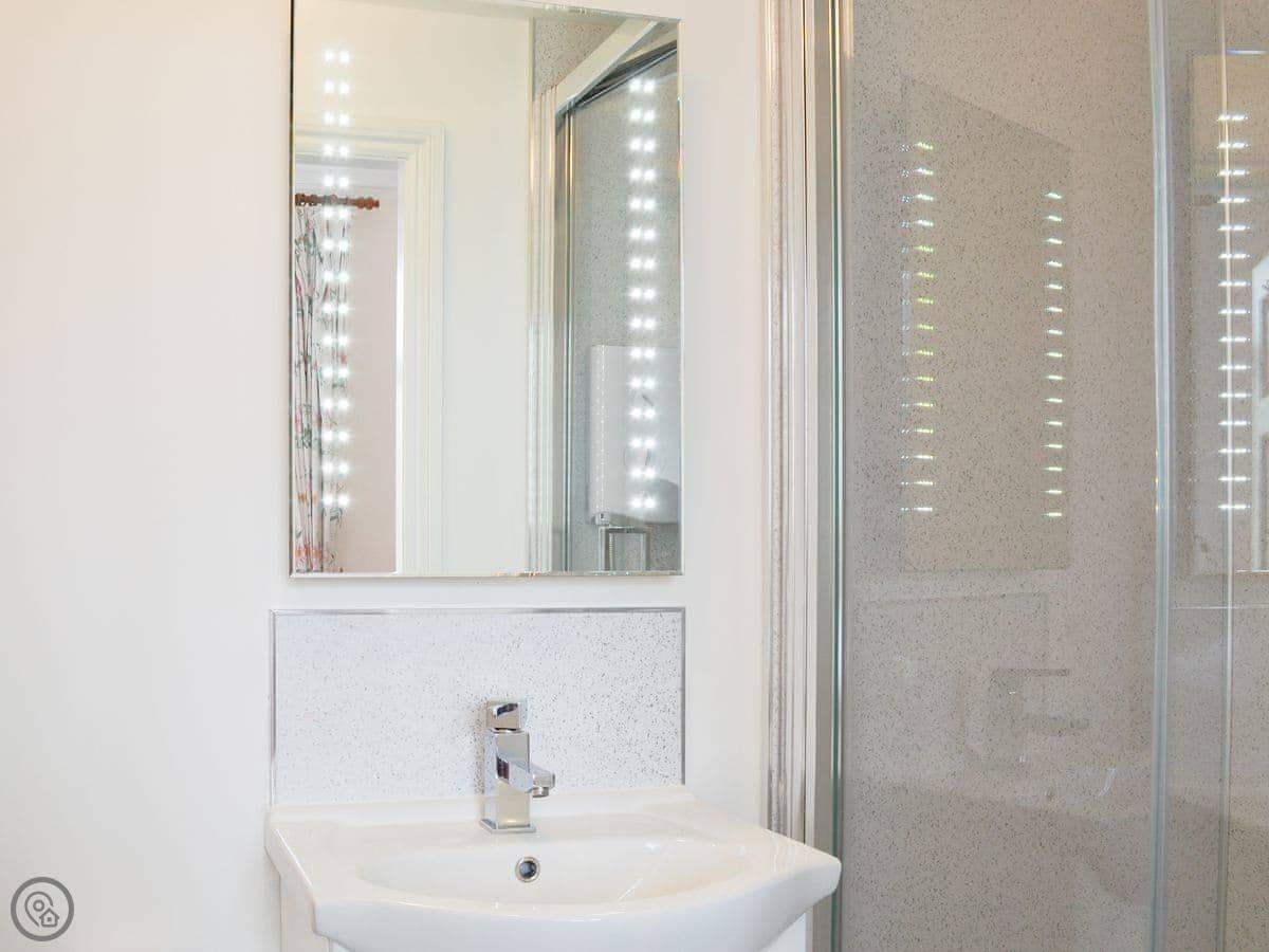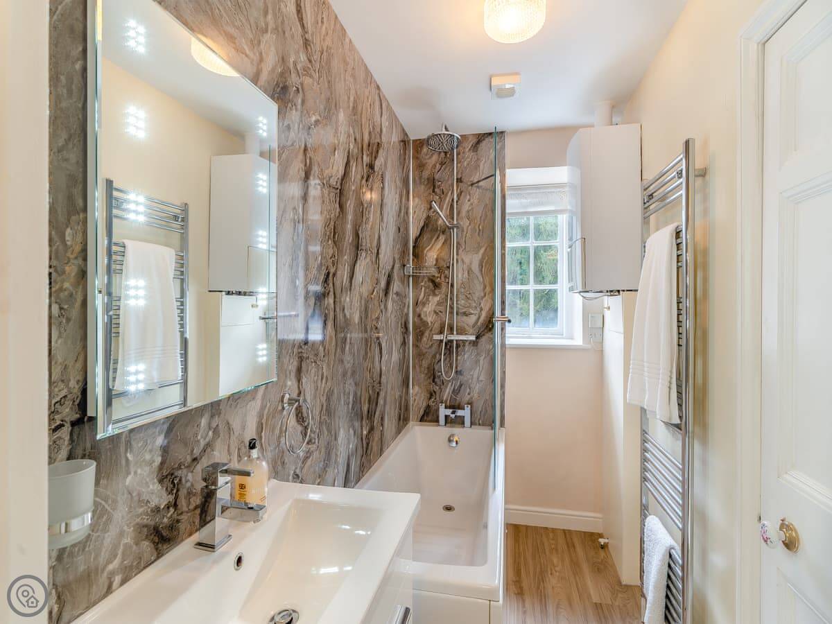 It sleeps four. Two bedrooms, two bathrooms. It's got a 4 Star rating. The place is part of a Victorian manor, so it has high ceilings and big rooms. The kitchen looks out over the communal gardens. We get roe deer through there most days. You get one dedicated parking space, and there are other spots free for more cars.