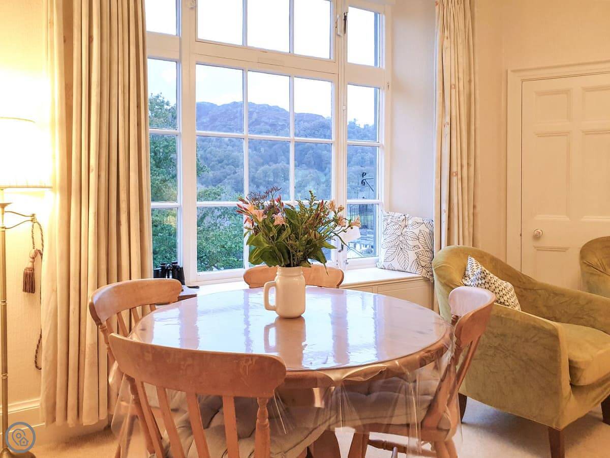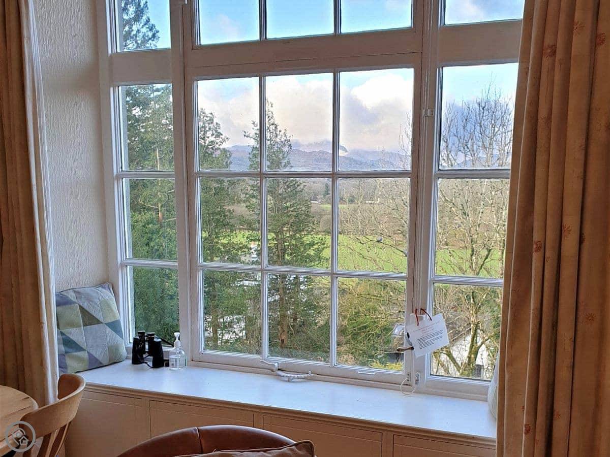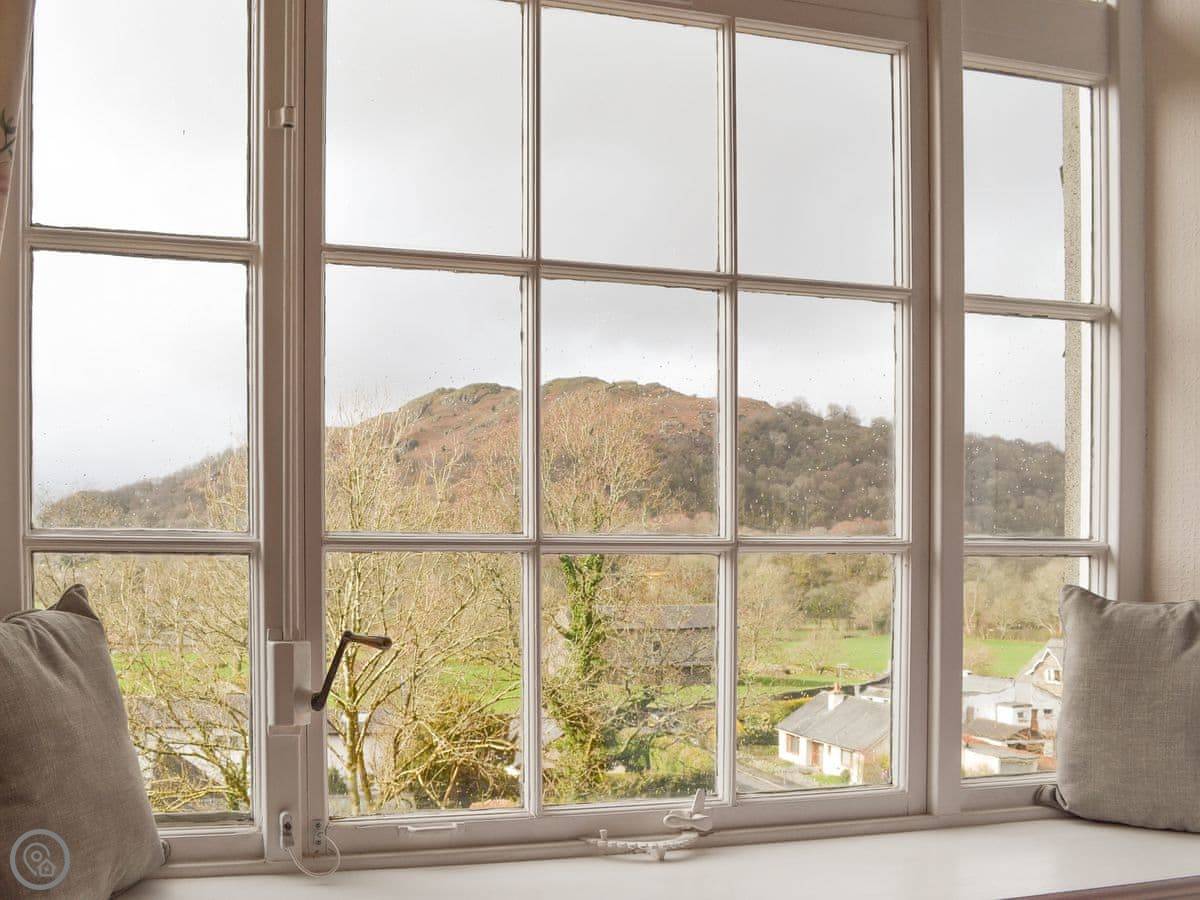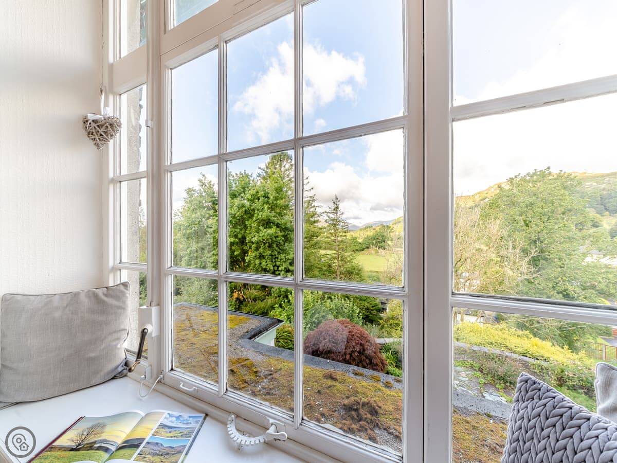 Crag View is a first-floor apartment in a big old house near Ambleside. It's up a bit of a slope, so you get the views. The windows in the living room face west, so you can see the fells and the sunsets. You can just see a sliver of Windermere from the window seats.