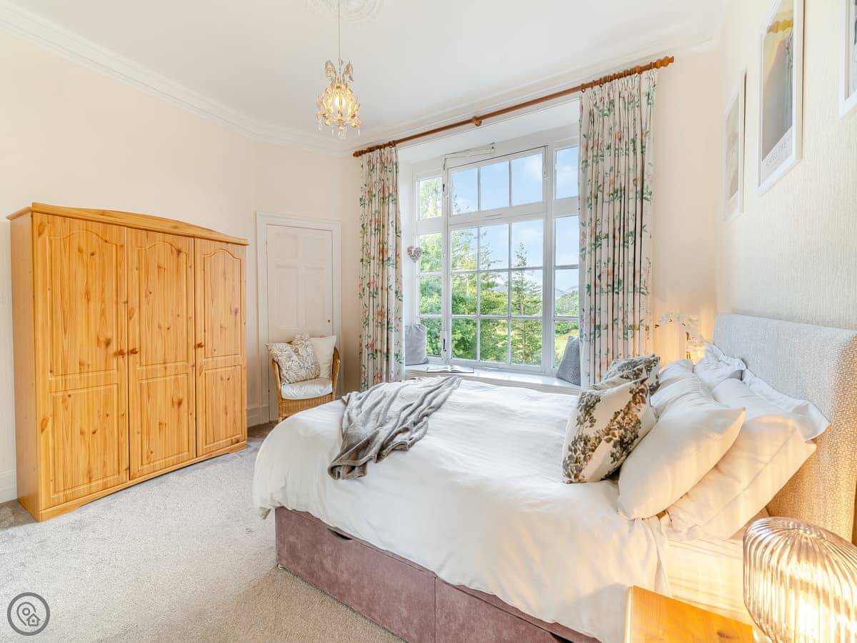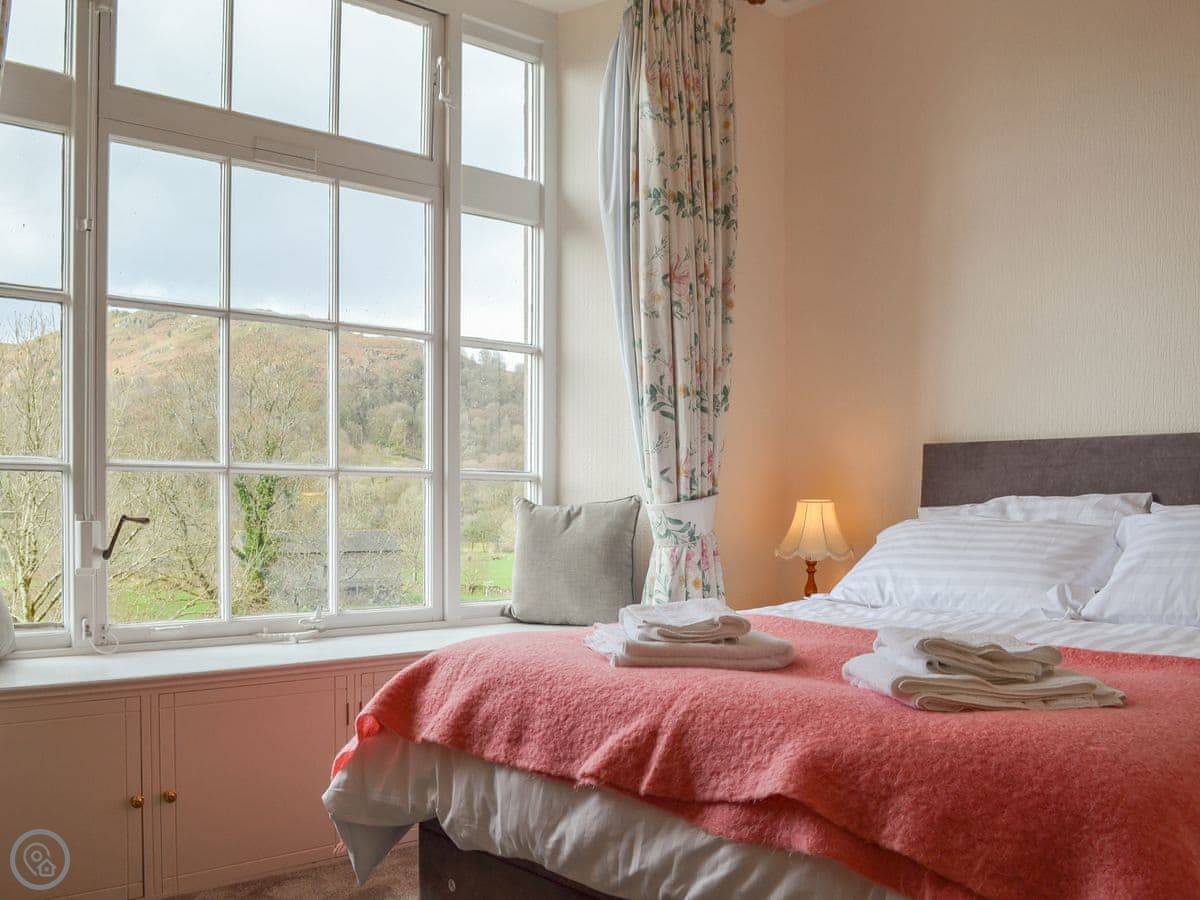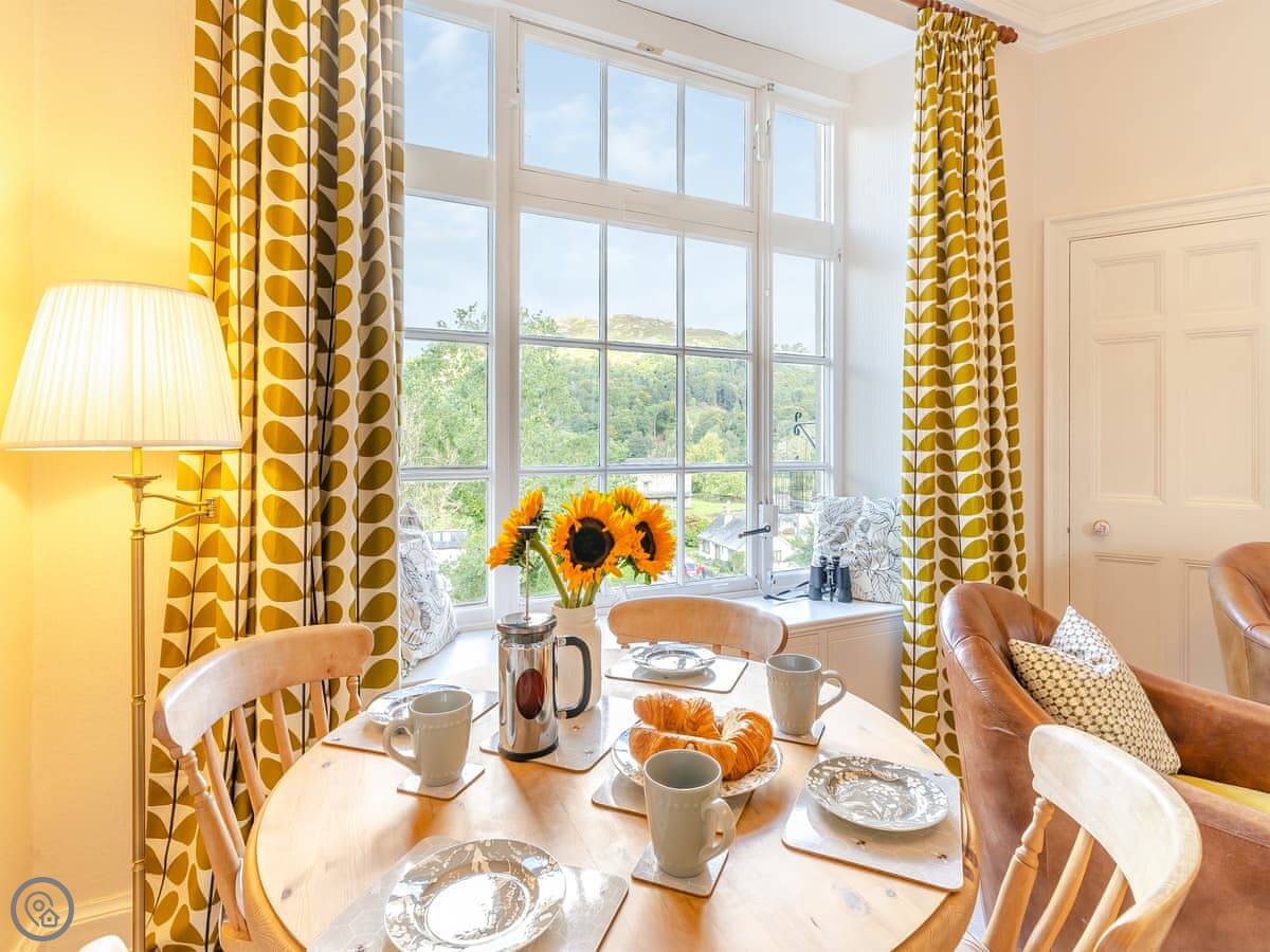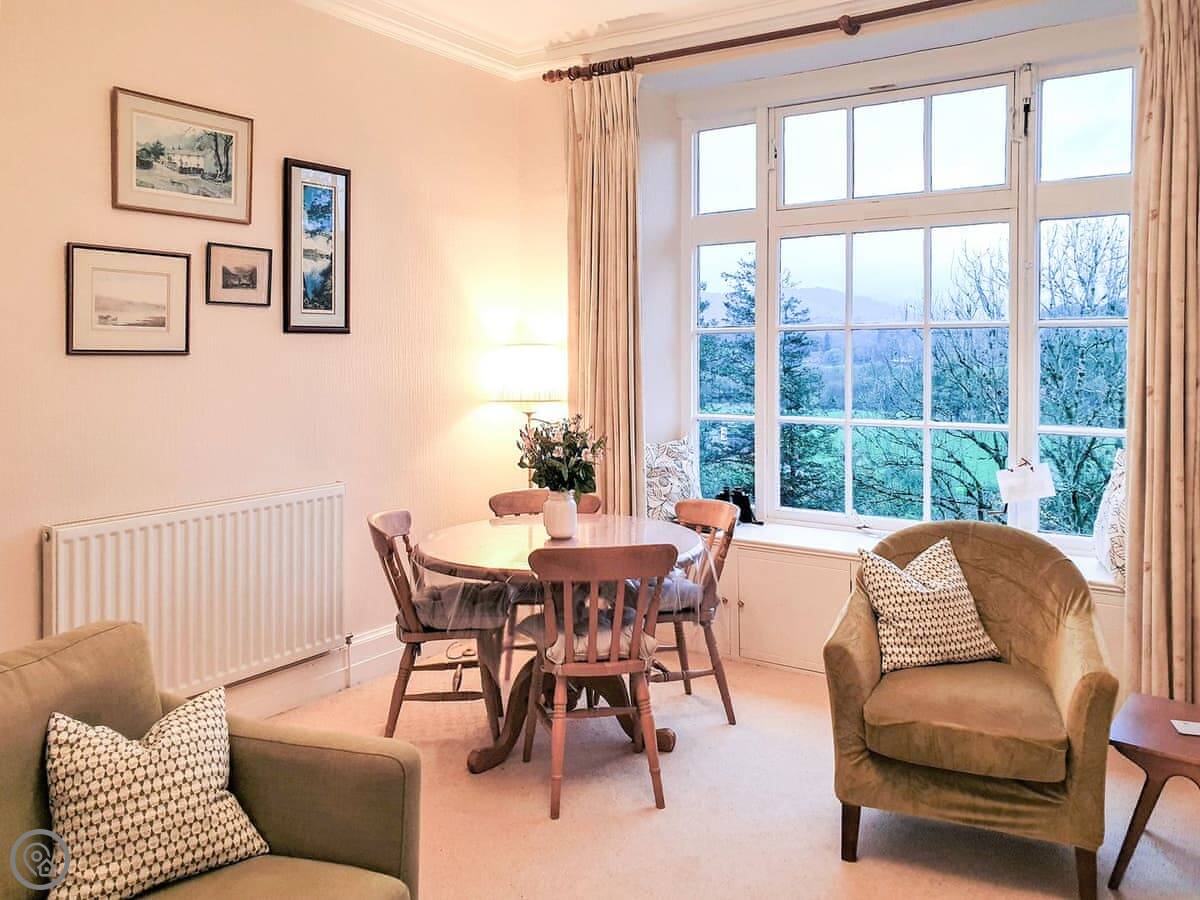 Crag View is a first-floor apartment in a big old house near Ambleside. It's up a bit of a slope, so you get the views. The windows in the living room face west, so you can see the fells and the sunsets. You can just see a sliver of Windermere from the window seats.