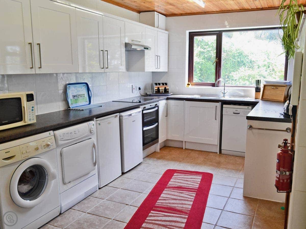For facilities: it's got parking, WiFi, a washing machine, a dishwasher, and a wood burner. Bedding and towels are included. We allow two dogs.