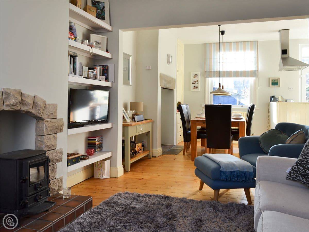 The main living space downstairs is open plan. Kitchen, dining area, and sitting area all together. There's a gas stove that looks like a wood burner. Floors are oak. The front faces the quiet street, and there's on-road parking. The back has an enclosed courtyard garden.