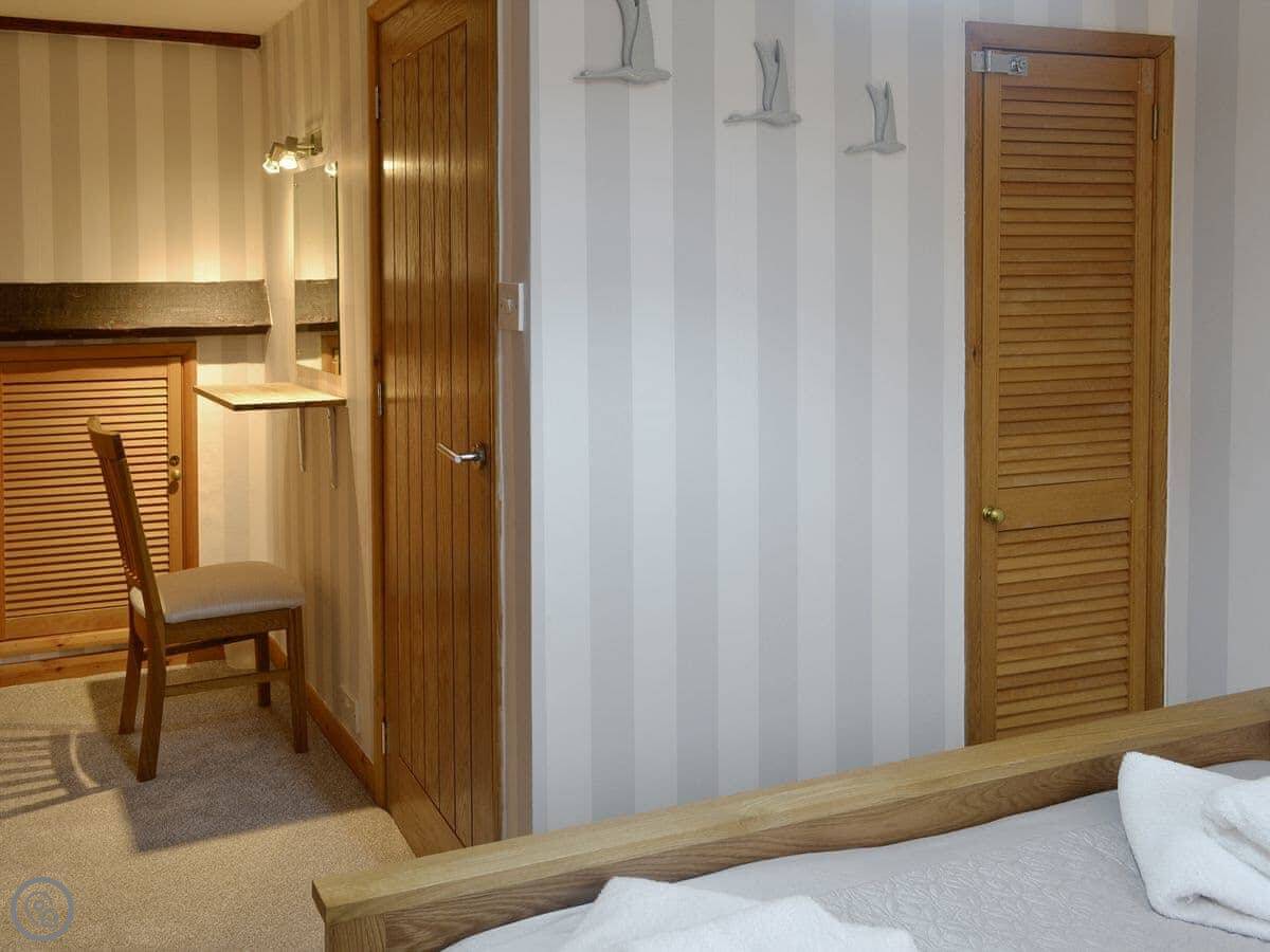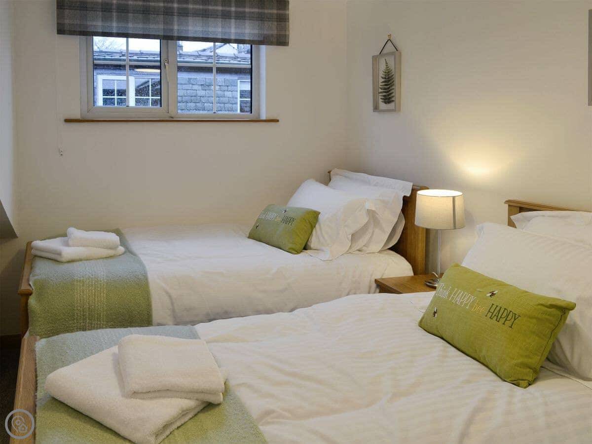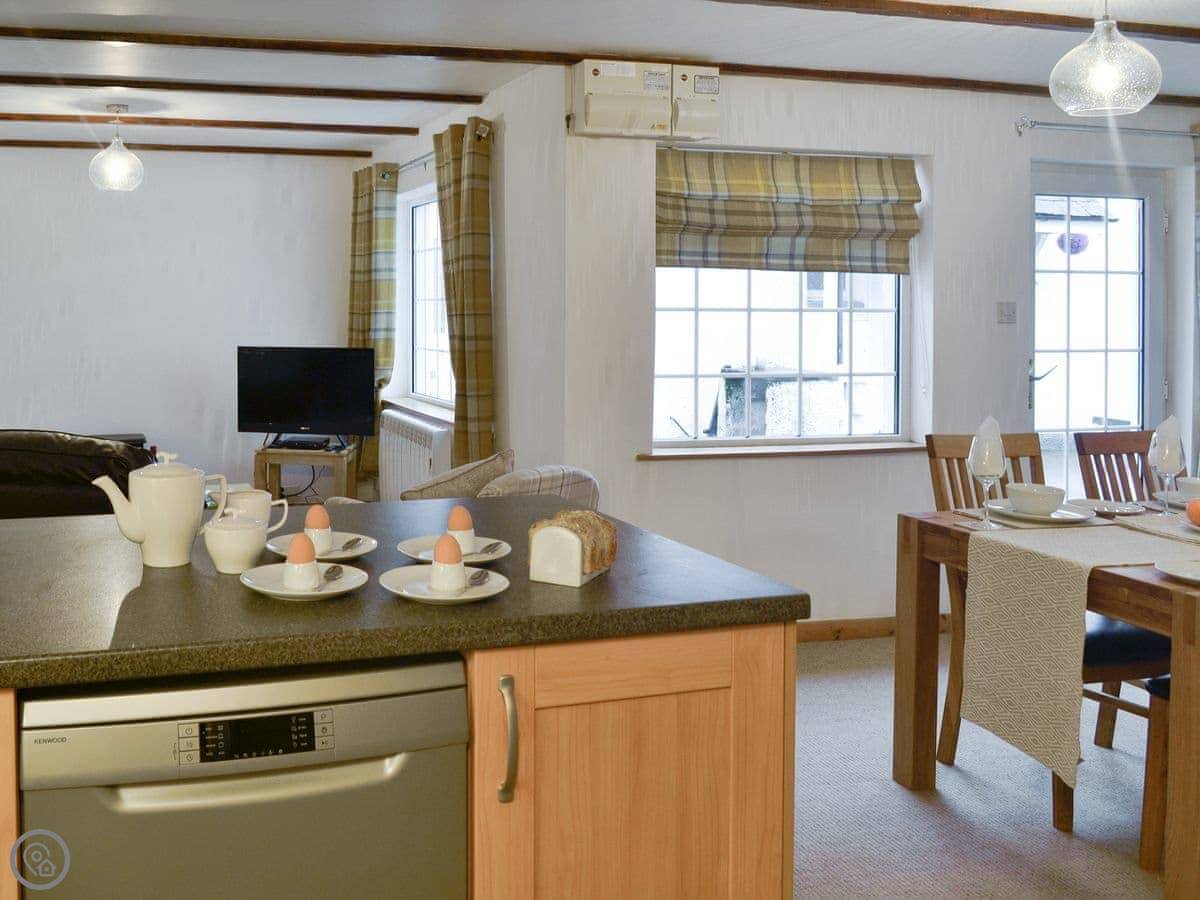 A lot of thought and care has gone into the finish of the interior design and it has been furnished and decorated to a very good standard with guest comfort high on the list of priorities. The open plan ground floor is a great social living space; the shape of which still allows those cosy nights by the fire. The position of the well-equipped kitchen area, near to the spacious dining area, provides the perfect space for guests to be together whilst preparing food and dining. The staircase splits half way up and leads to two elegantly designed bedrooms located on the first floor, with a kingsize bed in one and twin beds in the other; both have plenty of wardrobe space. The property will be decorated for those looking to arrive over the festive season.