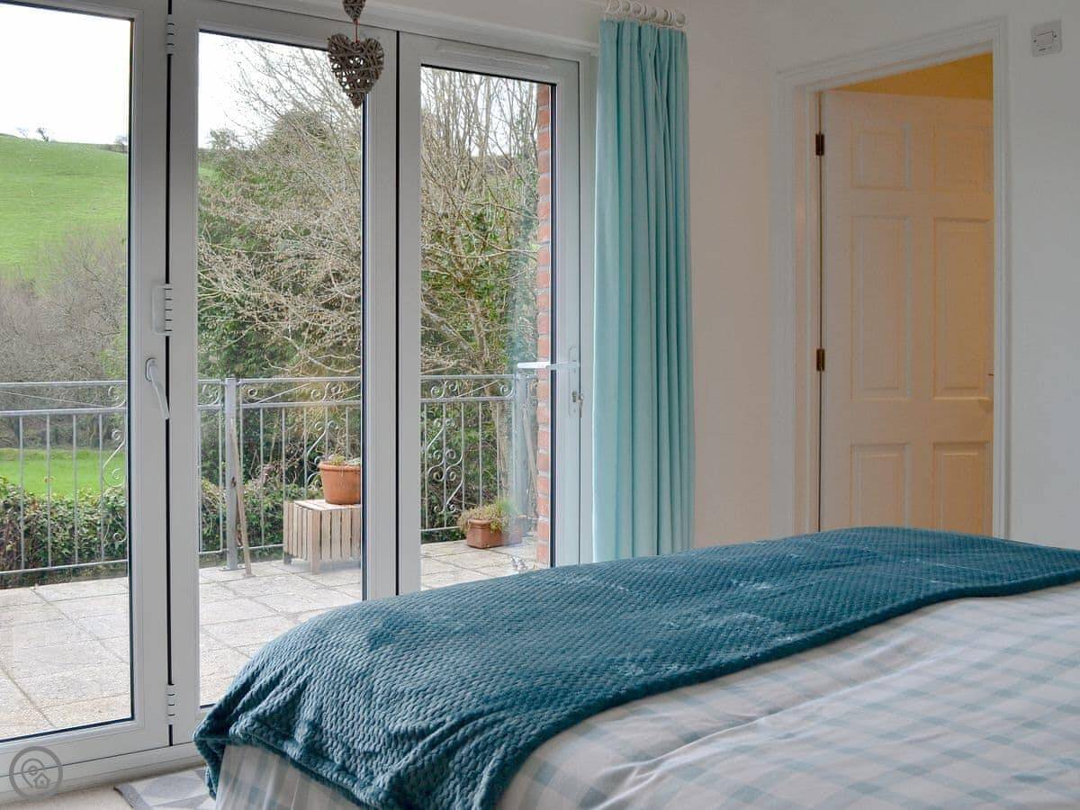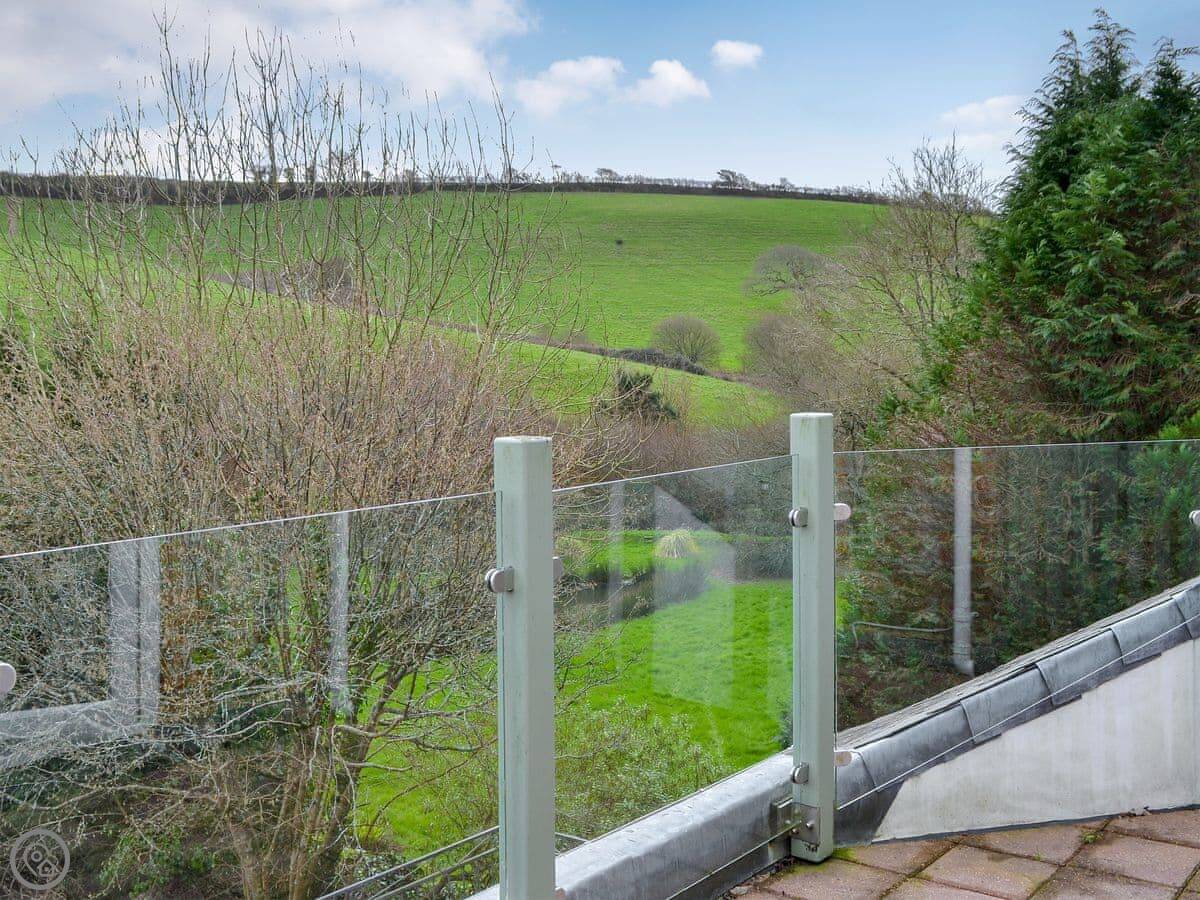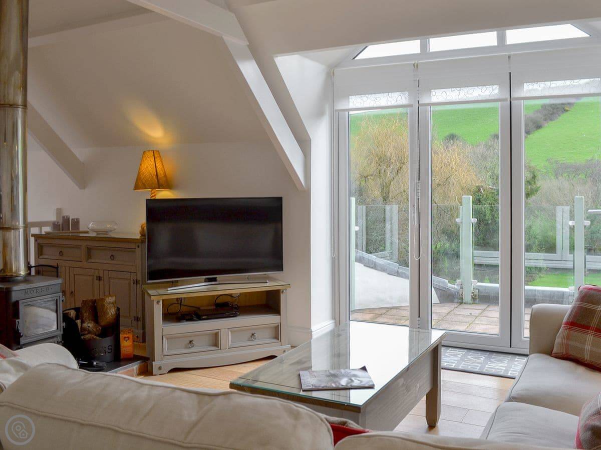 The living area is open plan upstairs, with big doors that open onto a balcony. You can sit out there. It looks over the fields. There's a wood burner for cooler evenings.