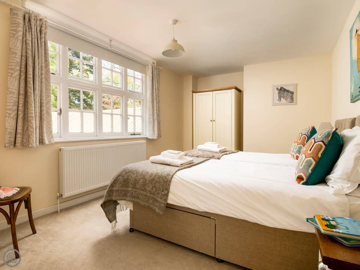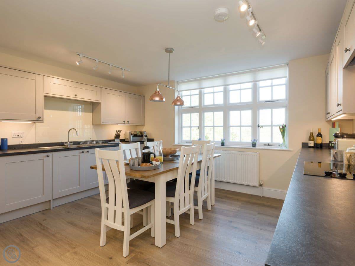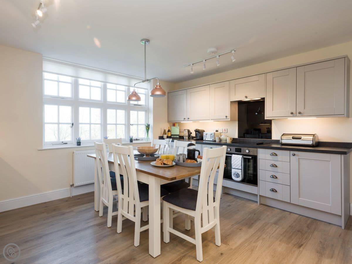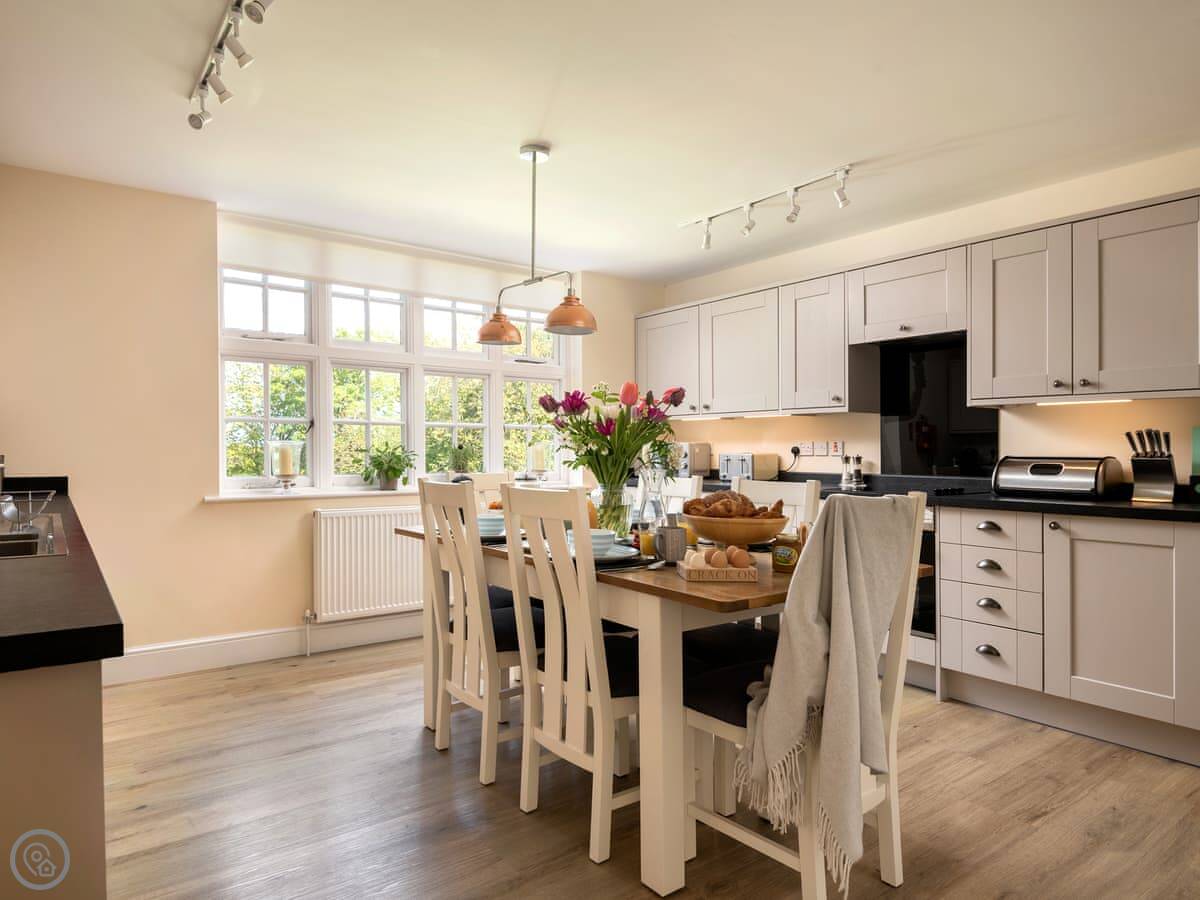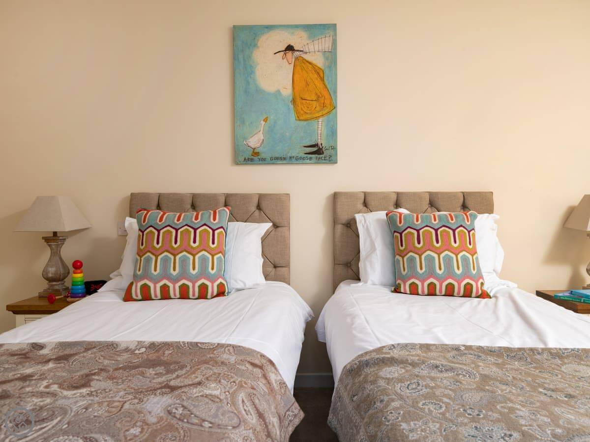 It sleeps four. Two bedrooms and two bathrooms, which is handy. You can bring up to two dogs. There's a welcome pack with some basics like milk and bread when you arrive.