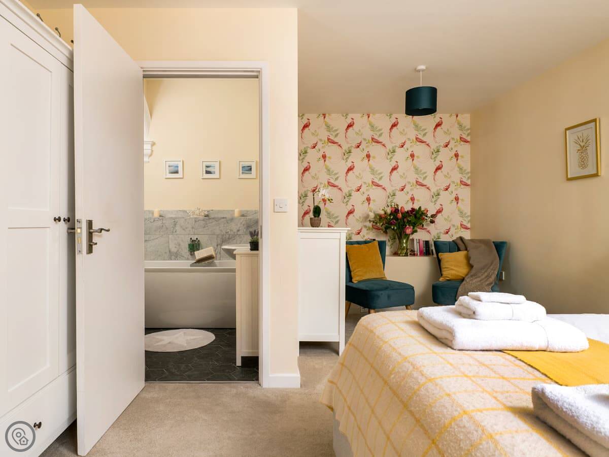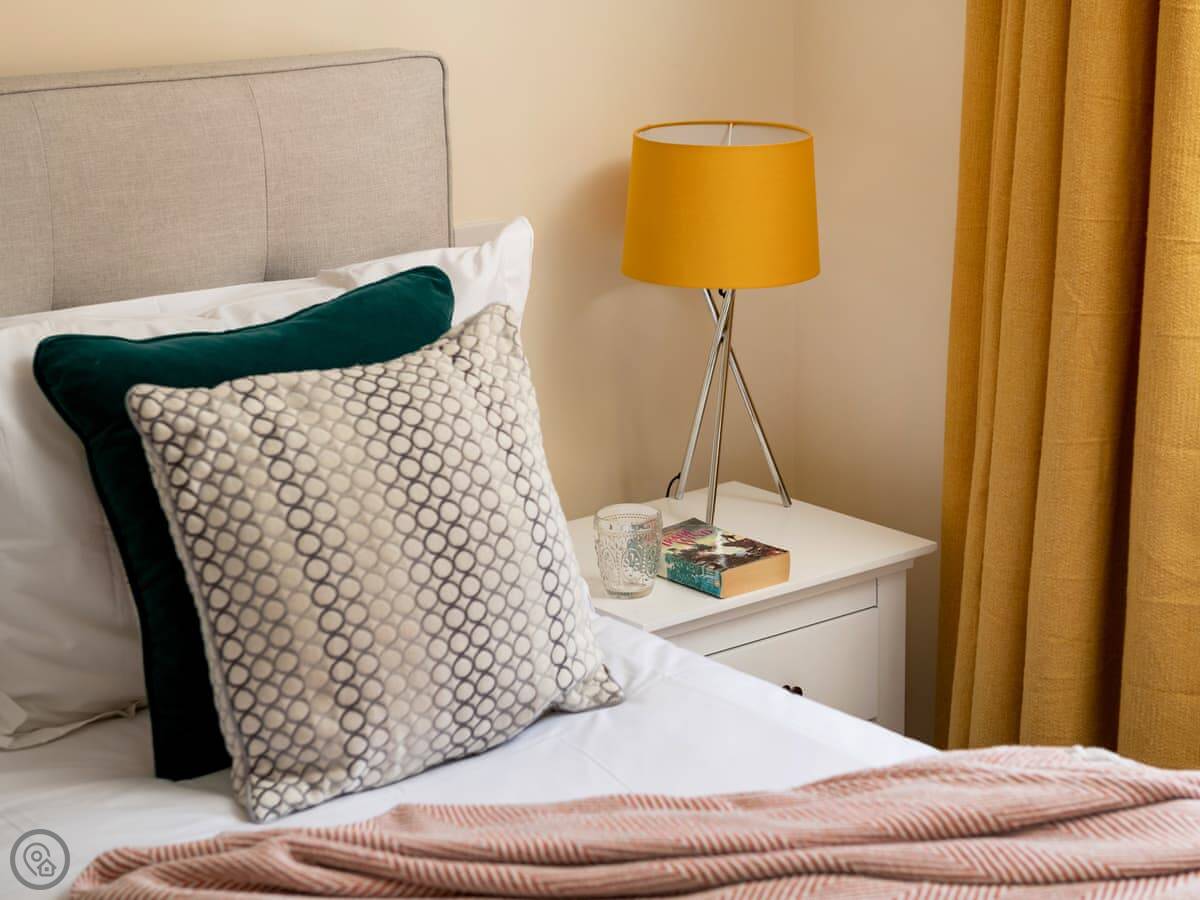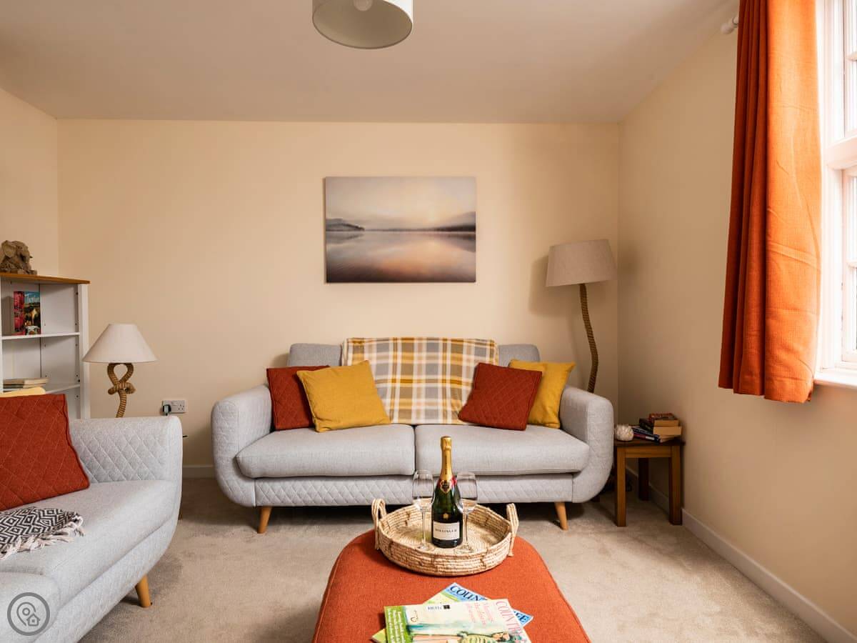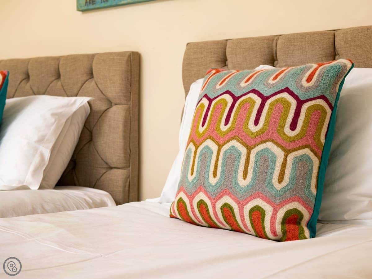 It sleeps four. Two bedrooms and two bathrooms, which is handy. You can bring up to two dogs. There's a welcome pack with some basics like milk and bread when you arrive.