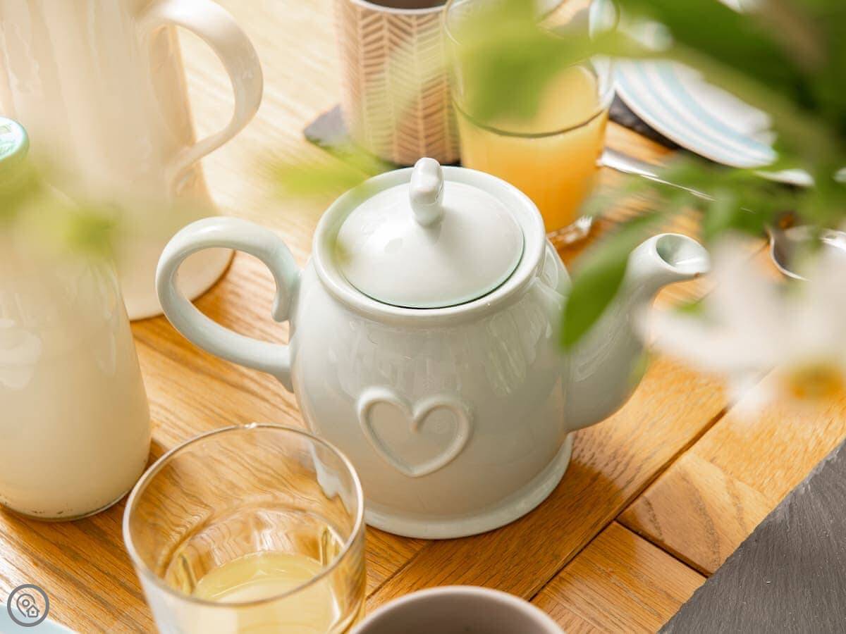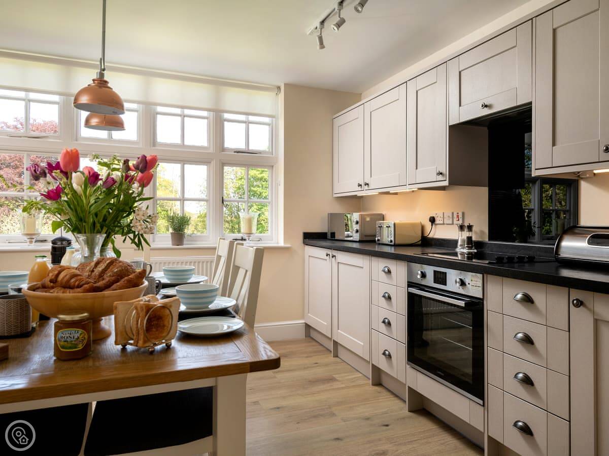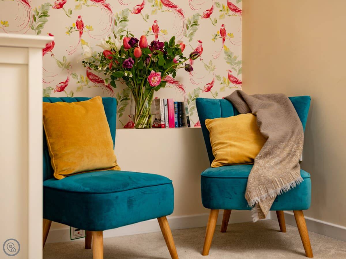 Inside, it's got a washing machine, dishwasher, wifi and TV. Bedding and towels are included. There's a cot and highchair if needed. The heating and hot water work well. The stairs are normal, nothing tricky.