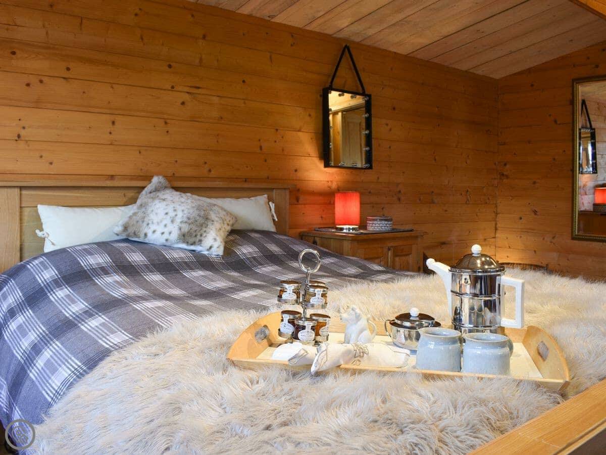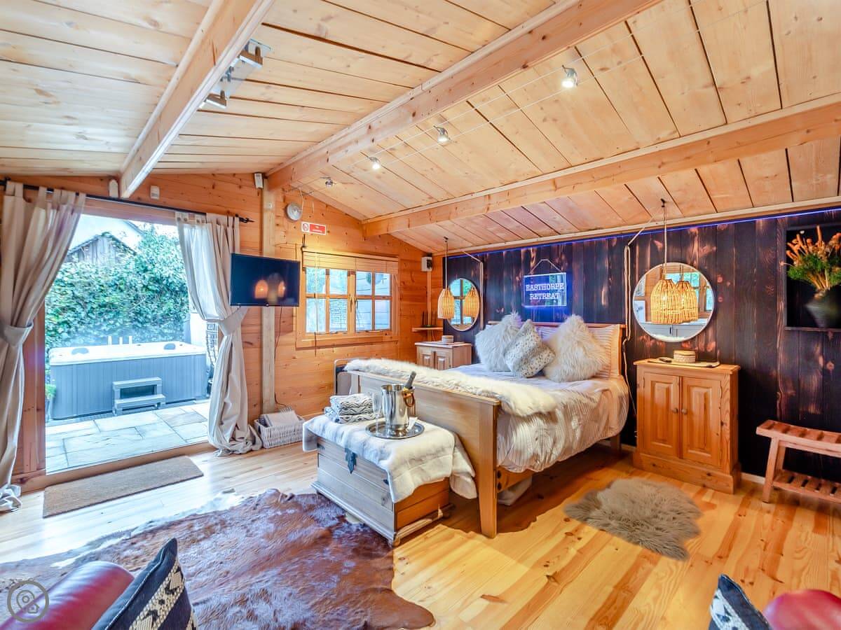 Easthorpe is a small picturesque village located 7 miles south west of Colchester on an old Roman road. Nestled in the stunning rural Essex countryside, Easthorpe Retreat is an idyllic haven for couples wanting to escape, relax and unwind. This cosy log cabin is situated within the owners’ grounds but has a secluded setting. It has an enclosed courtyard garden and exclusive use of a hot tub. The cabin has a sumptuous large bedroom, a small but adequate kitchen with dining and seating areas, and a shower room with complementary toiletries.