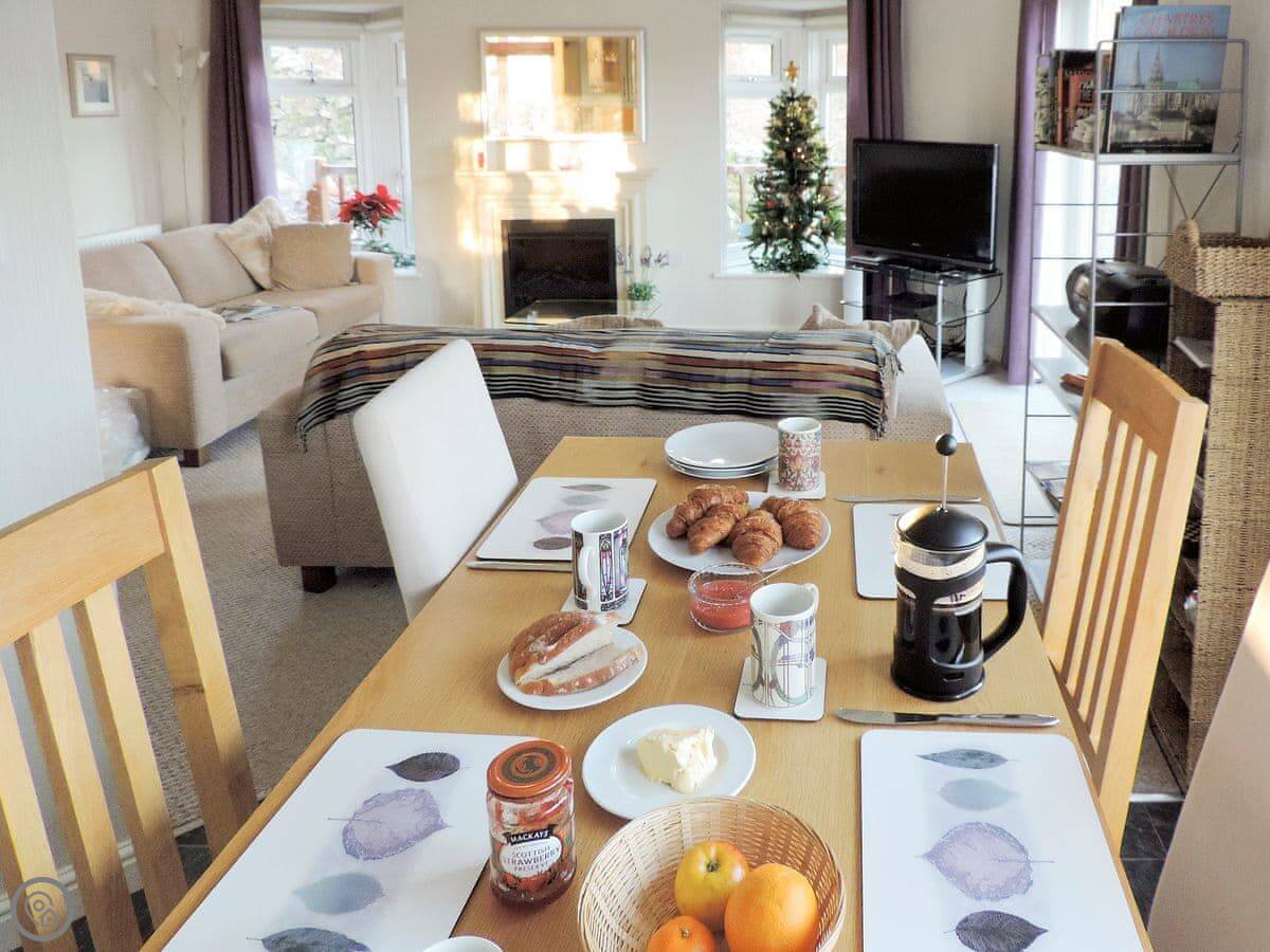 The deck looks out over trees towards the Coniston fells. You can't see the water from here, but Coniston Water is a five minute drive away. The parking and path up to the front door are on a bit of a slope. It's fine, but you should know.