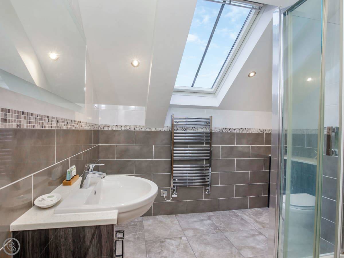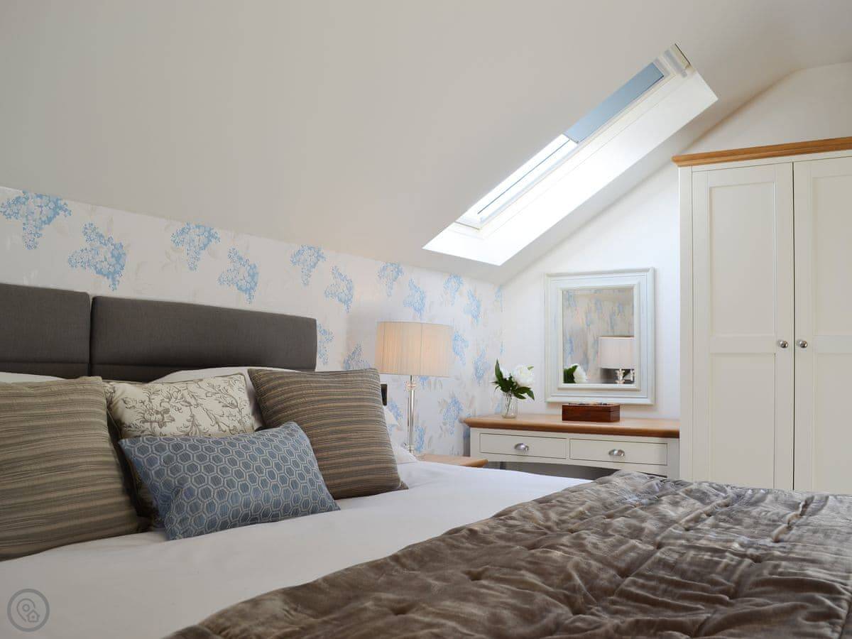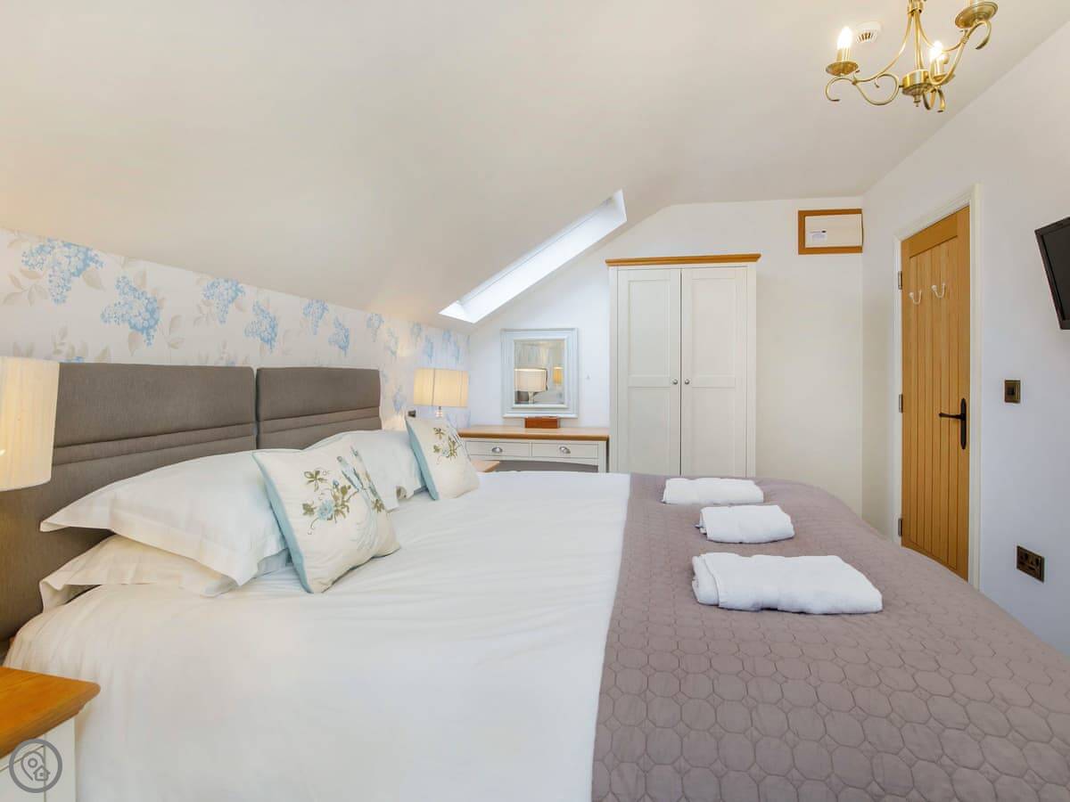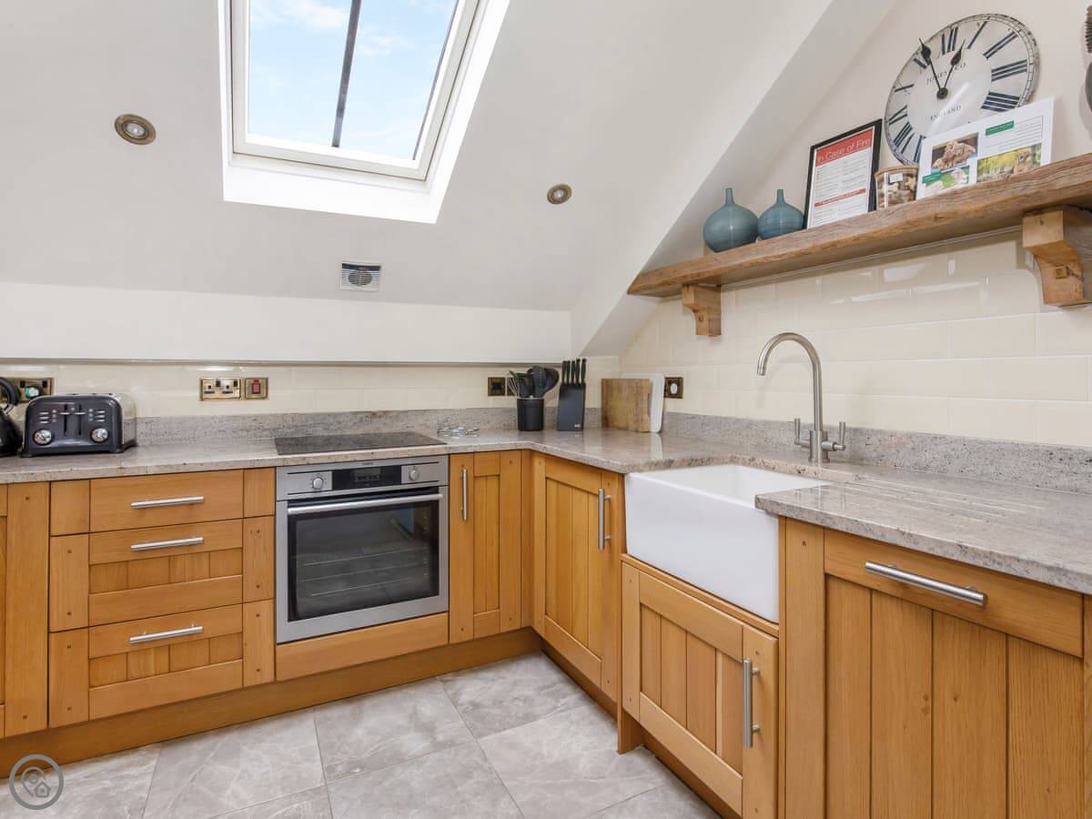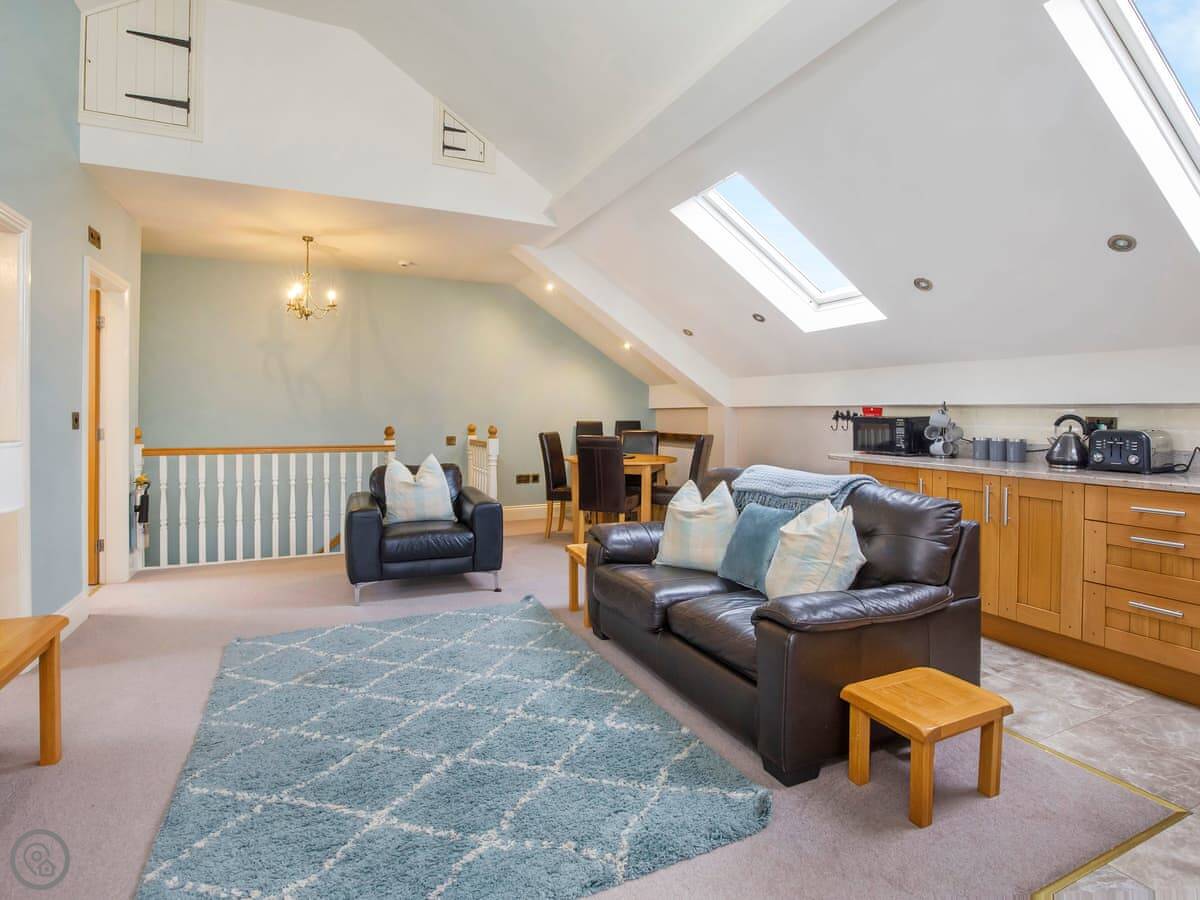 It sleeps six, with three bedrooms. Two of the bedrooms are downstairs, one super kingsize and one twin. There's a shower room downstairs too. The main living space is upstairs. That's the open plan kitchen, dining and sitting area. It has sloping ceilings and velux windows, so it's bright. There's a Juliet balcony. The kitchen has granite worktops and a Belfast sink. The third bedroom, a kingsize, is also upstairs, along with the main shower room.