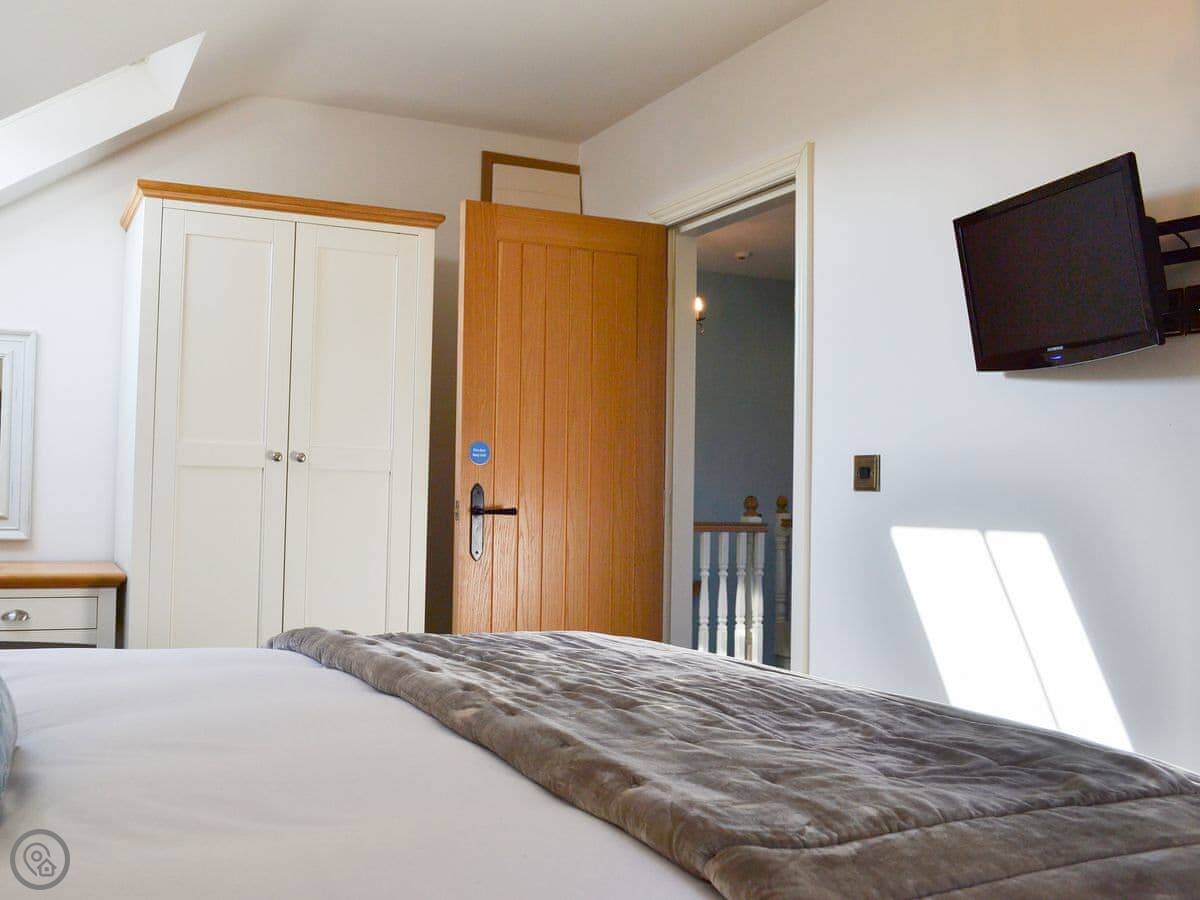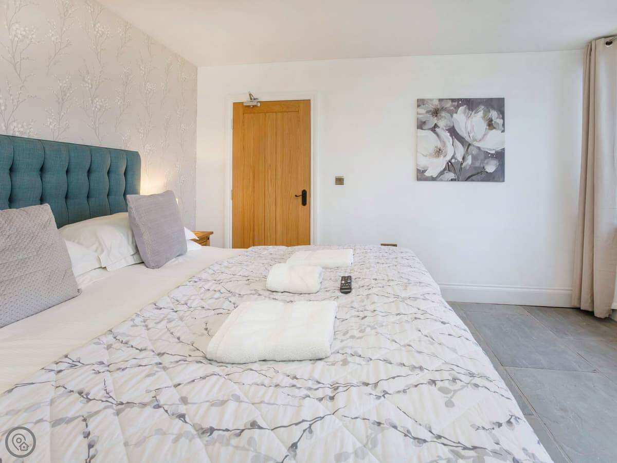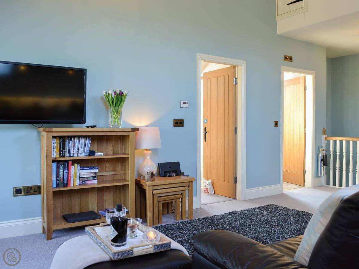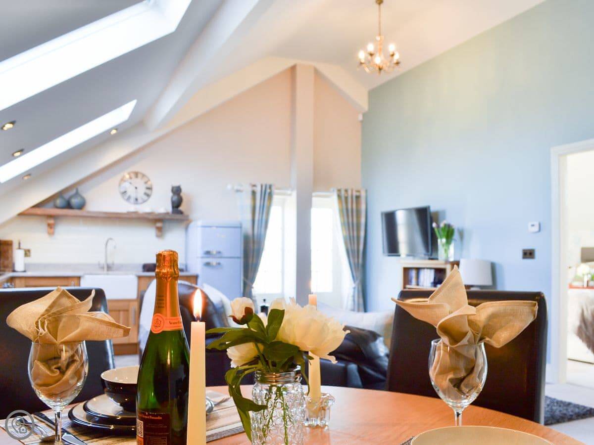 It sleeps six, with three bedrooms. Two of the bedrooms are downstairs, one super kingsize and one twin. There's a shower room downstairs too. The main living space is upstairs. That's the open plan kitchen, dining and sitting area. It has sloping ceilings and velux windows, so it's bright. There's a Juliet balcony. The kitchen has granite worktops and a Belfast sink. The third bedroom, a kingsize, is also upstairs, along with the main shower room.