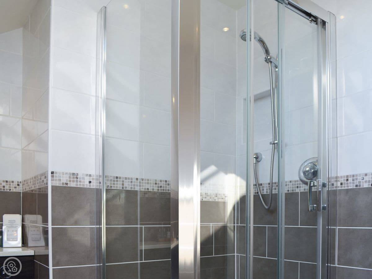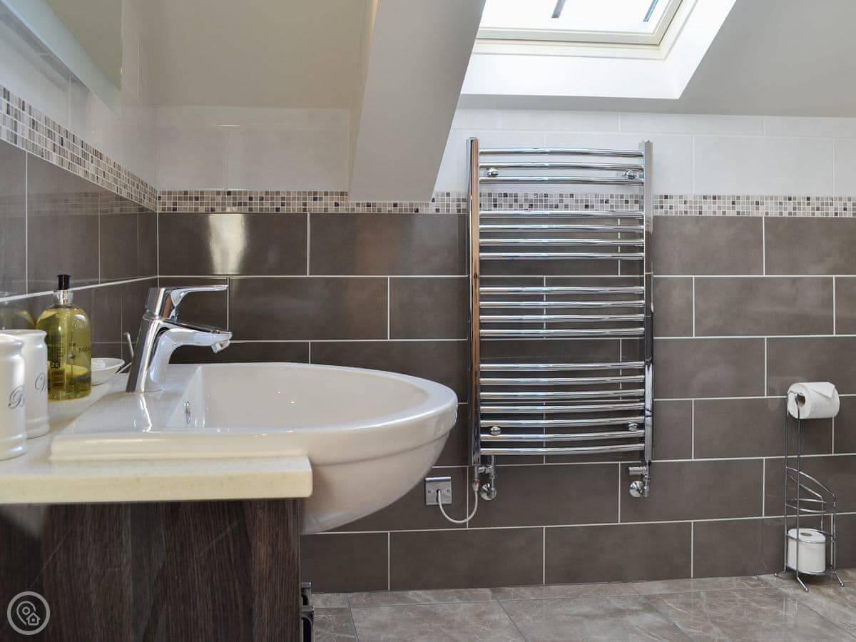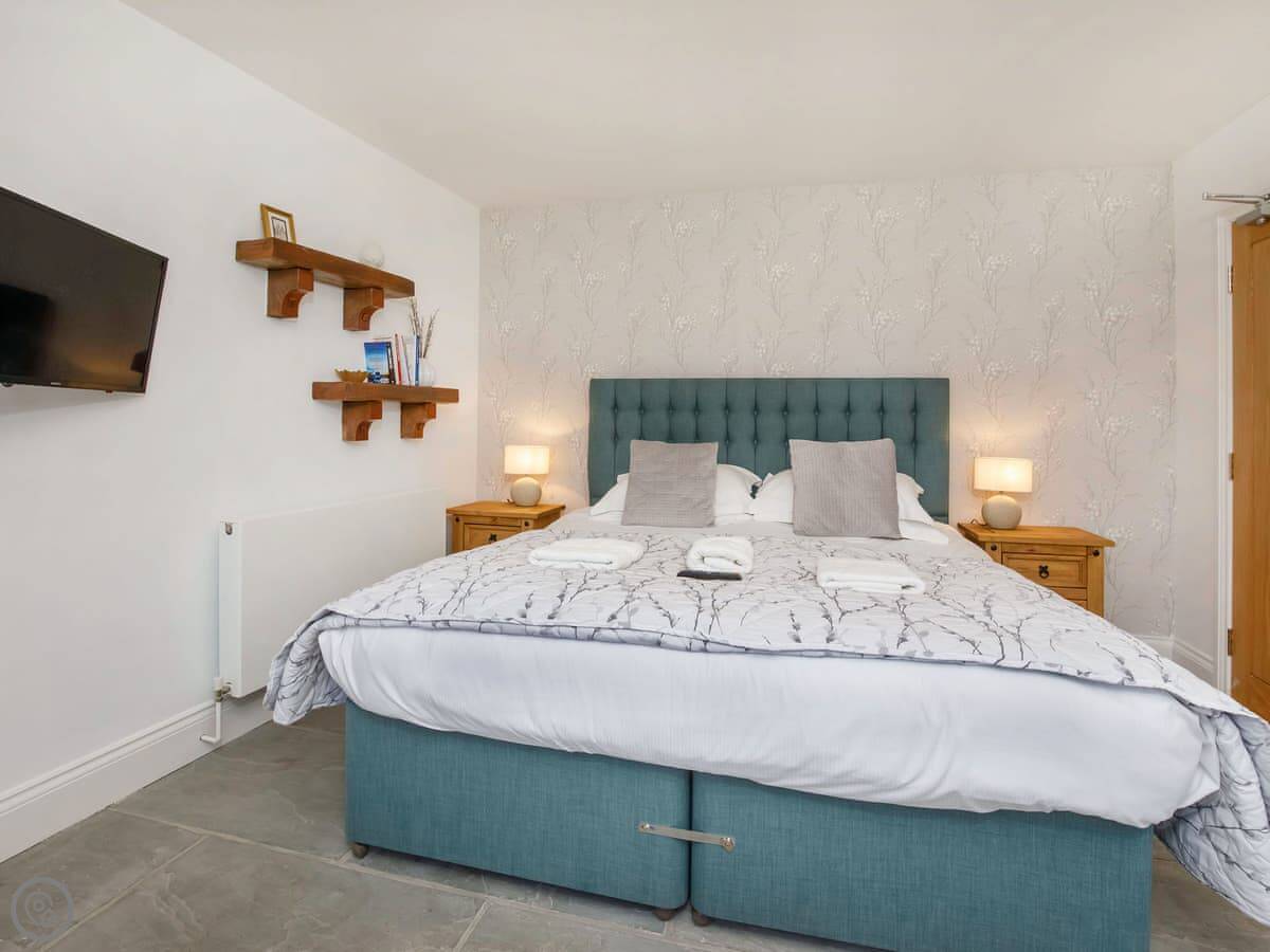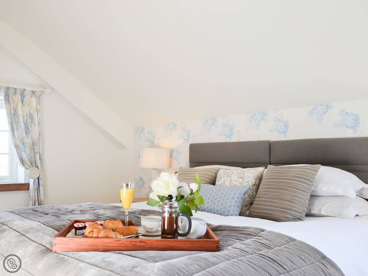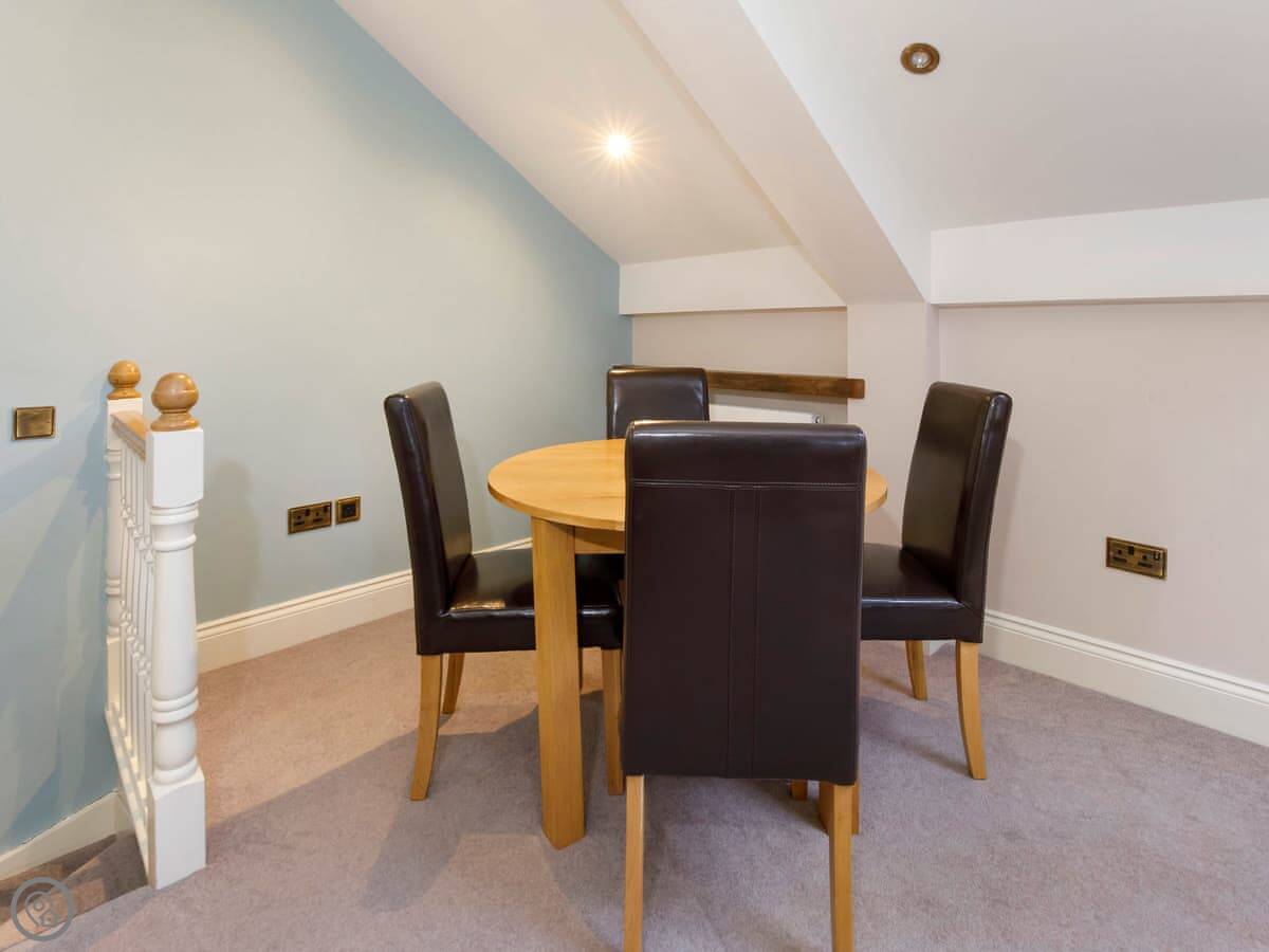 It sleeps six, with three bedrooms. Two of the bedrooms are downstairs, one super kingsize and one twin. There's a shower room downstairs too. The main living space is upstairs. That's the open plan kitchen, dining and sitting area. It has sloping ceilings and velux windows, so it's bright. There's a Juliet balcony. The kitchen has granite worktops and a Belfast sink. The third bedroom, a kingsize, is also upstairs, along with the main shower room.