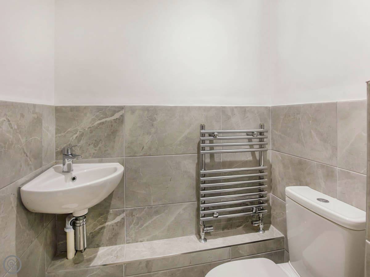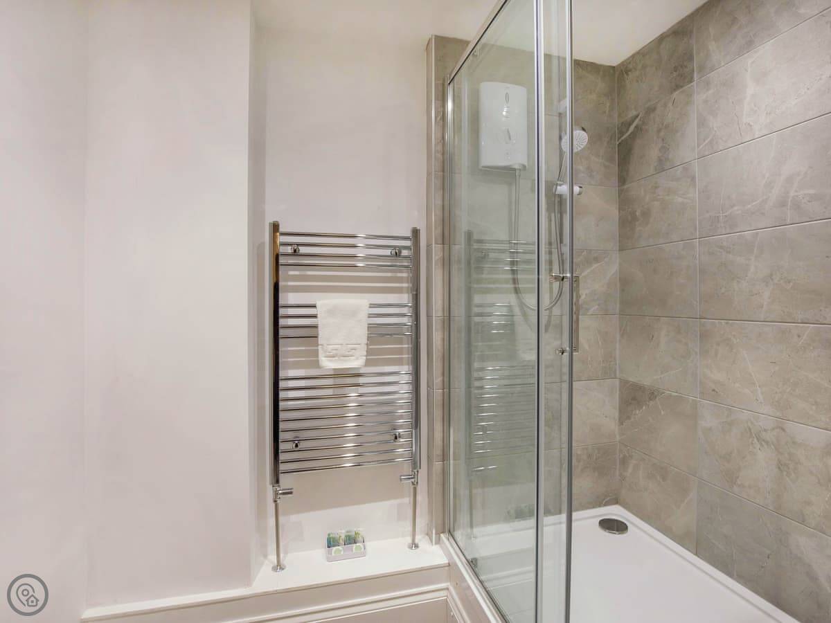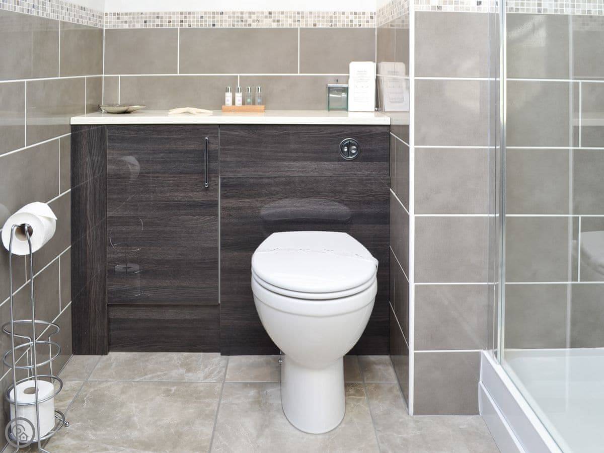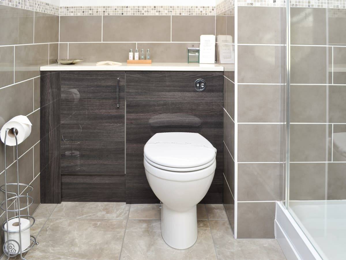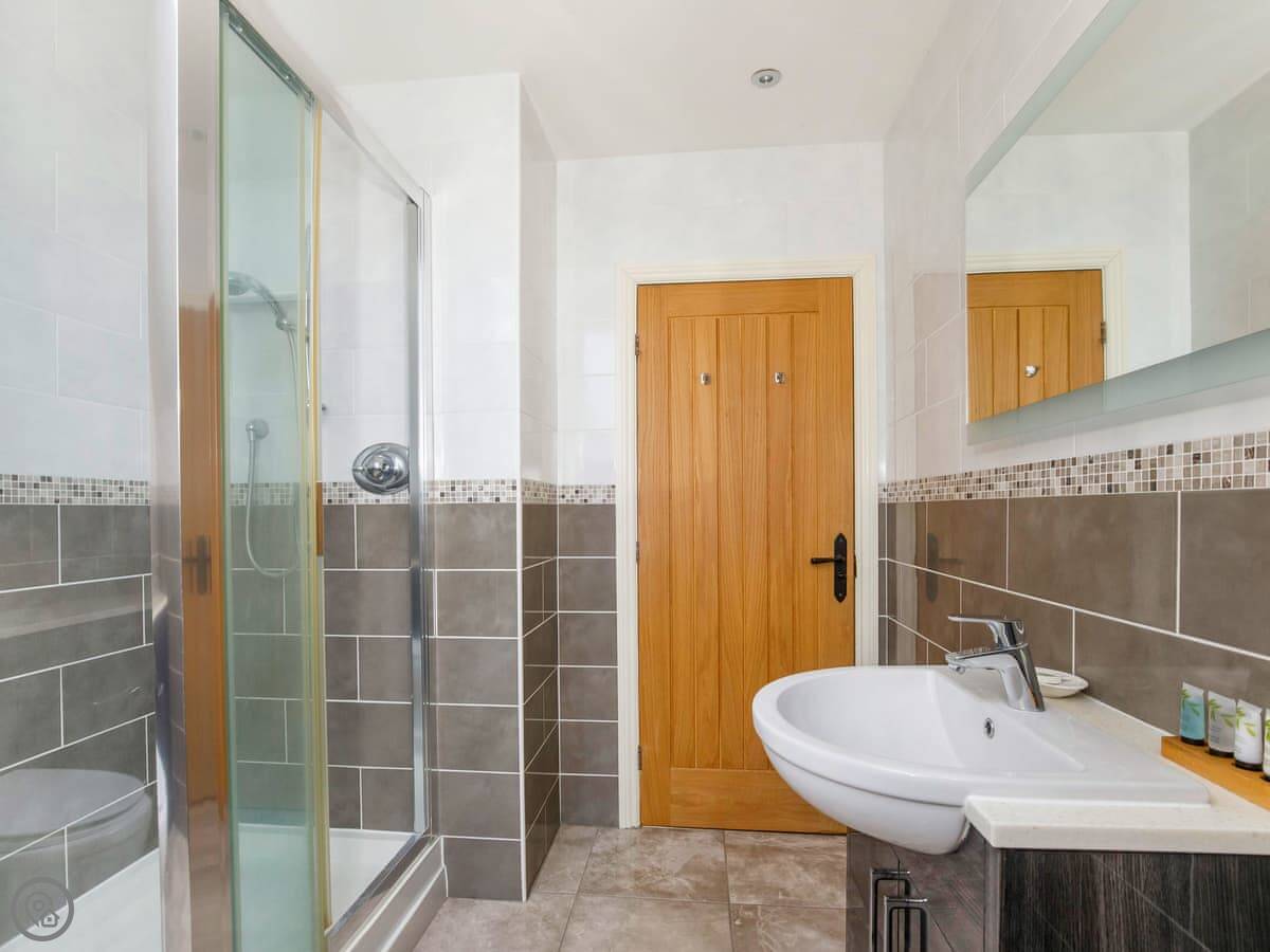 It sleeps six, with three bedrooms. Two of the bedrooms are downstairs, one super kingsize and one twin. There's a shower room downstairs too. The main living space is upstairs. That's the open plan kitchen, dining and sitting area. It has sloping ceilings and velux windows, so it's bright. There's a Juliet balcony. The kitchen has granite worktops and a Belfast sink. The third bedroom, a kingsize, is also upstairs, along with the main shower room.