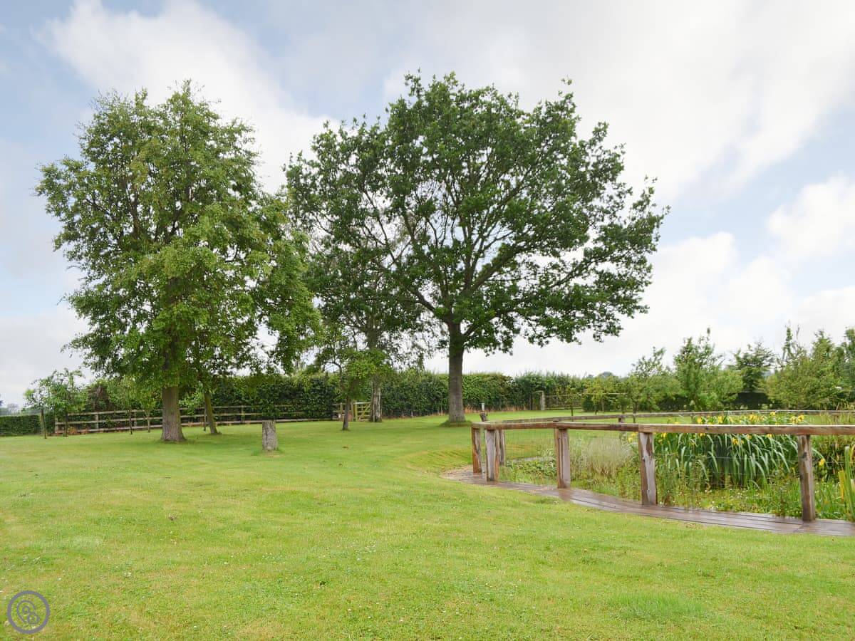 Outside, there's a large enclosed garden shared between all the cottages. It has paths, a wooded bit, a summerhouse and a central pond. The pond is fenced off. The courtyard has a koi pond.