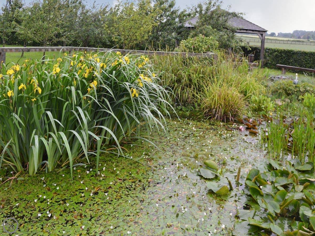 The garden is large and enclosed, but it's shared between all the cottages. There's a summerhouse, some paths, and a pond that's fenced off. There's also a courtyard with seating and a koi pond where you can sit.
