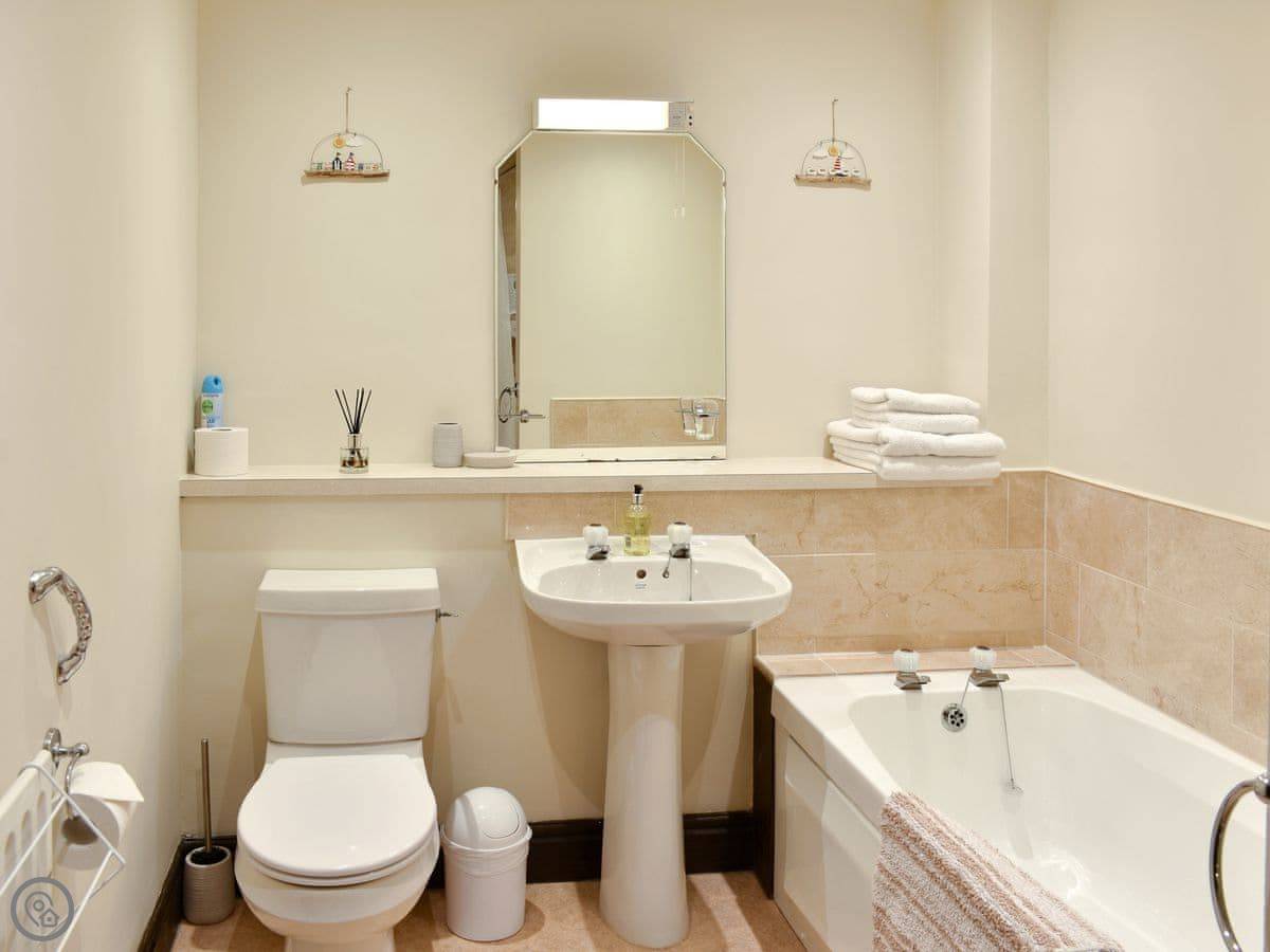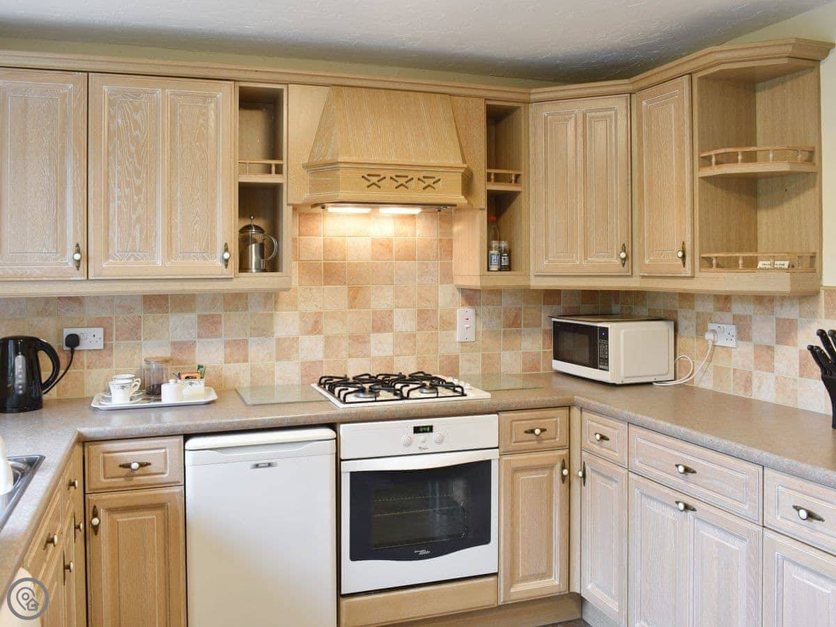 It’s got a three-star rating. That means it’s comfortable and clean, but not luxury. One bedroom, one bathroom with a shower. The kitchen has what you need, including a dishwasher and washing machine.